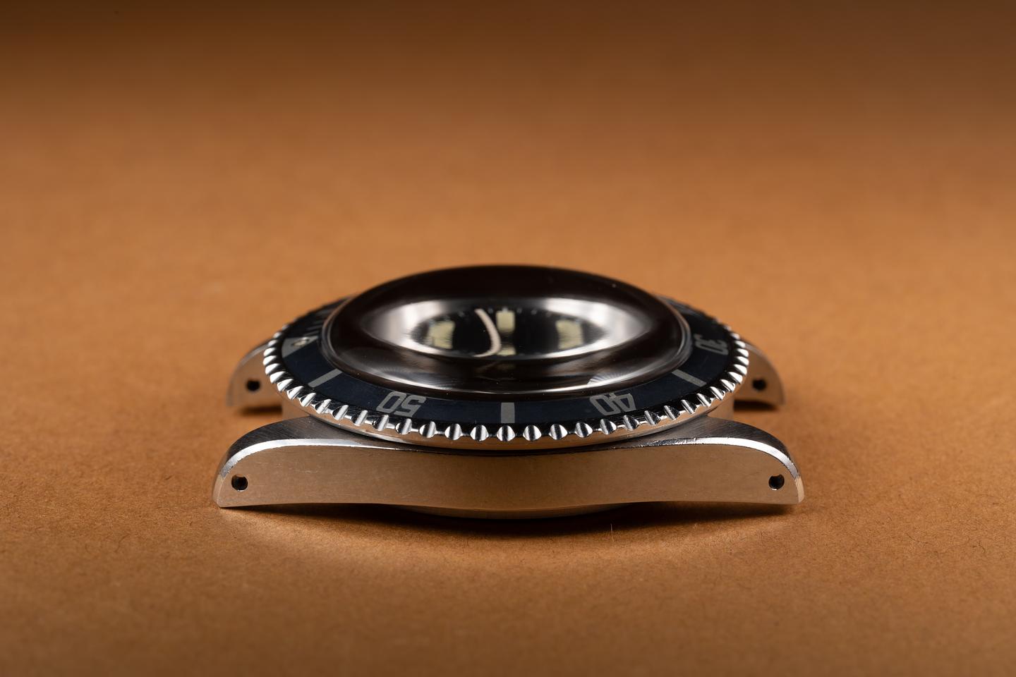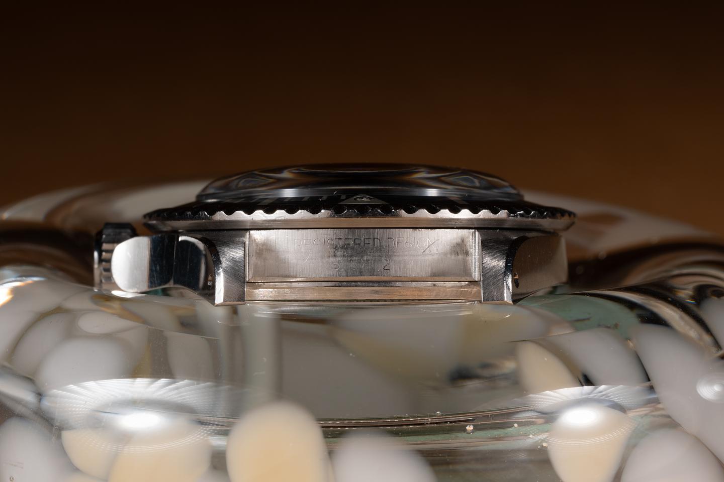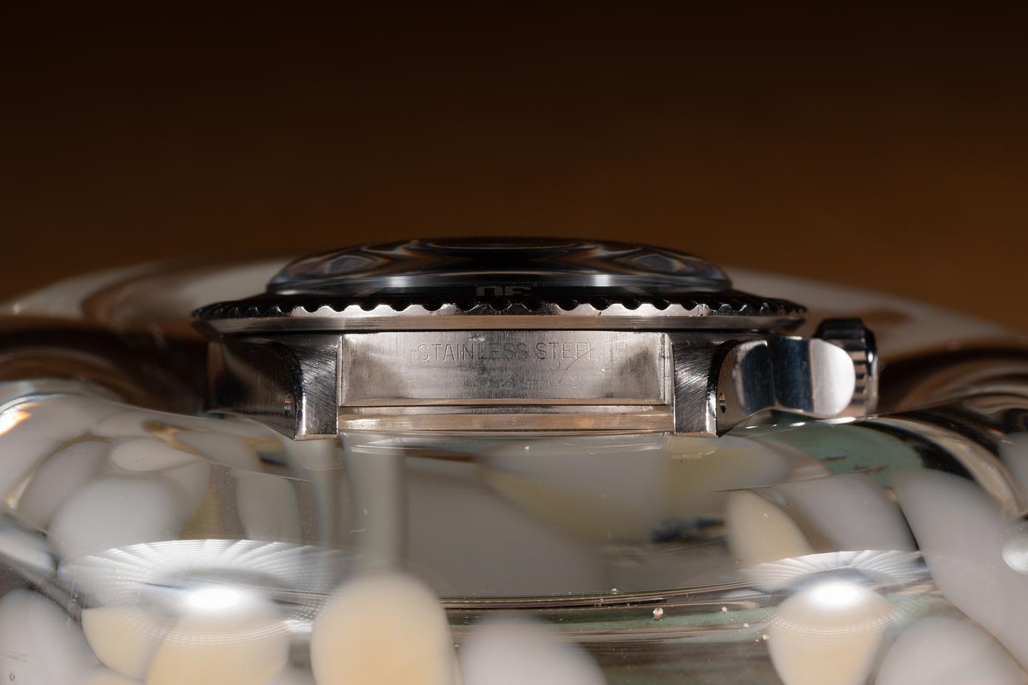 Case: The recently polished case is excellent showing sharp prominent bevels and only light wear from use. The fat font kissing 40 bezel insert is also in excellent condition and has faded to a medium silvery grey tone.
