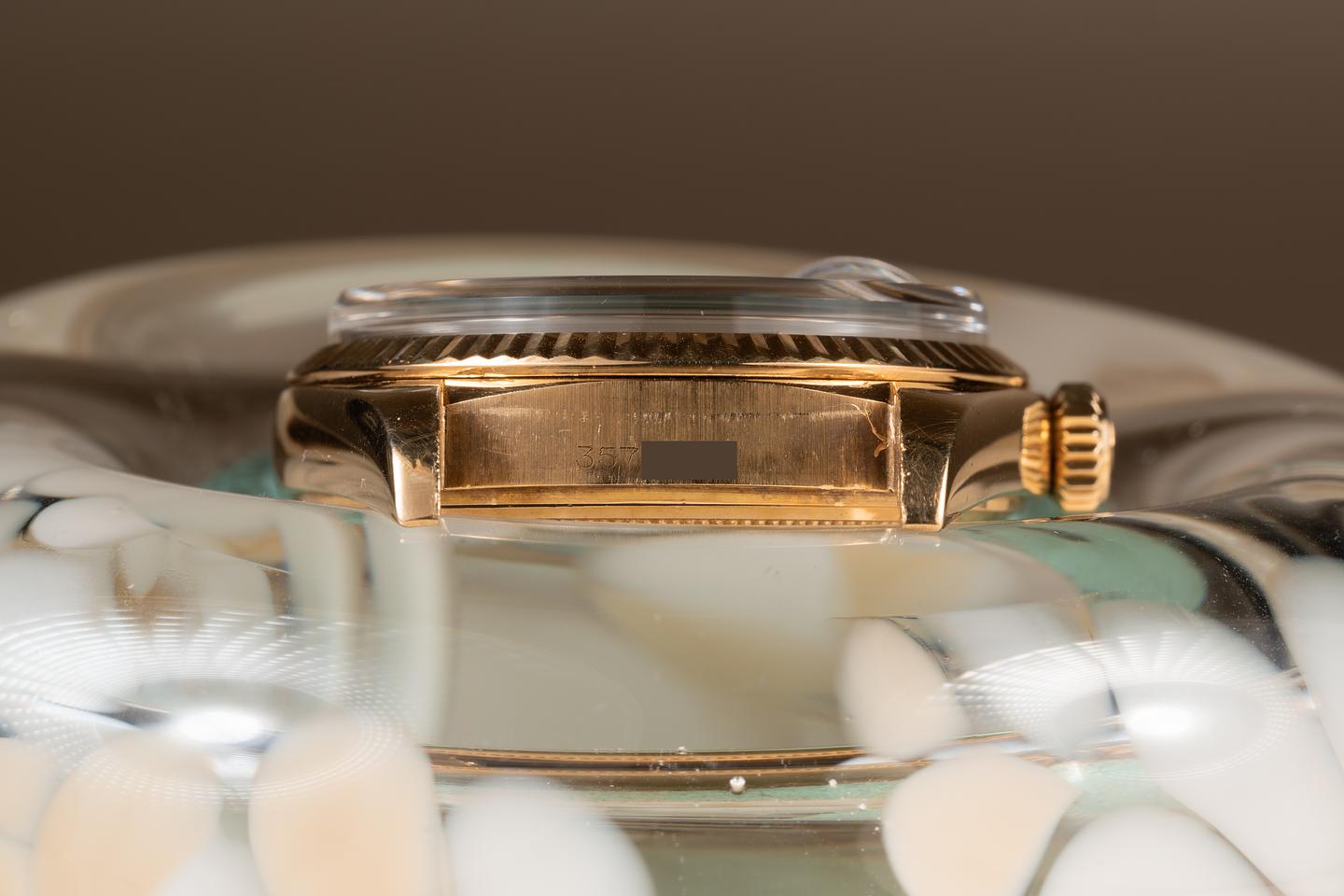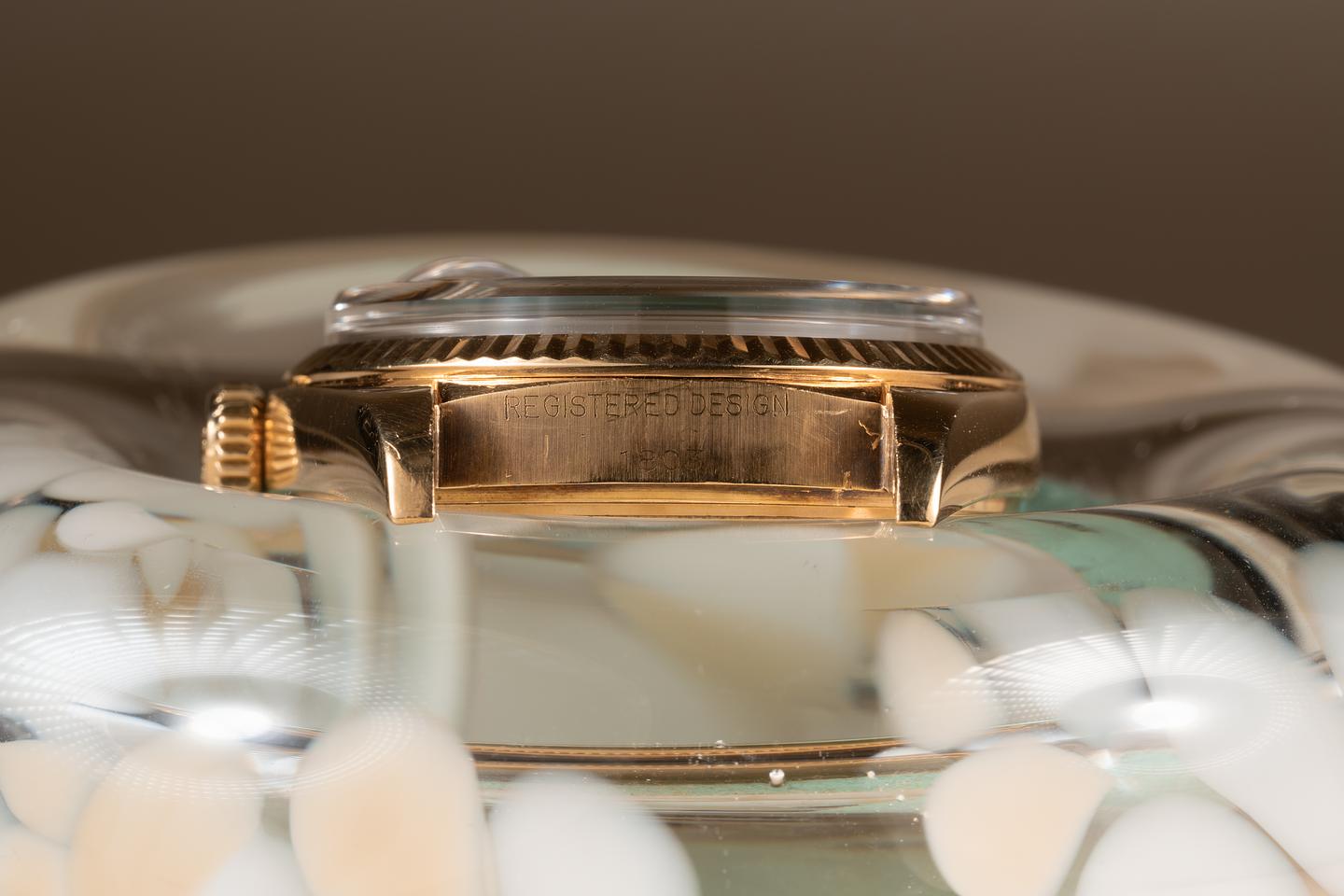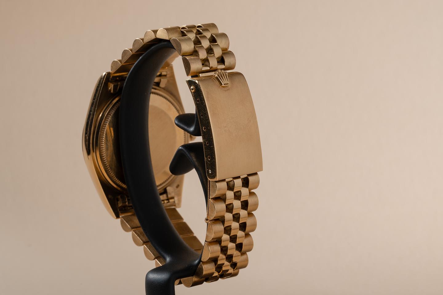 Bracelet: The 18 link 18K yellow gold jubilee bracelet is excellent showing only very light stretch for its age. The clasp is stamped with a 1970 date code. The bracelet will fit between a (14.6 cm / 5.7") to a (17.3 cm / 6.8" wrist).