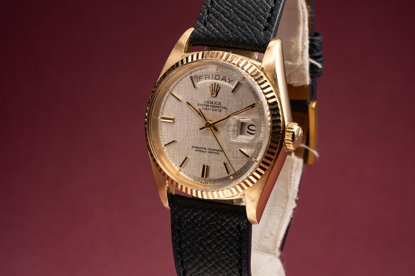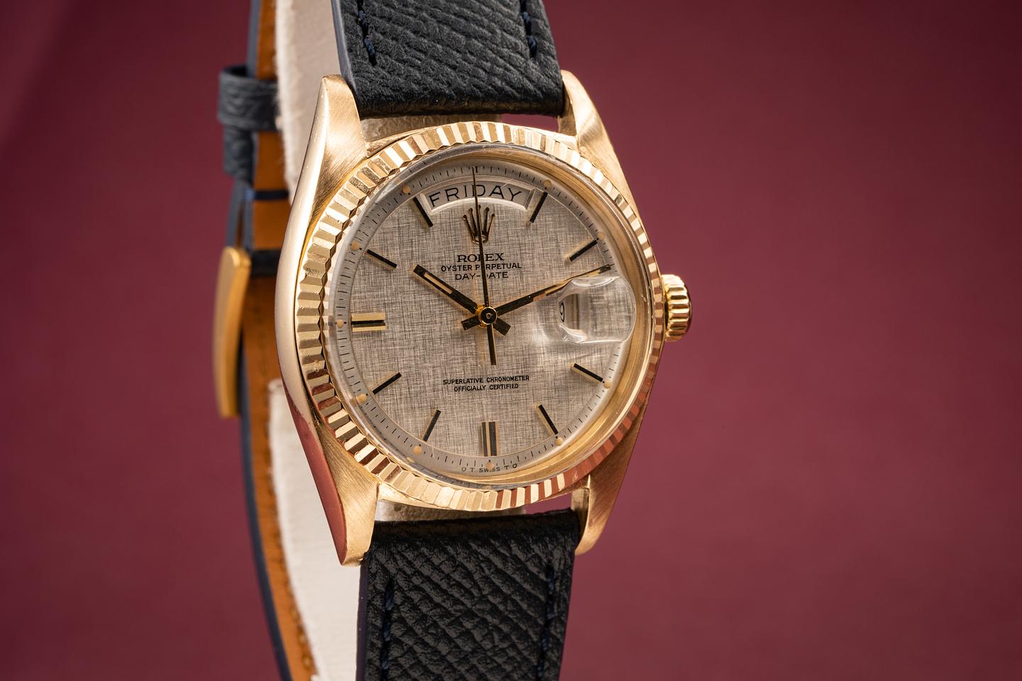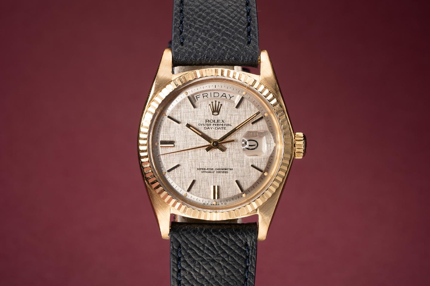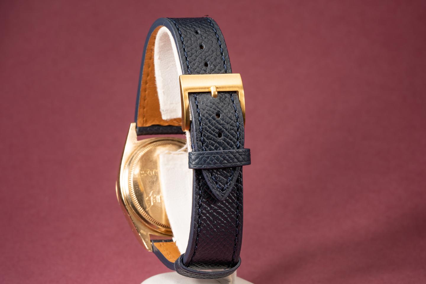 Dial: Super clean silver linen dial with gold and black enamel markers. All the lume is present and intact and has turned a warm sandy hue. The hands are matching.