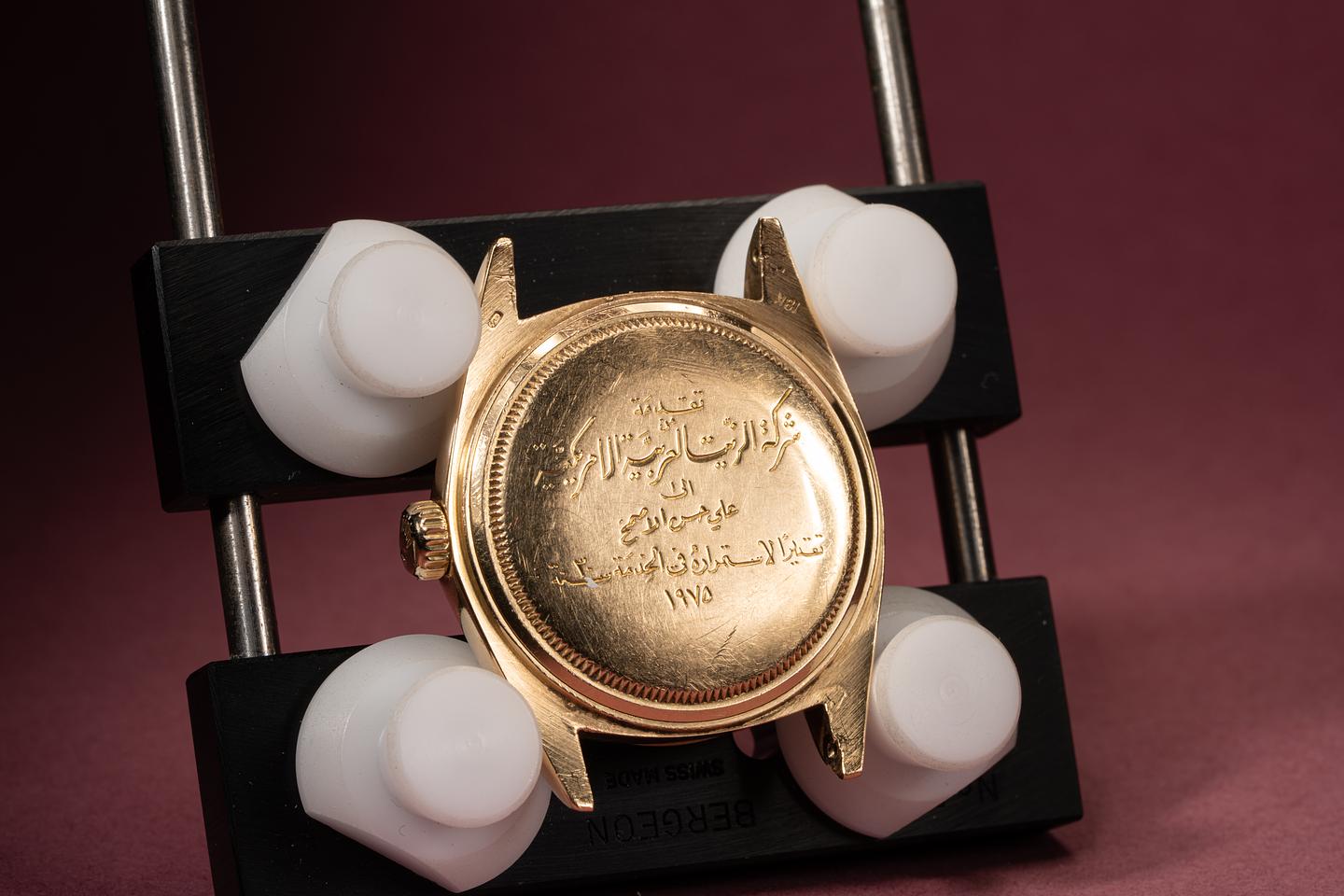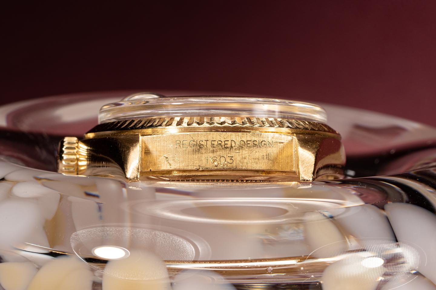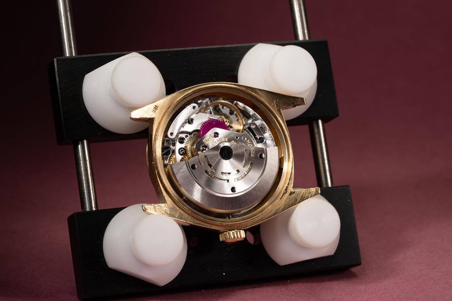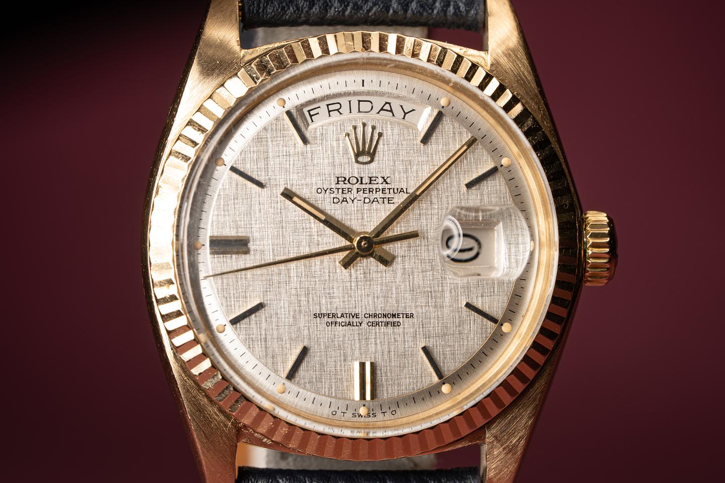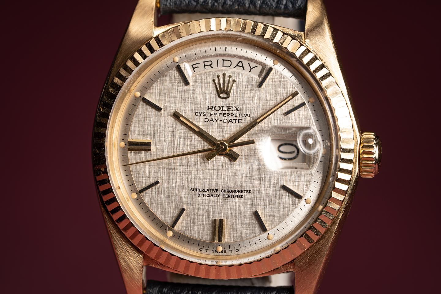 Dial: Super clean silver linen dial with gold and black enamel markers. All the lume is present and intact and has turned a warm sandy hue. The hands are matching.