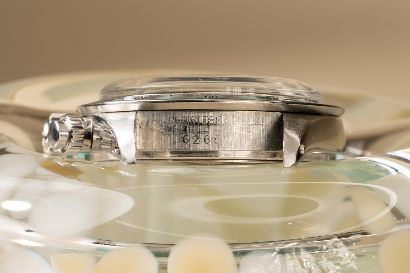 Dial: The bright clean silver dial shows little if any wear. This rarely seen dial variations has the Sigma symbol printed below the min markers and the 2 symbols peak out on the very bottom of the dial. The lume has aged to a clean creamy hue and it appears that all of the lume plots are present and intact. The hands match the dial perfectly. All lume glows brightly when exposed to UV and falls off rapidly at the same rate.