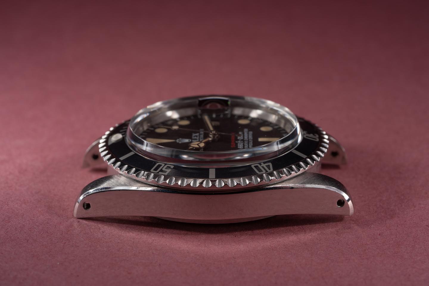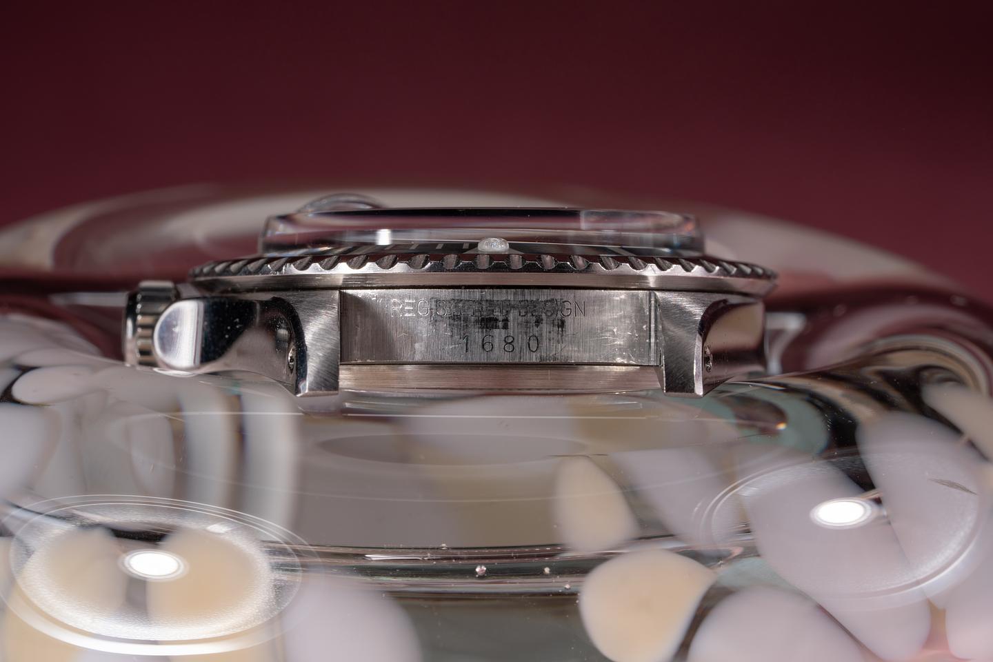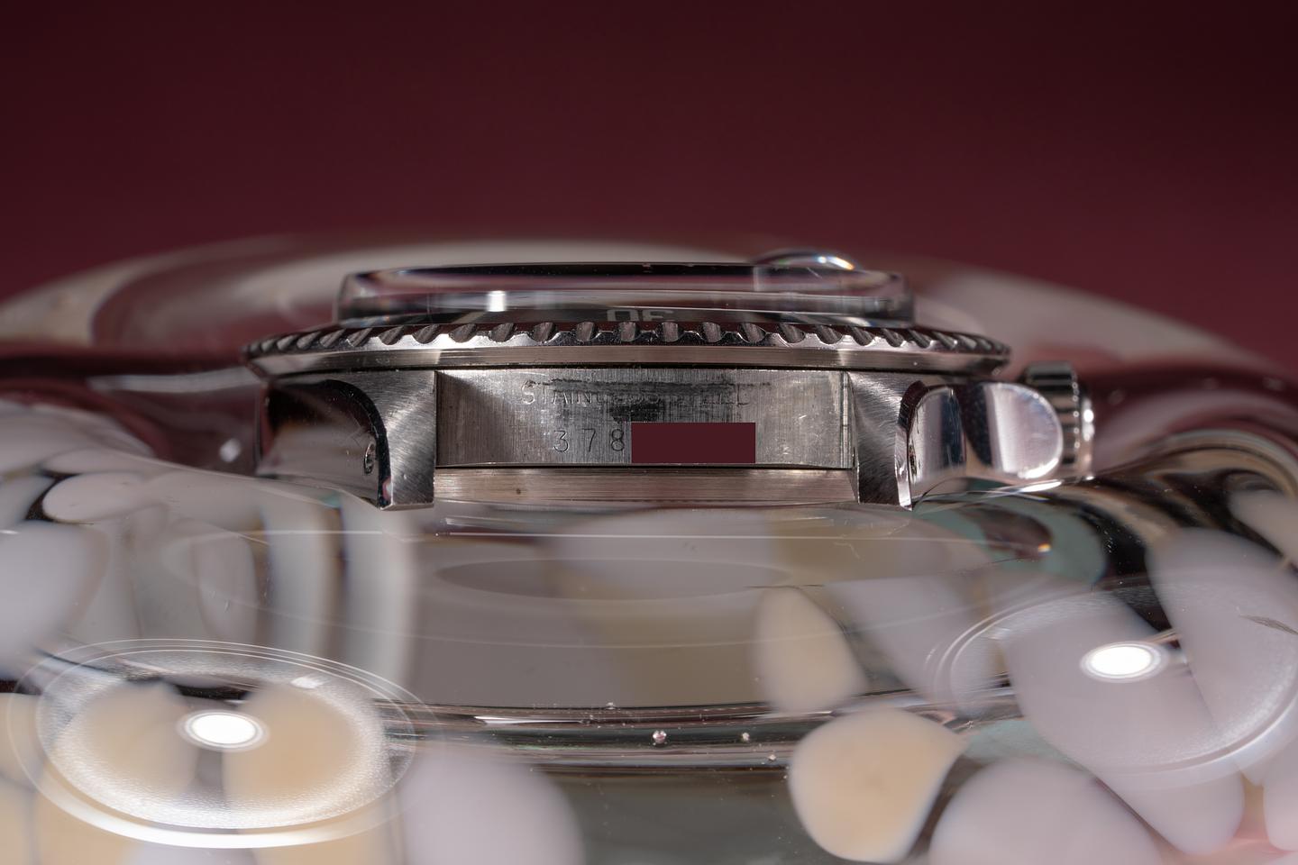 Case: The recently polished case is excellent showing sharp, wide, prominent bevels and only very light wear from use. The bezel insert is also in excellent condition and has faded to a silvery lavender grey hue.