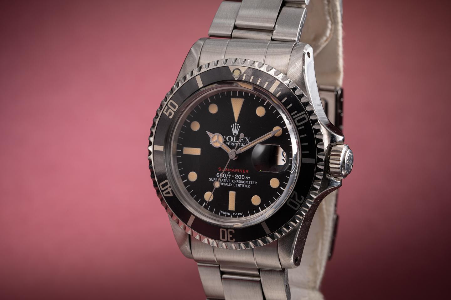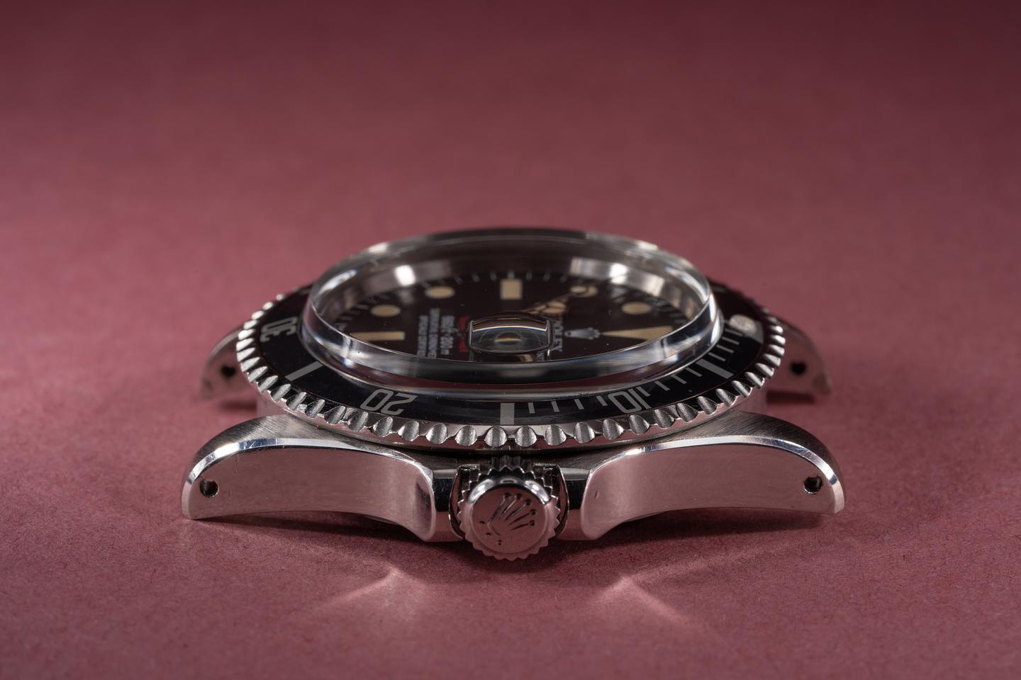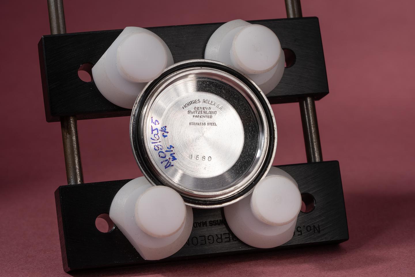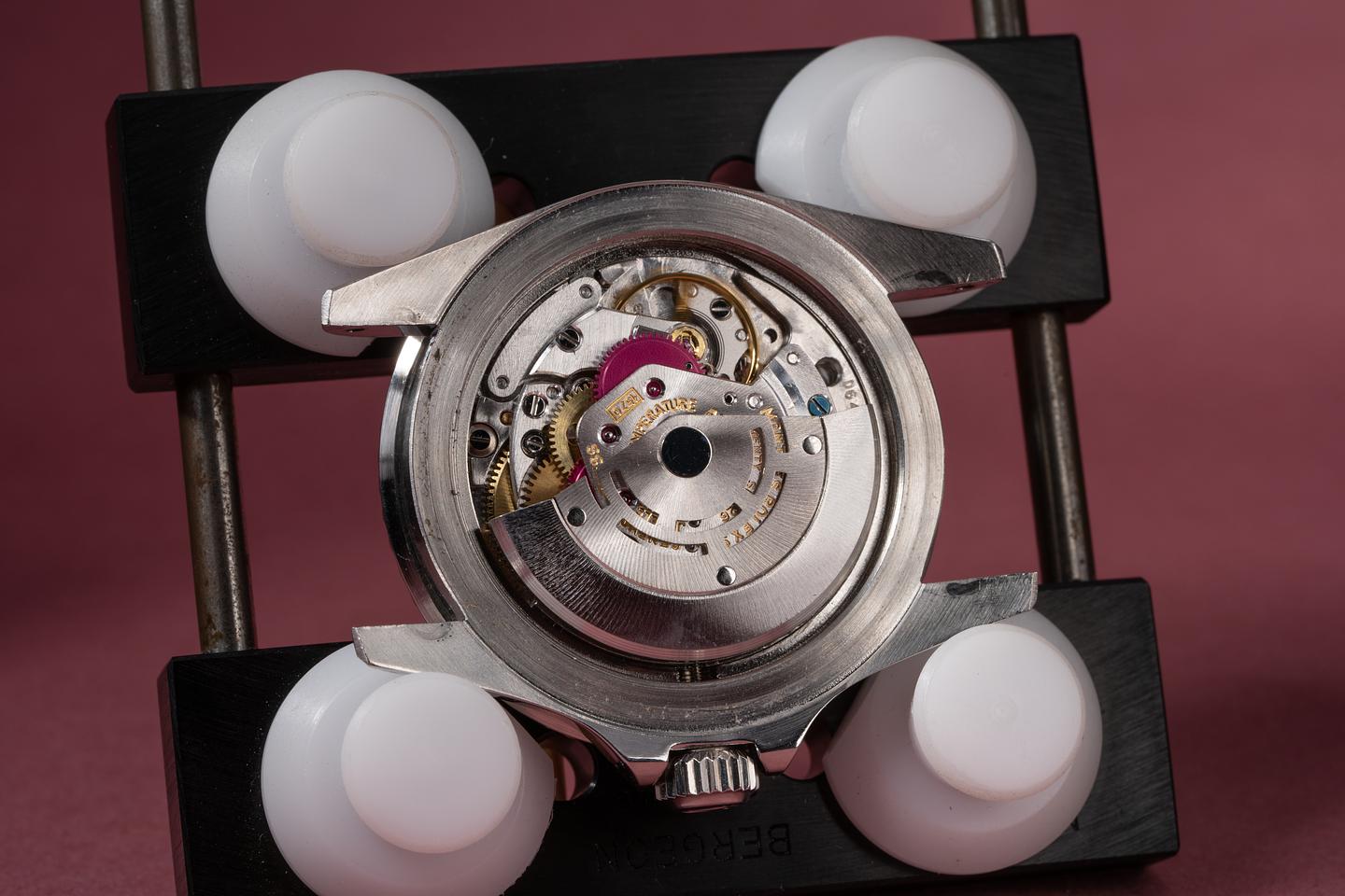 Case: The recently polished case is excellent showing sharp, wide, prominent bevels and only very light wear from use. The bezel insert is also in excellent condition and has faded to a silvery lavender grey hue.