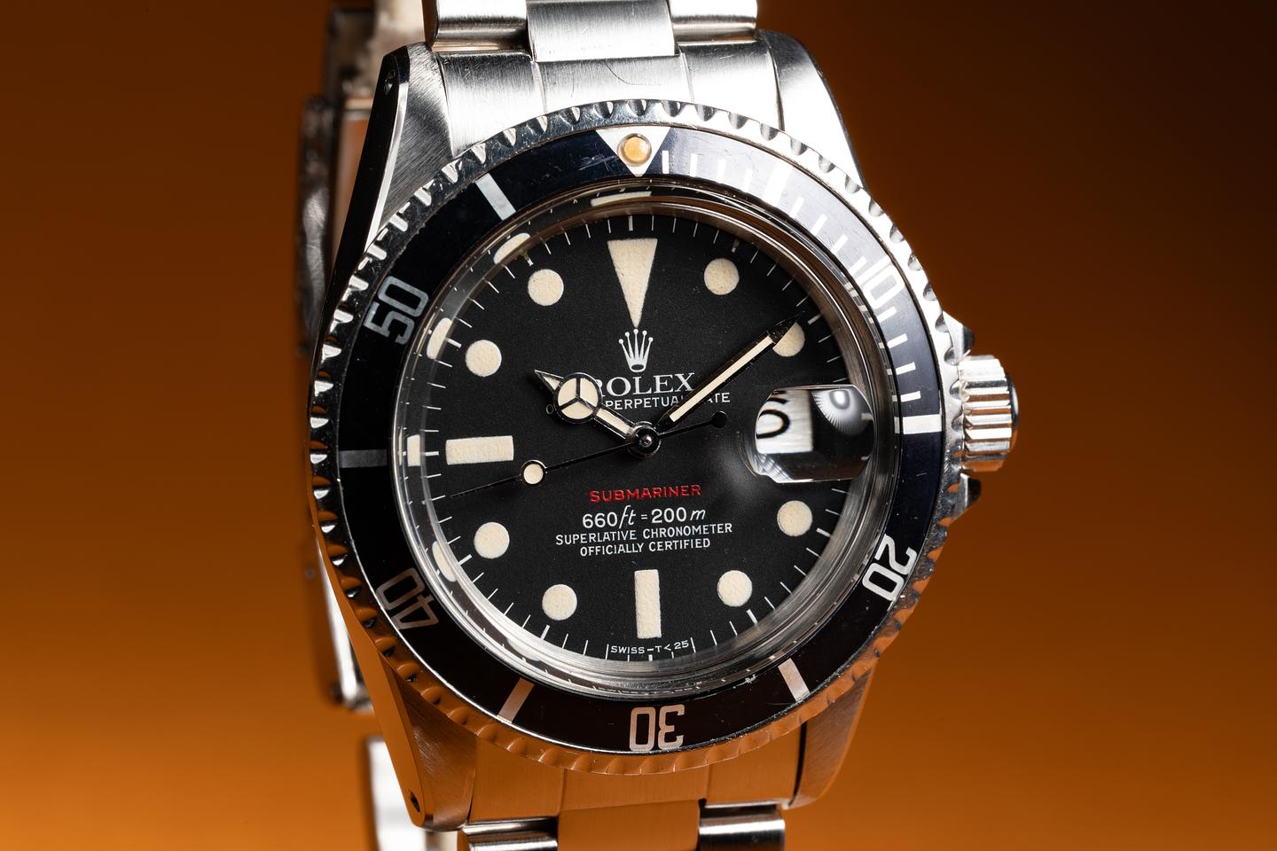 Dial: The matte black MK 6 dial is very good showing only light wear overall. There is some chipping present on the outer edge of the dial between the 11 and 12 o'clock markers. The lune has a ged to a warm creamy hue and the hands have been relumed and color matched to the dial.