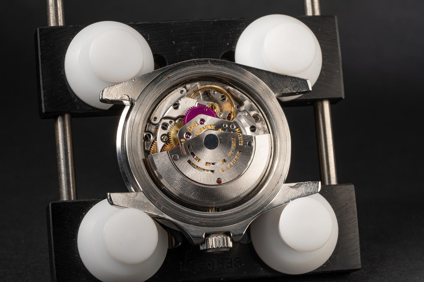 Case: The thick case is excellent and shows some wear from use. The bezel insert is also in excellent condition and has faded to a medium satin ghost grey tone. The sliver indexes are warming to a very light brassy tone.