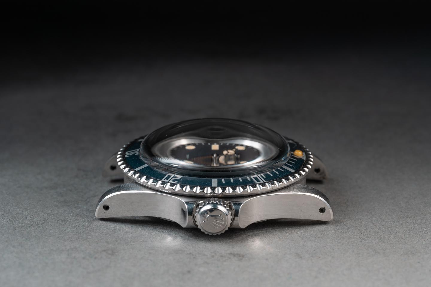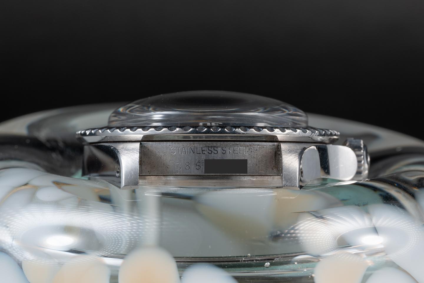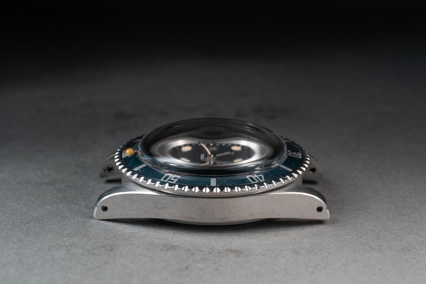 Case: The thick and even case has been polished in the past showing sharp prominent bevels and only light wear from use. The bezel insert is also in excellent condition and has aged to a medium silvery blue showing only light wear from use. The intact pearl has aged to a warm vibrant goldenrod hue. A Sea-Dweller crystal has been fitted to the watch.
