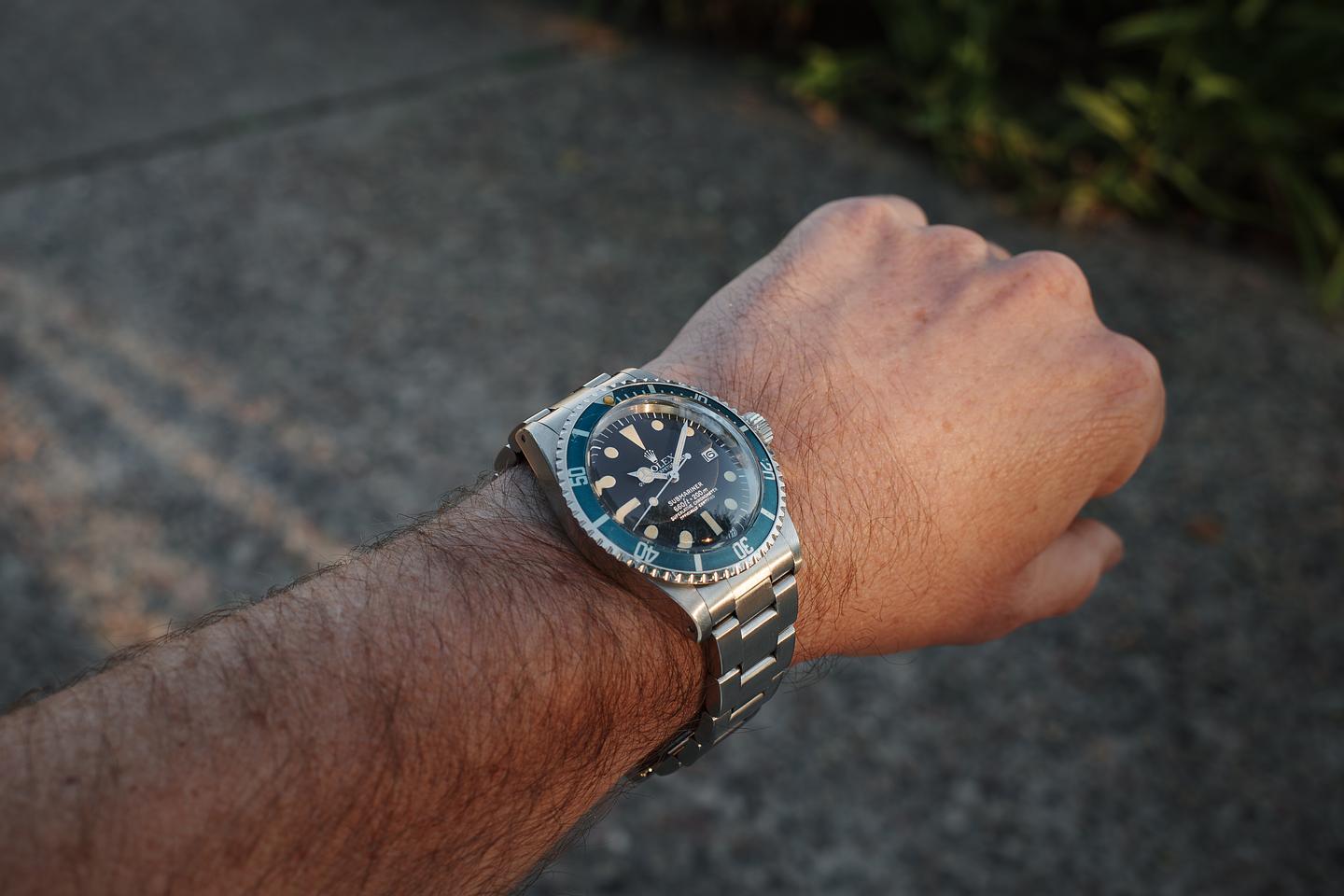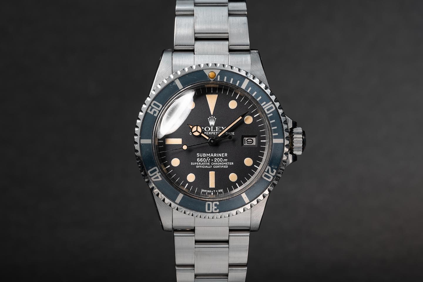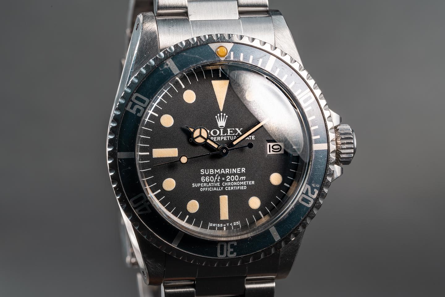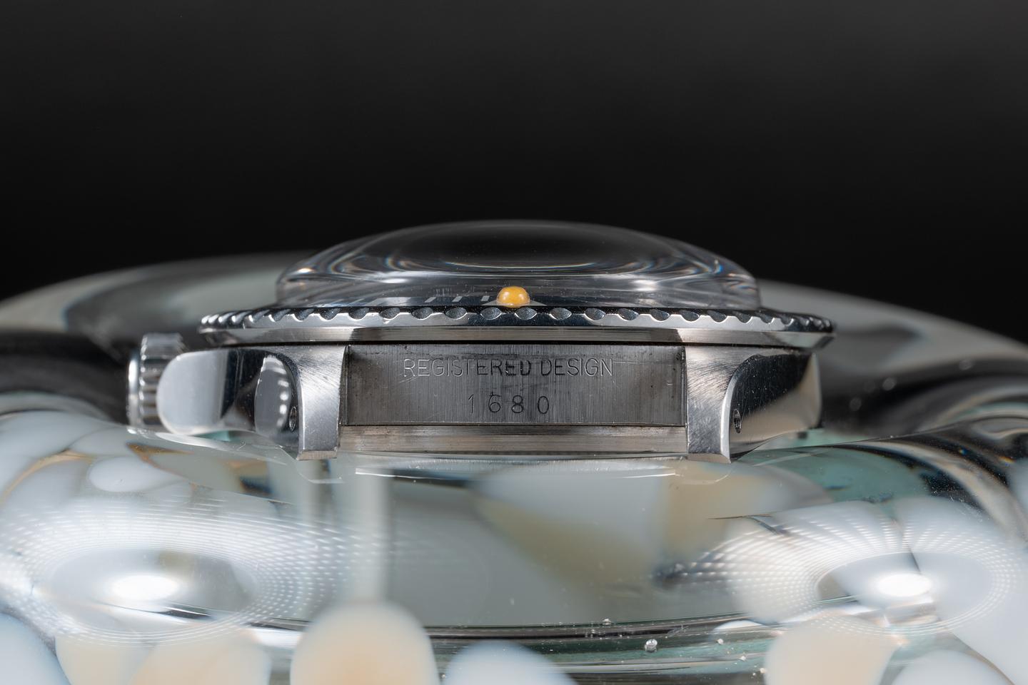 Case: The thick and even case has been polished in the past showing sharp prominent bevels and only light wear from use. The bezel insert is also in excellent condition and has aged to a medium silvery blue showing only light wear from use. The intact pearl has aged to a warm vibrant goldenrod hue. A Sea-Dweller crystal has been fitted to the watch.