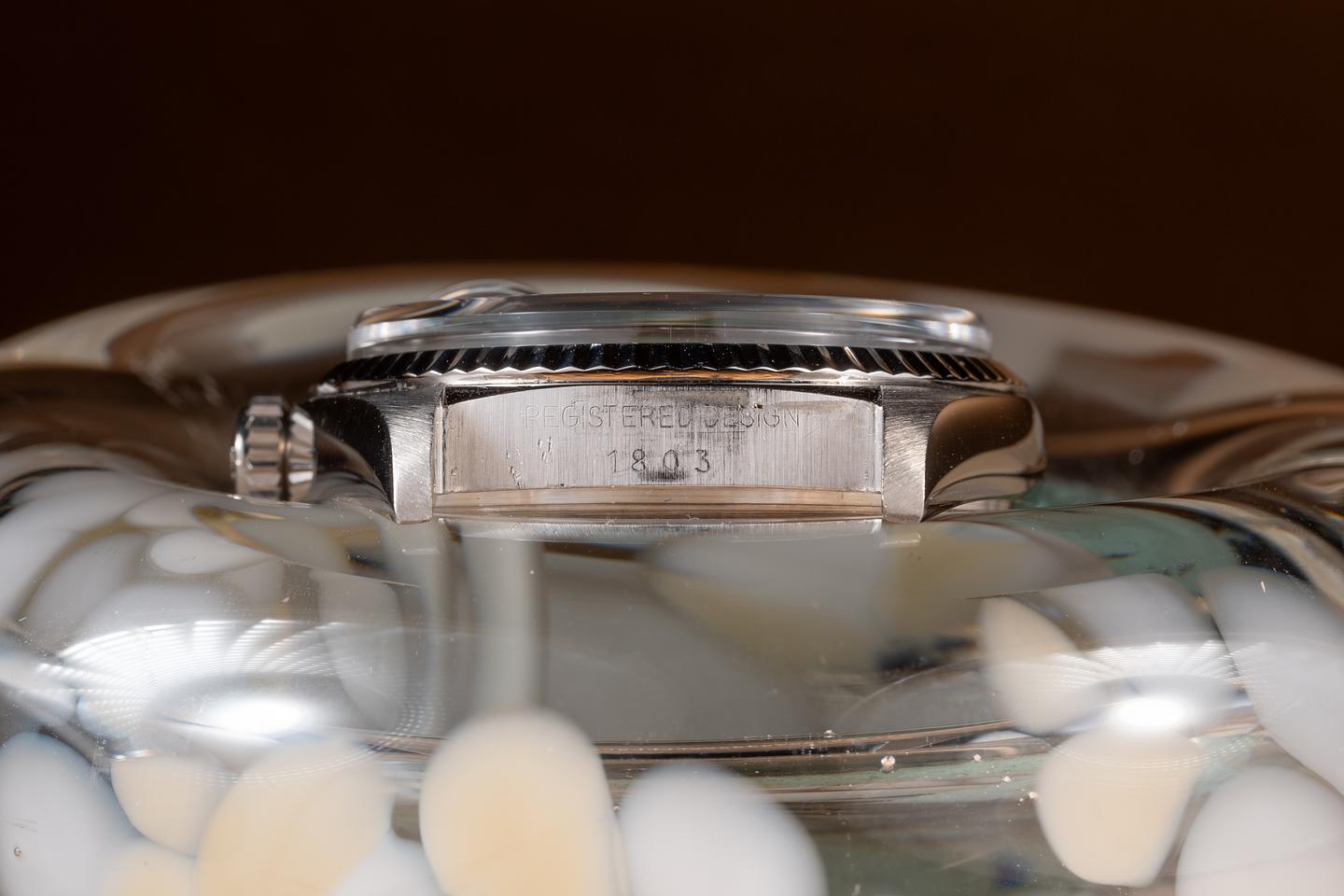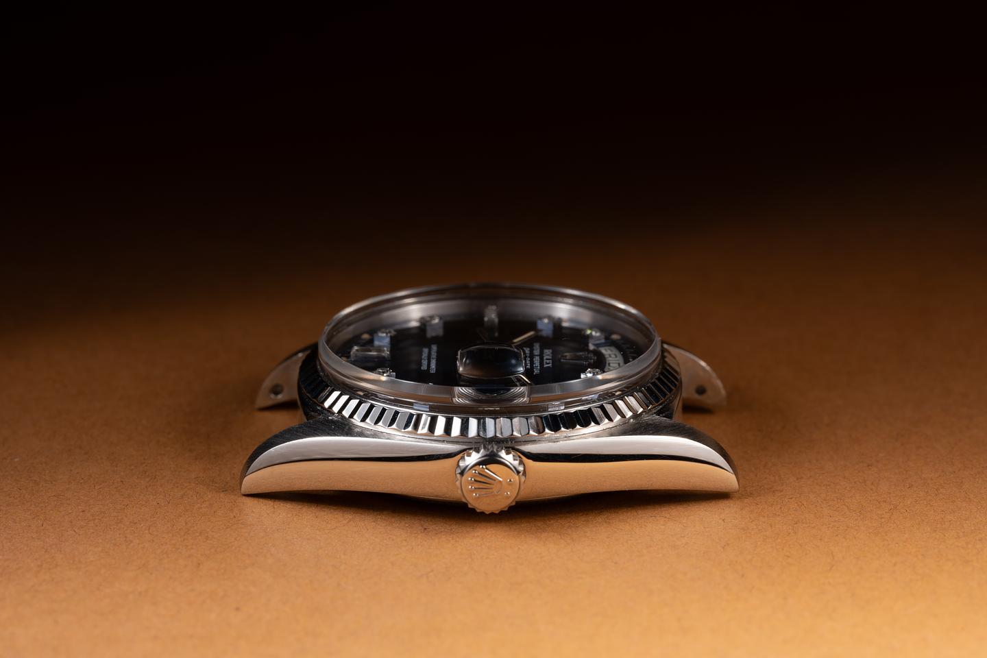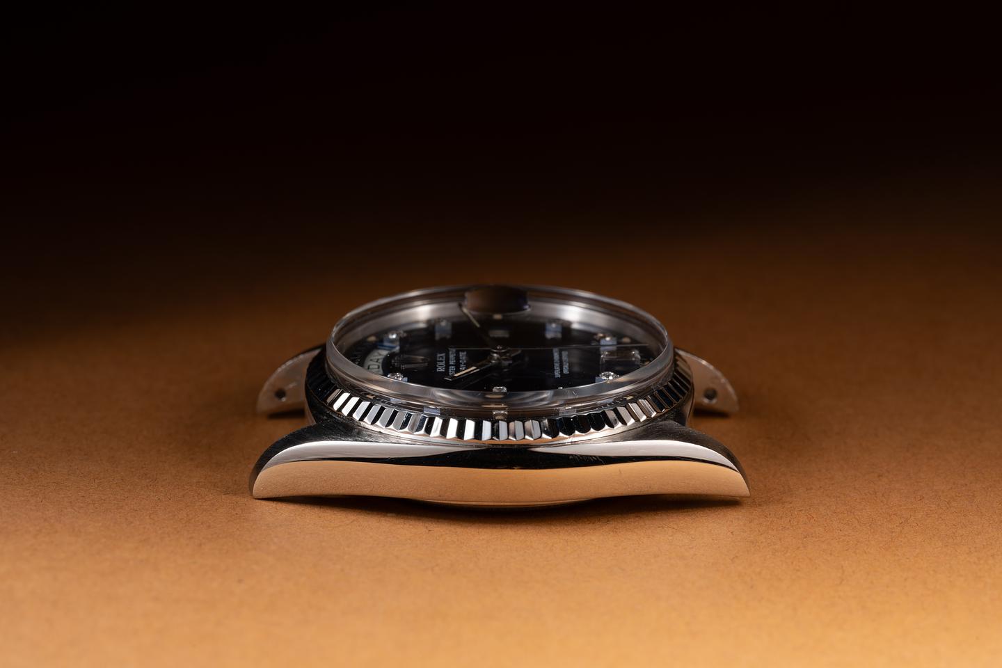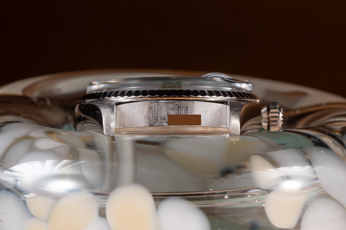 Case: The thick and even 18k white gold case is excellent showing only light wear form use. The 18k white gold fluted bezel is also in excellent condition showing only light wear from use.