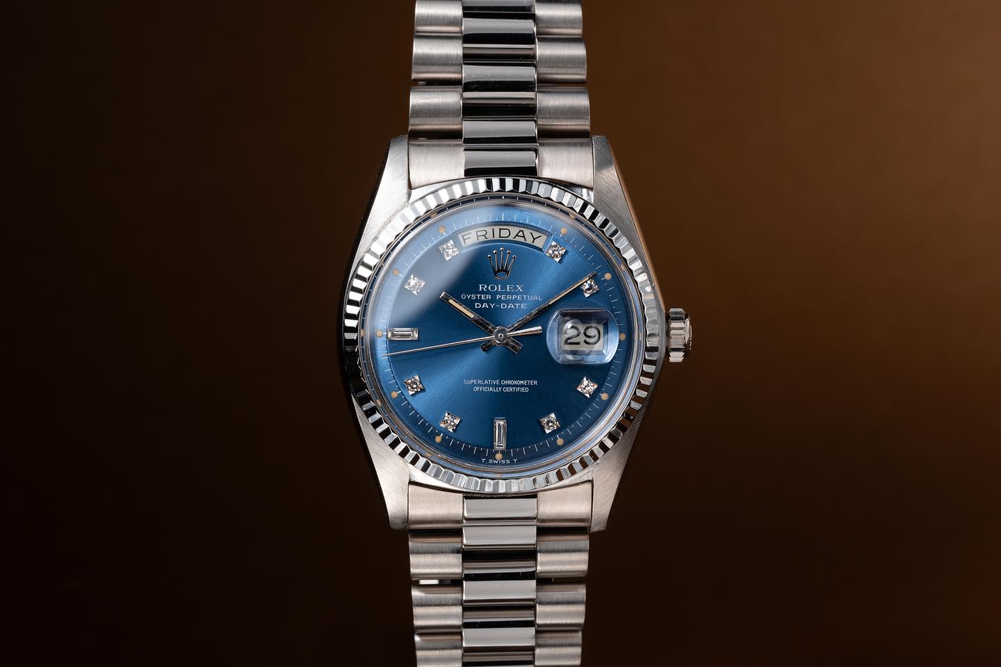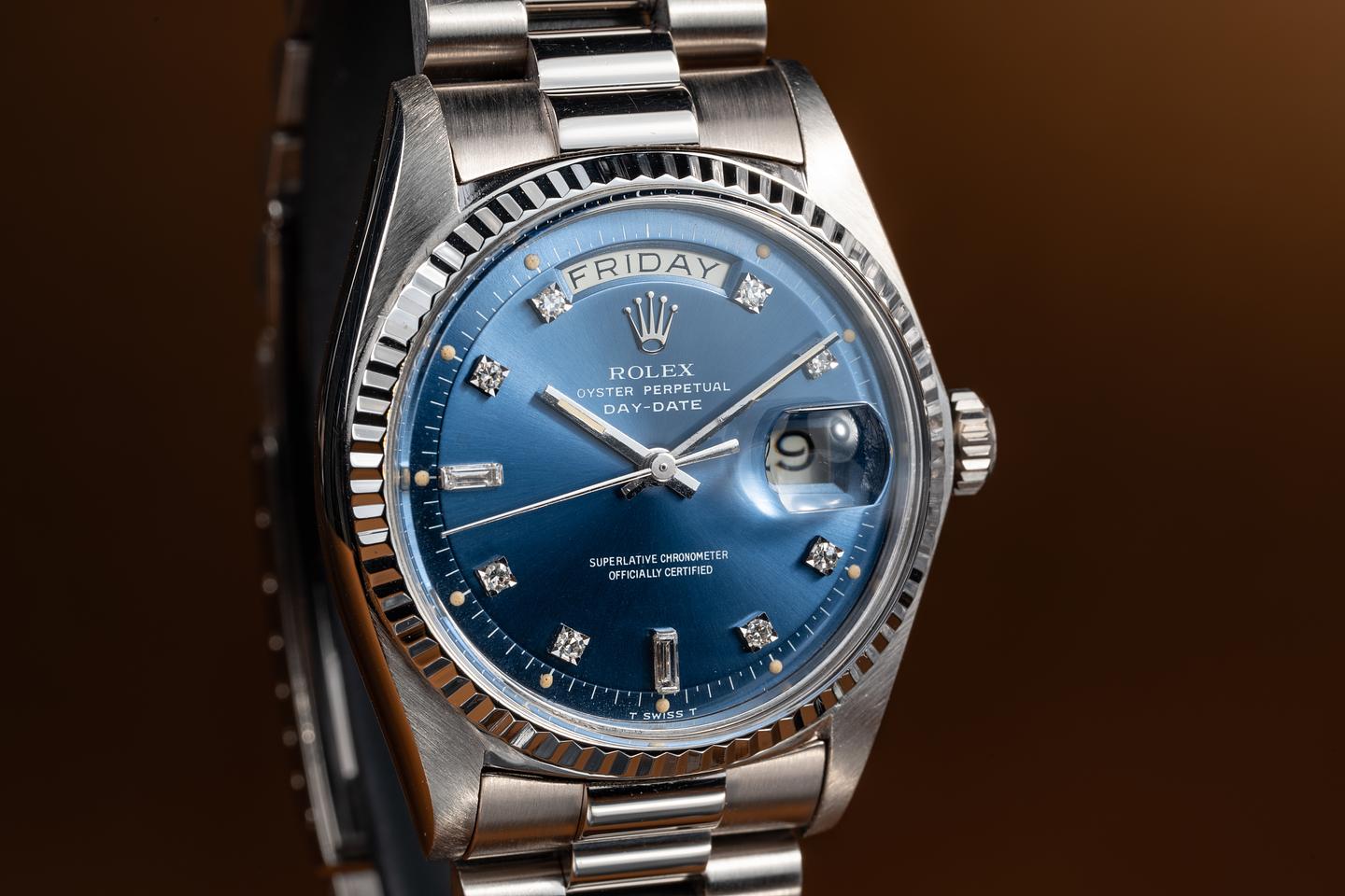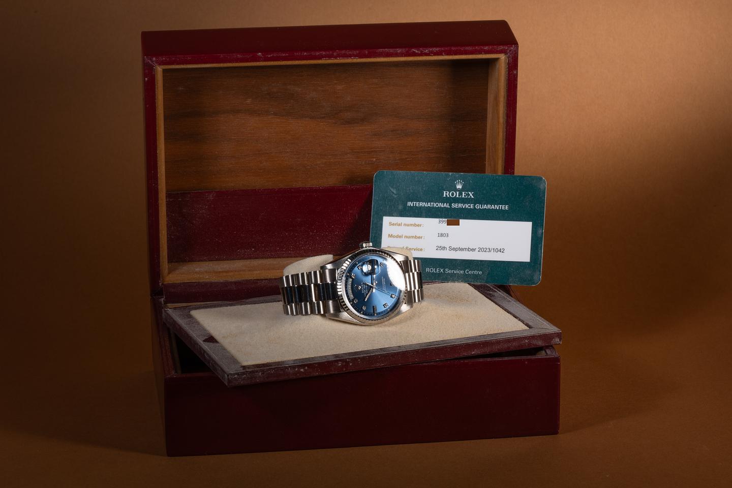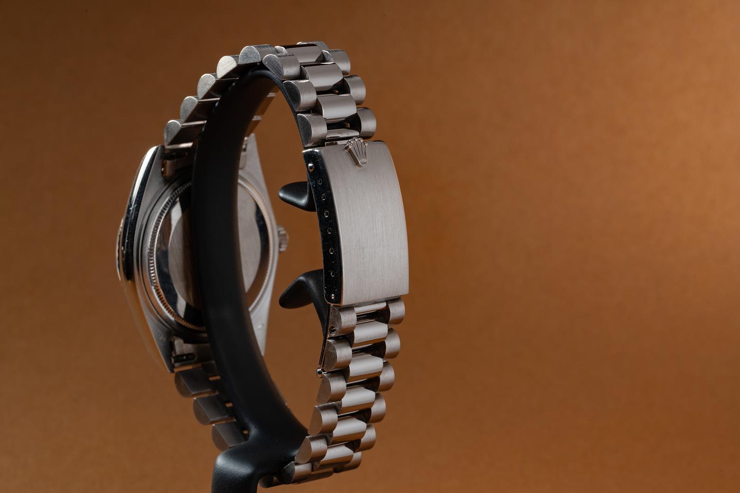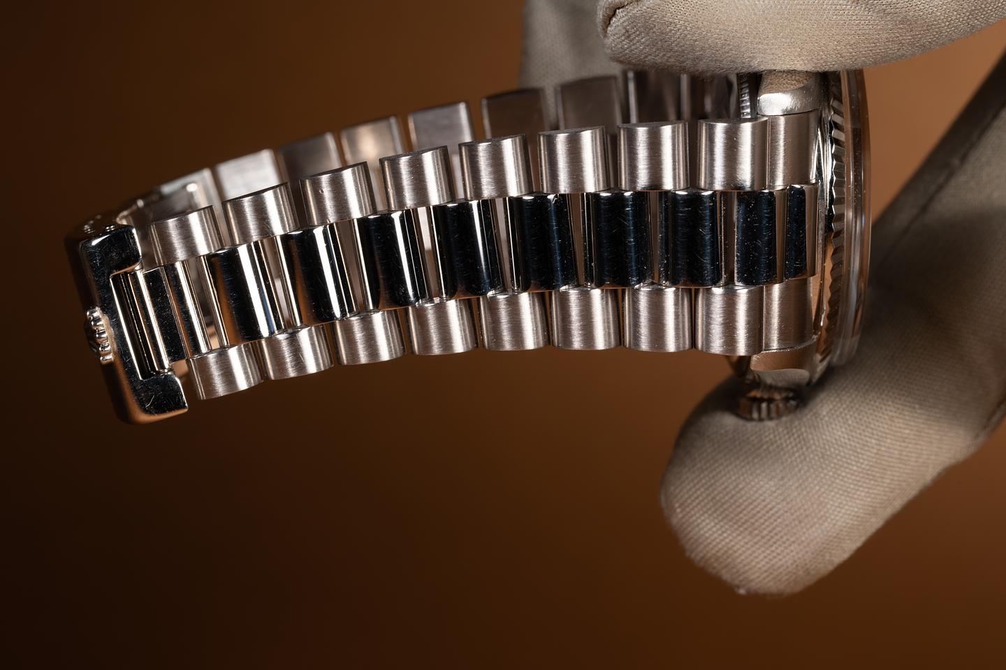 Bracelet: The 19 link 18K white gold President bracelet is excellent showing only very light stretch for its age. The clasp is stamped with a 2003 date code. The bracelet will fit up to a 18.4 cm. / 7.24" wrist.