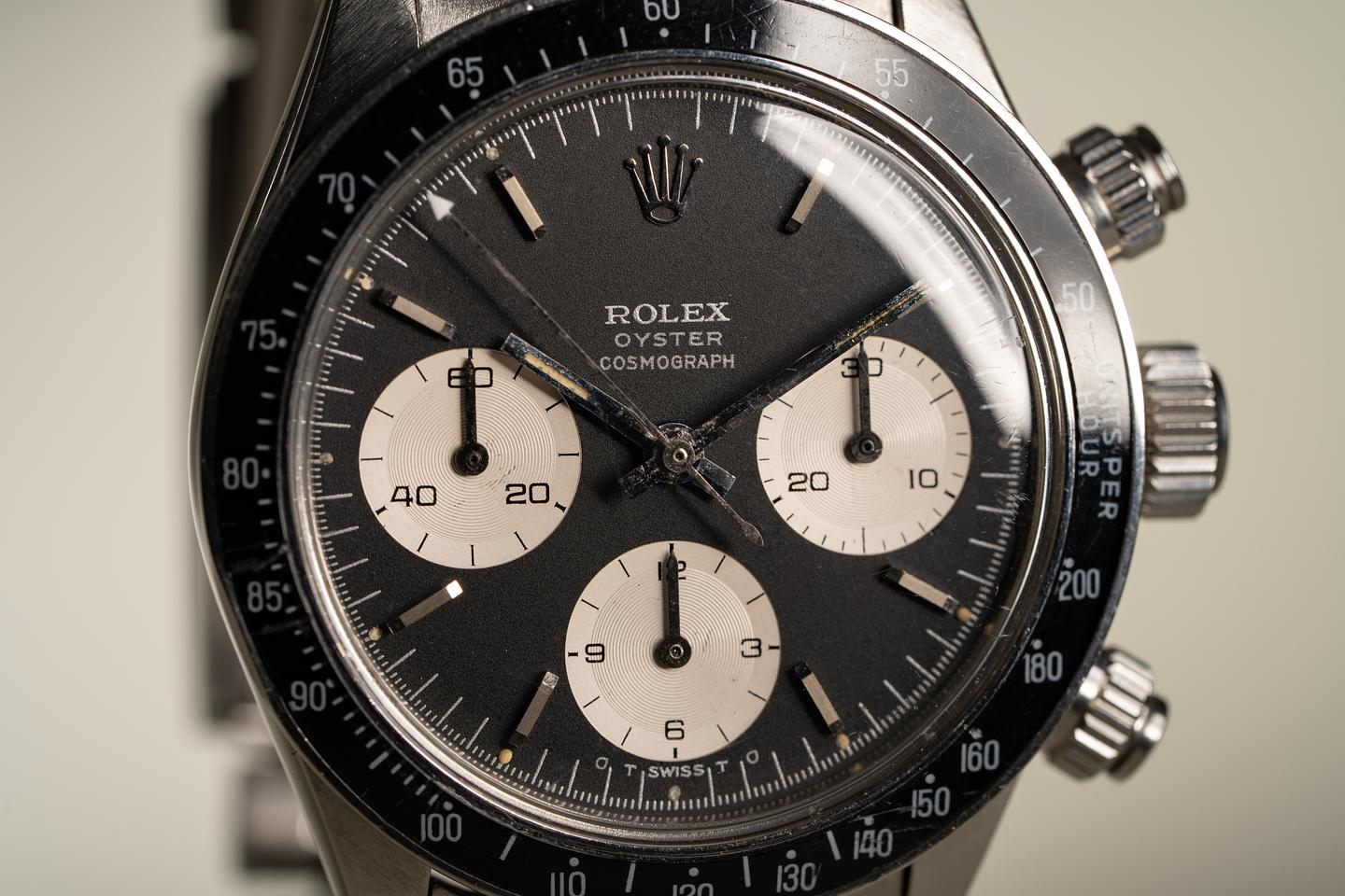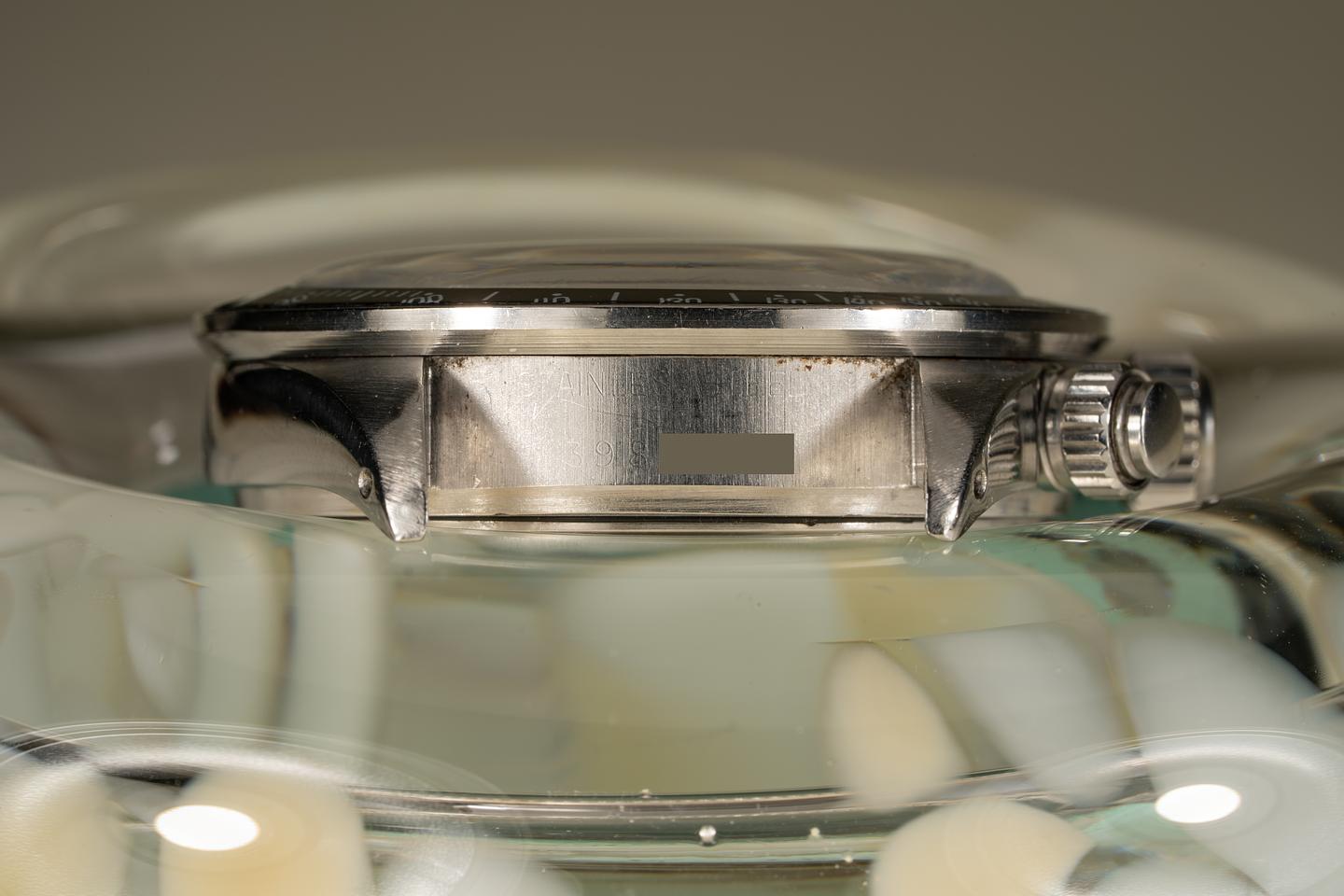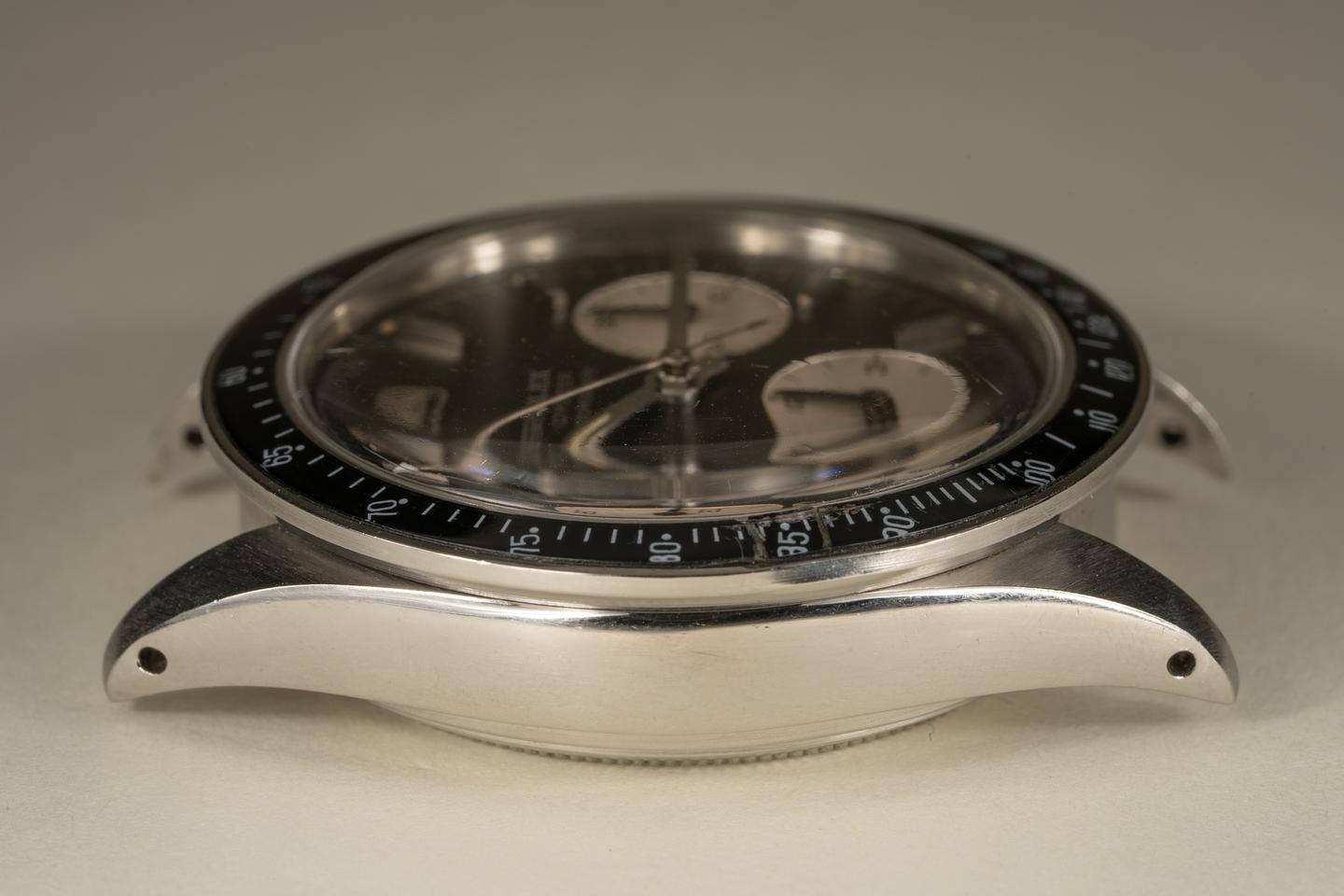 Dial: The matte black dial is excellent showing only light wear for its age. The silver subdials have some light and subtle patina and are otherwise excellent. Most of the lume plots are missing some or all of their luminous mass which is common for Daytonas of this era. The remaining lume has aged to a warm creamy hue and the hands match perfectly. All lume glows brightly when exposed to UV and falls off rapidly at the same rate which is correct for this dial version.