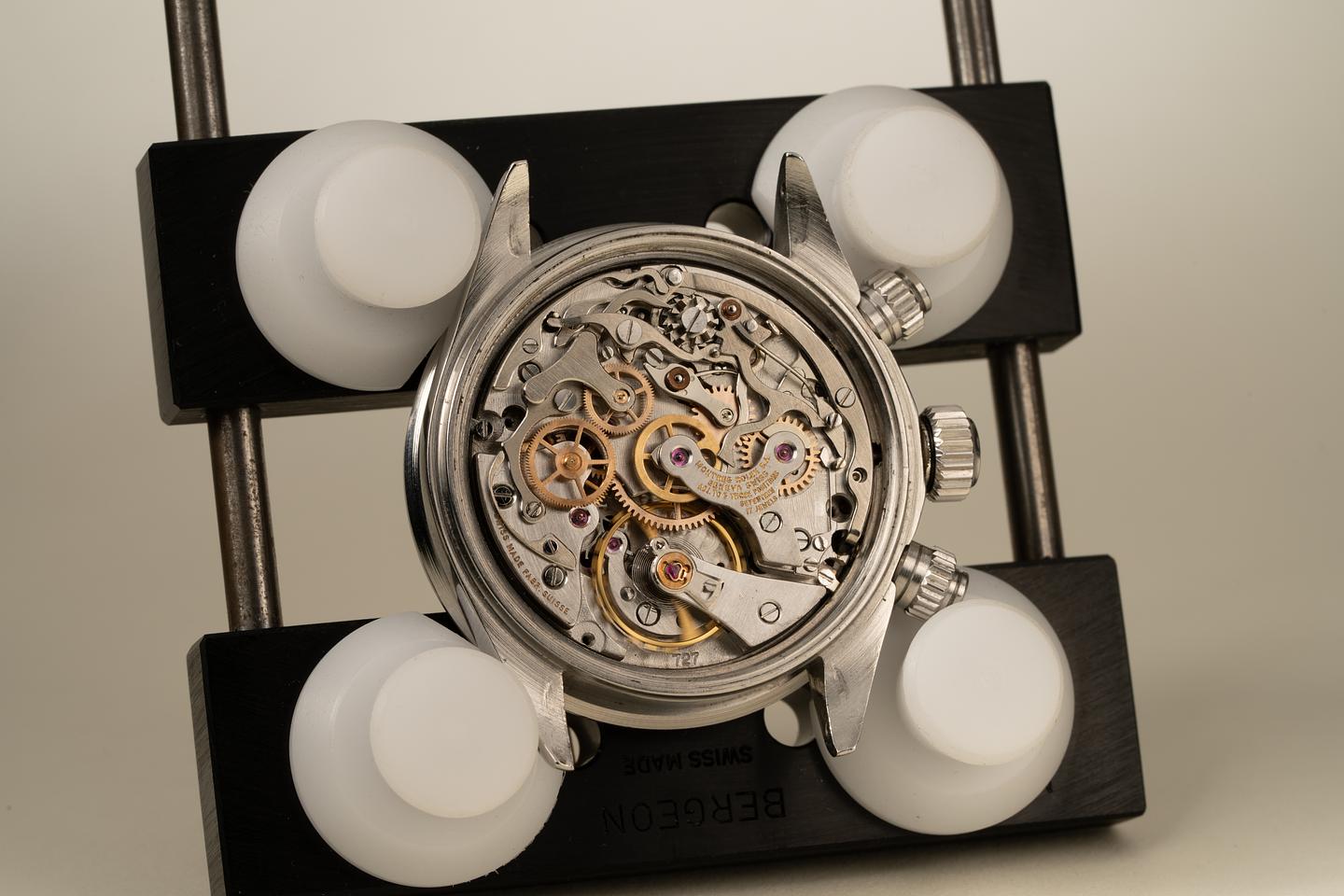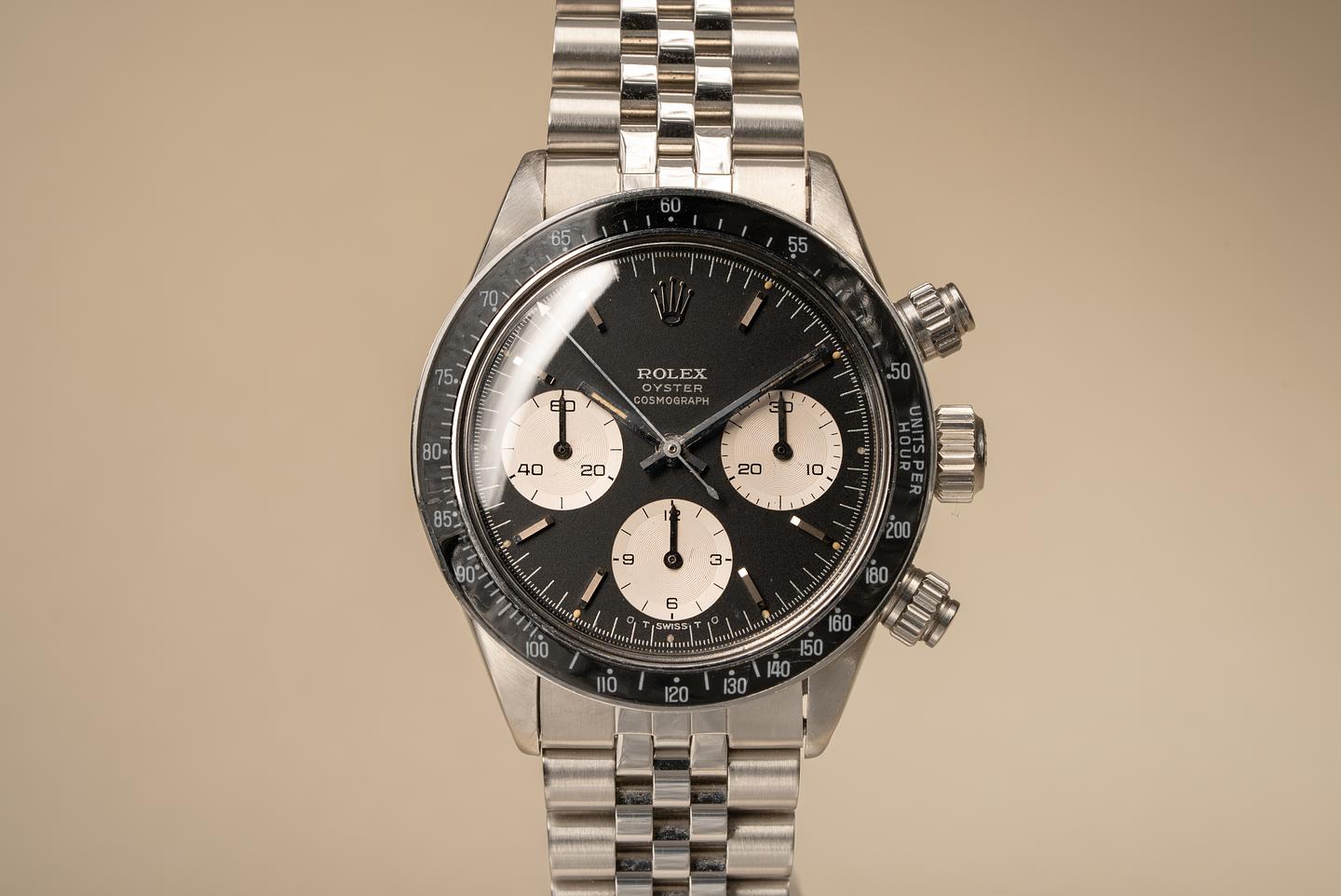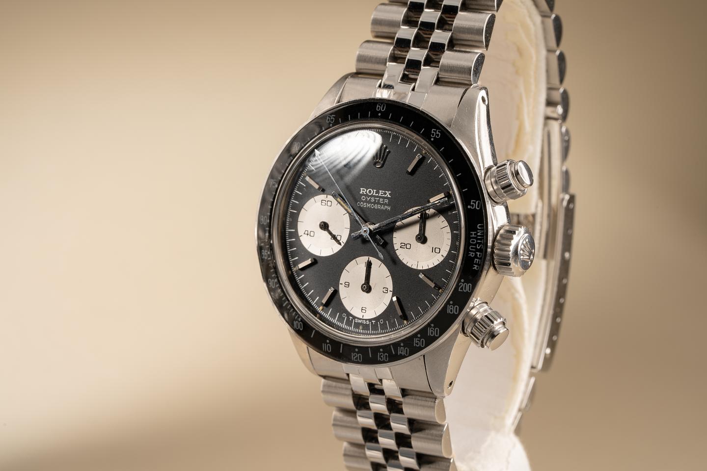 Dial: The matte black dial is excellent showing only light wear for its age. The silver subdials have some light and subtle patina and are otherwise excellent. Most of the lume plots are missing some or all of their luminous mass which is common for Daytonas of this era. The remaining lume has aged to a warm creamy hue and the hands match perfectly. All lume glows brightly when exposed to UV and falls off rapidly at the same rate which is correct for this dial version.