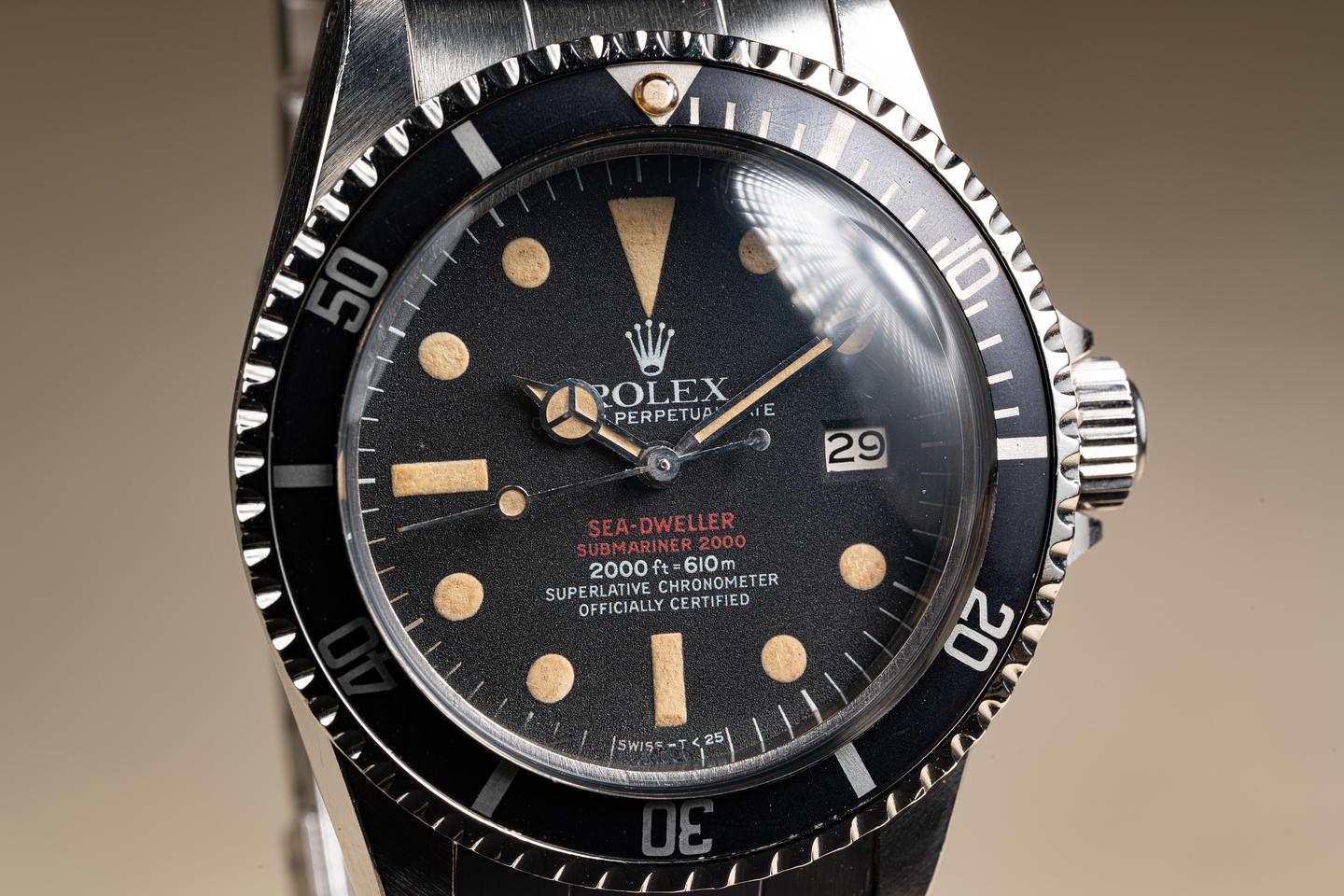 Dial: The matte black double-red dial is good showing some wear for its age. There is some staining to the right of the 6 o'clock marker. There is also a chip on the very bottom of the dial that runs into the Swiss - T < 25 text. The lume has aged to a warm creamy hue and the hands have been relumed and color matched to the dial.