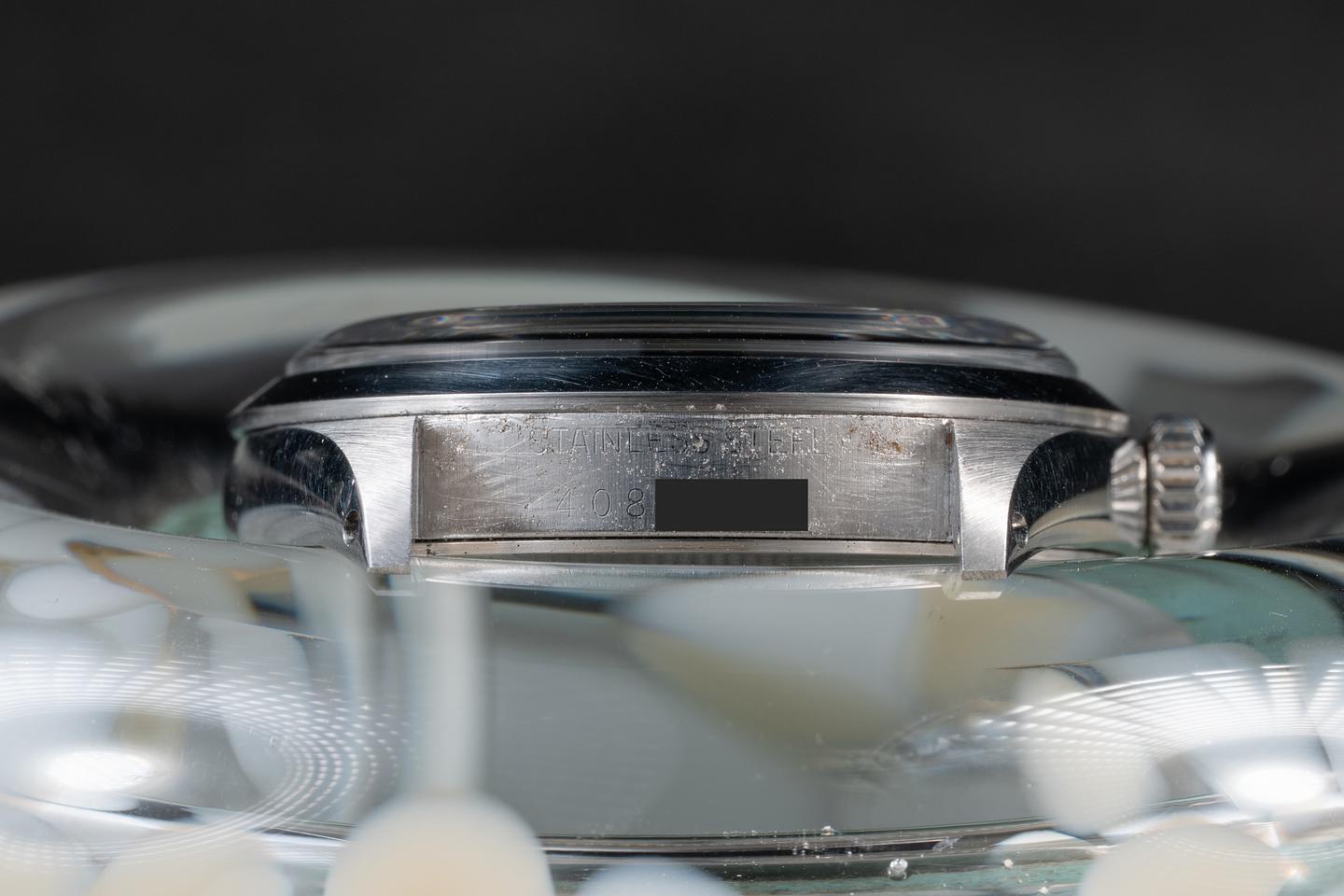 Case: The sharp 36mm case is excellent, showing only very light wear from use. The smooth stainless bezel is also in excellent condition, showing only very light wear from use.