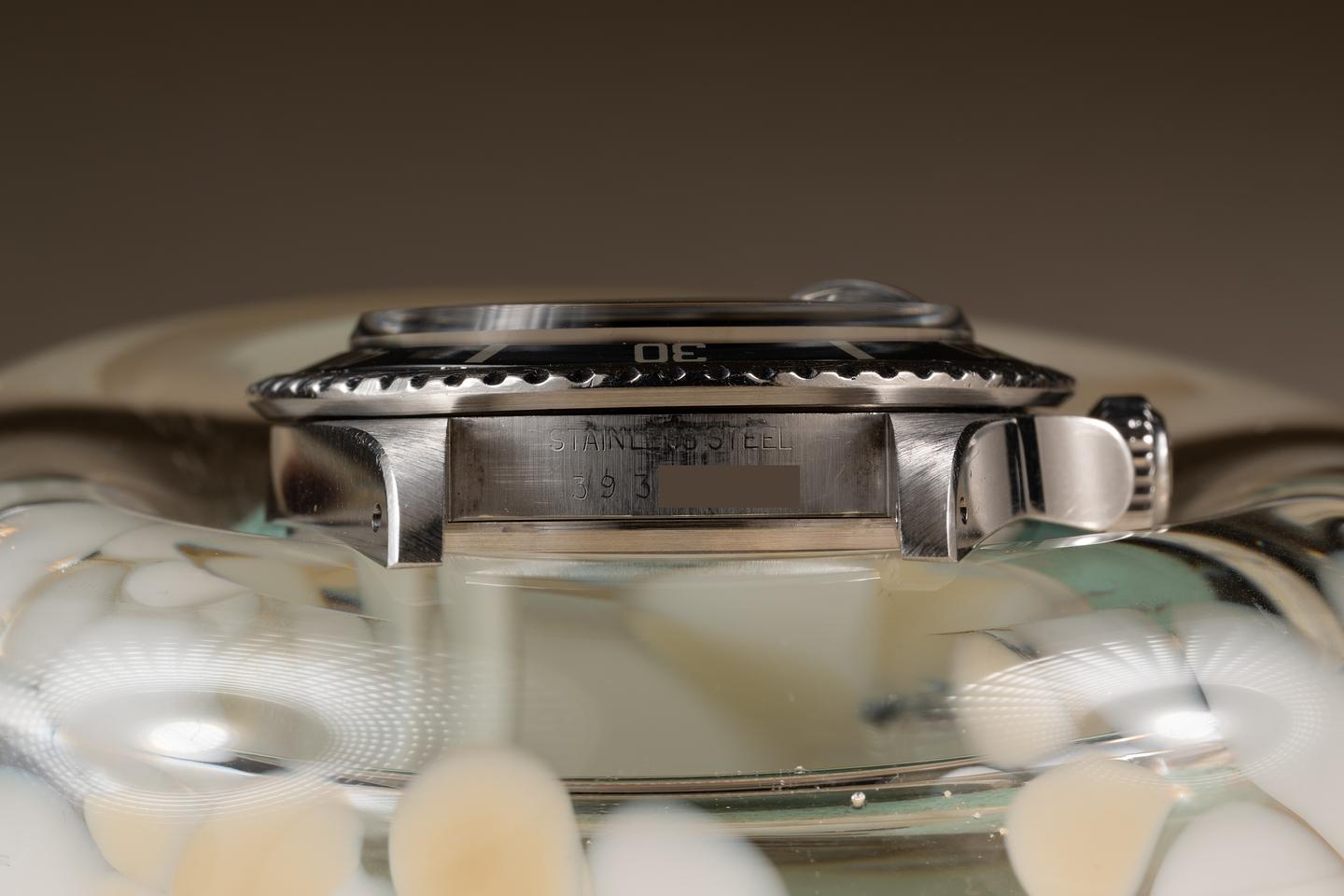 Case: The previously polished case is excellent showing sharp bevels and light to average wear from use. The bezel insert is also in excellent condition and has aged to a blue hue showing only light wear from use.