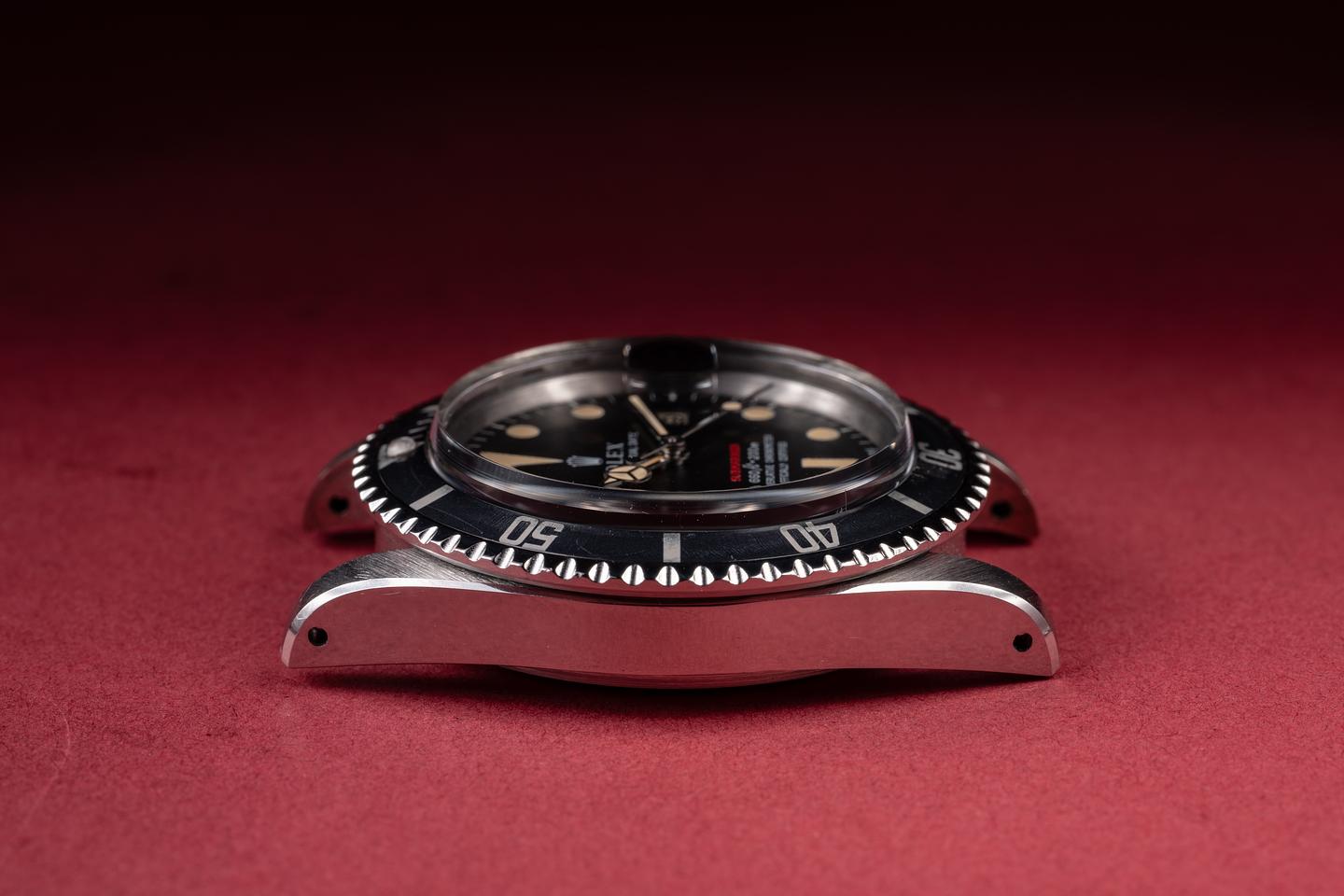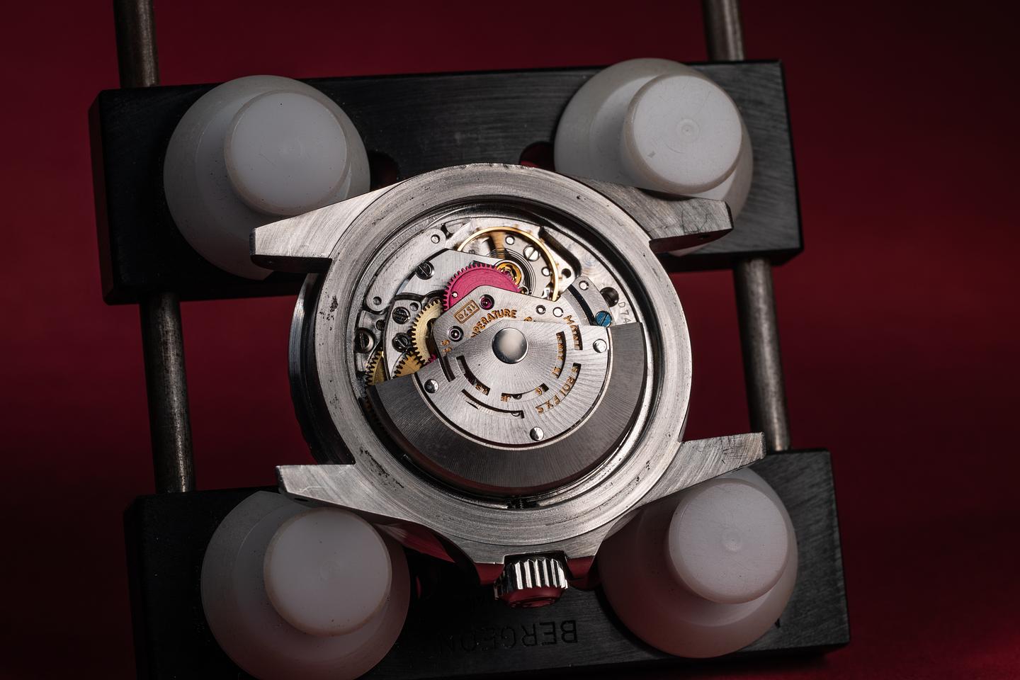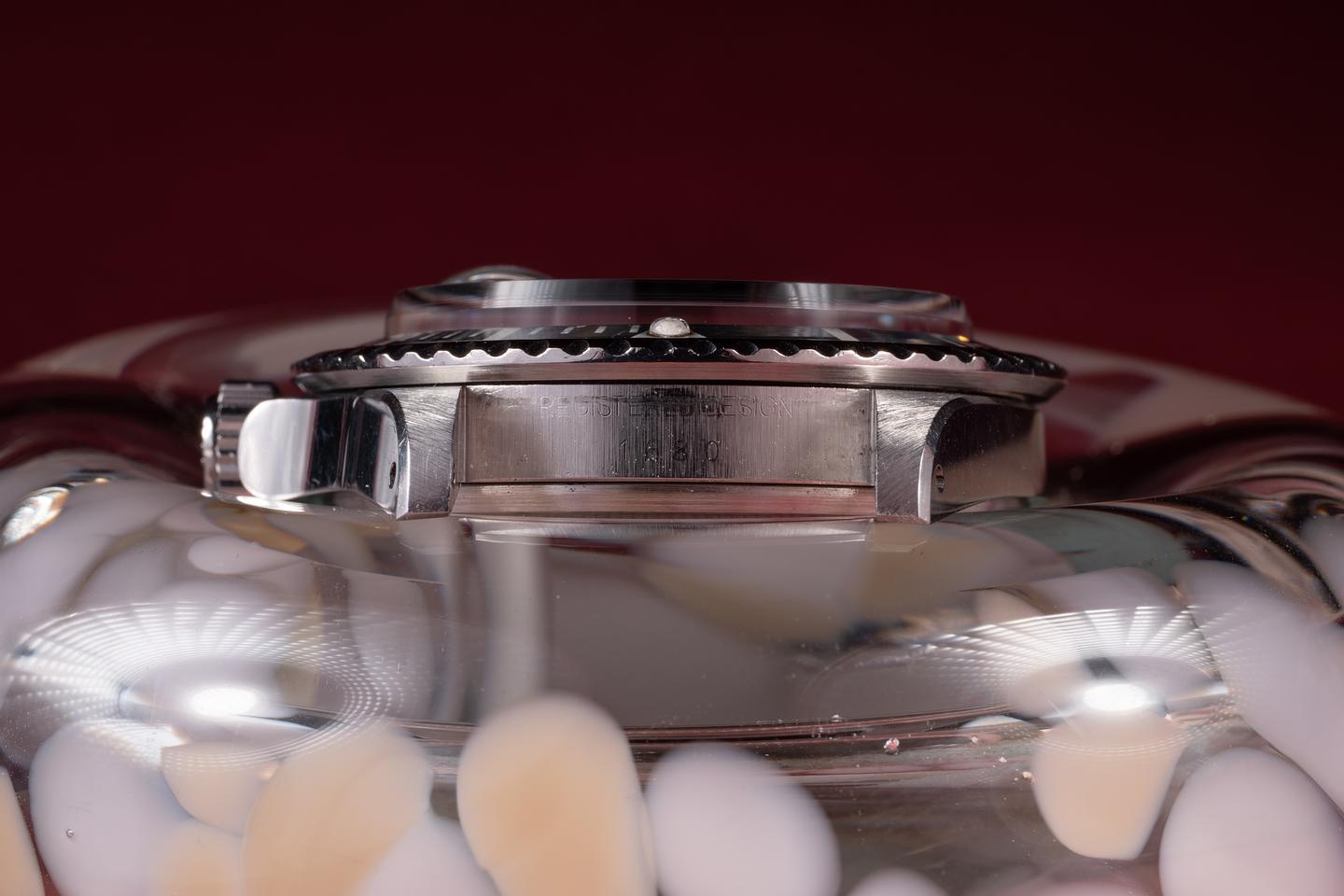 Case: The recently polished case is excellent, showing wide, sharp, prominent bevels and only light wear from use. The bezel insert is also in excellent condition and has aged to a silvery blue-grey tone.