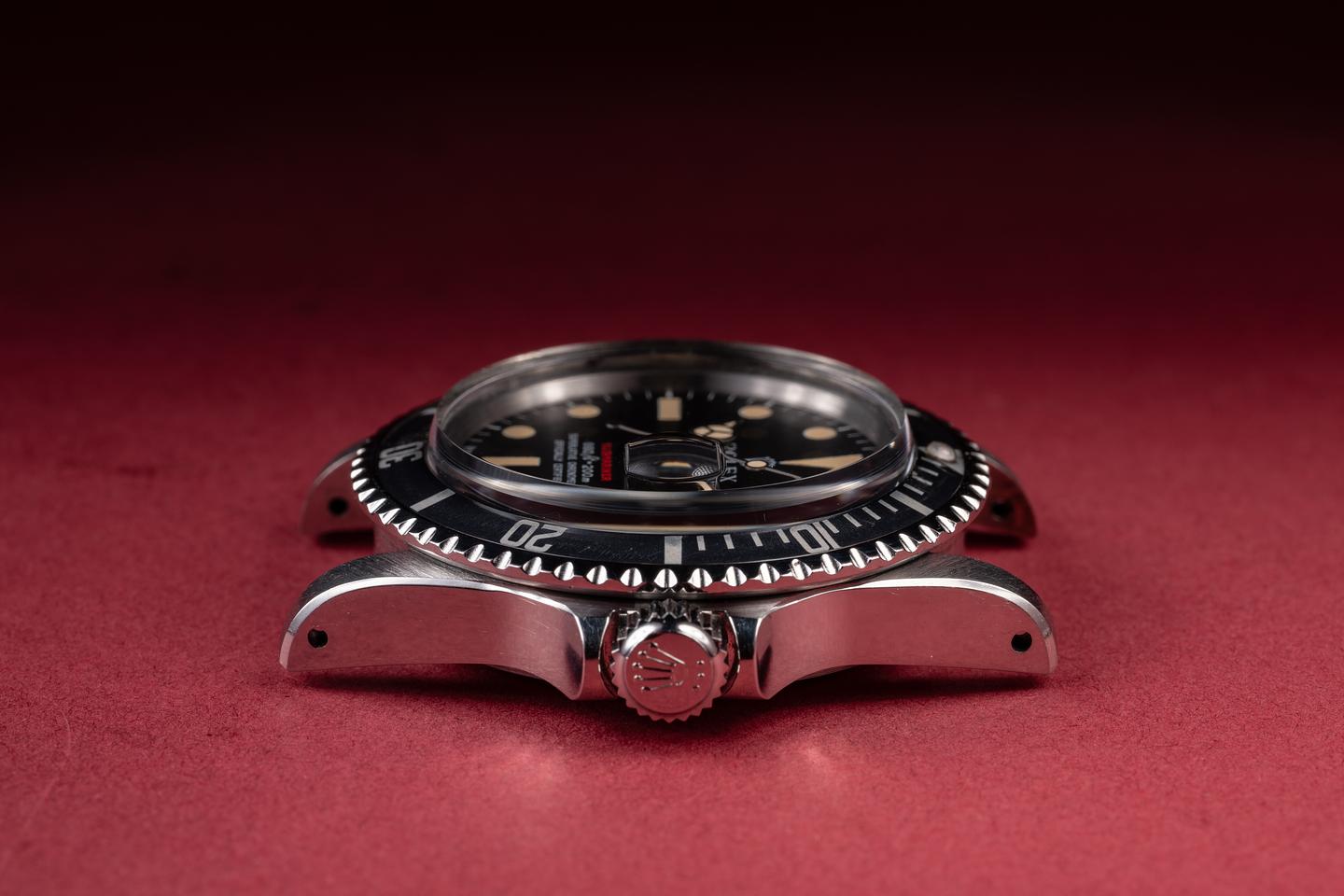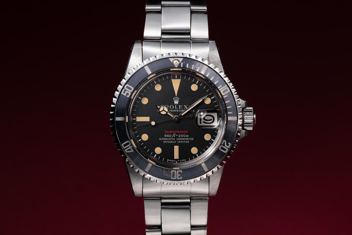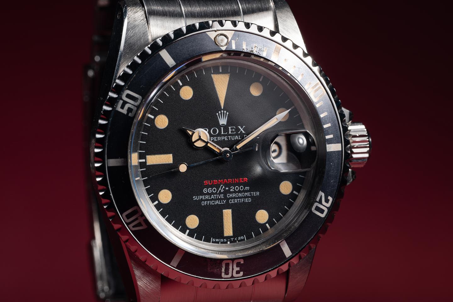 Case: The recently polished case is excellent, showing wide, sharp, prominent bevels and only light wear from use. The bezel insert is also in excellent condition and has aged to a silvery blue-grey tone.