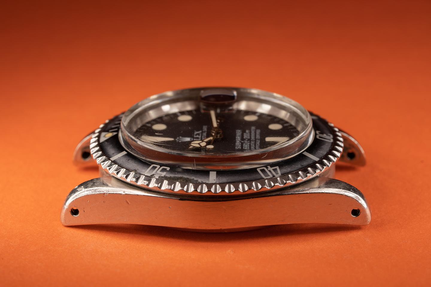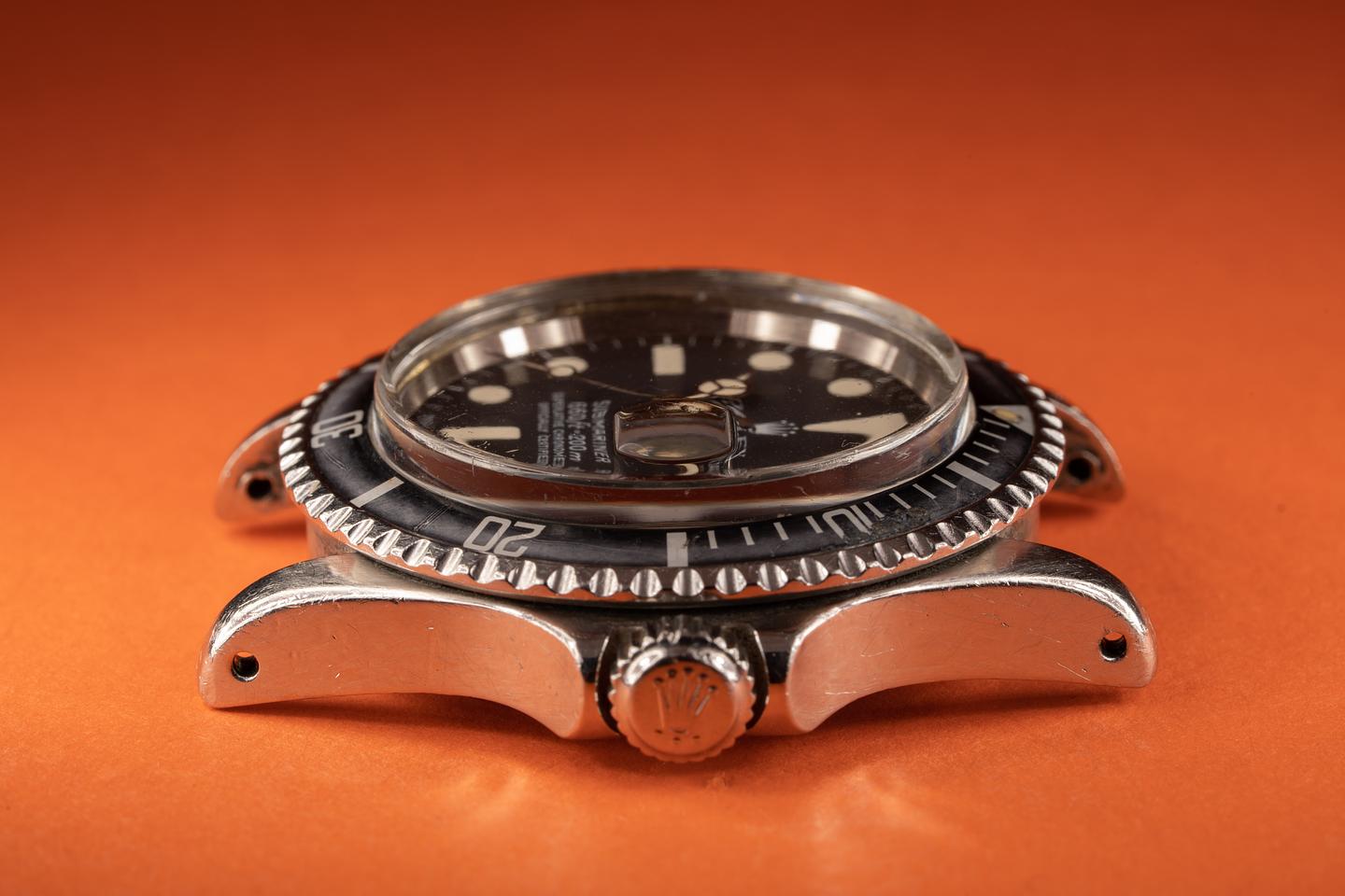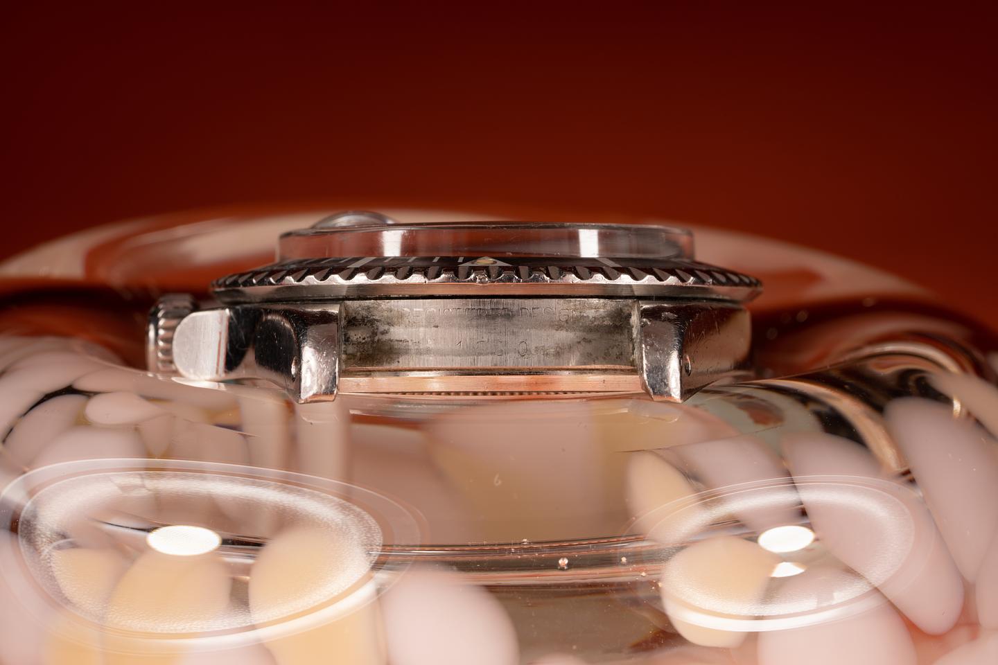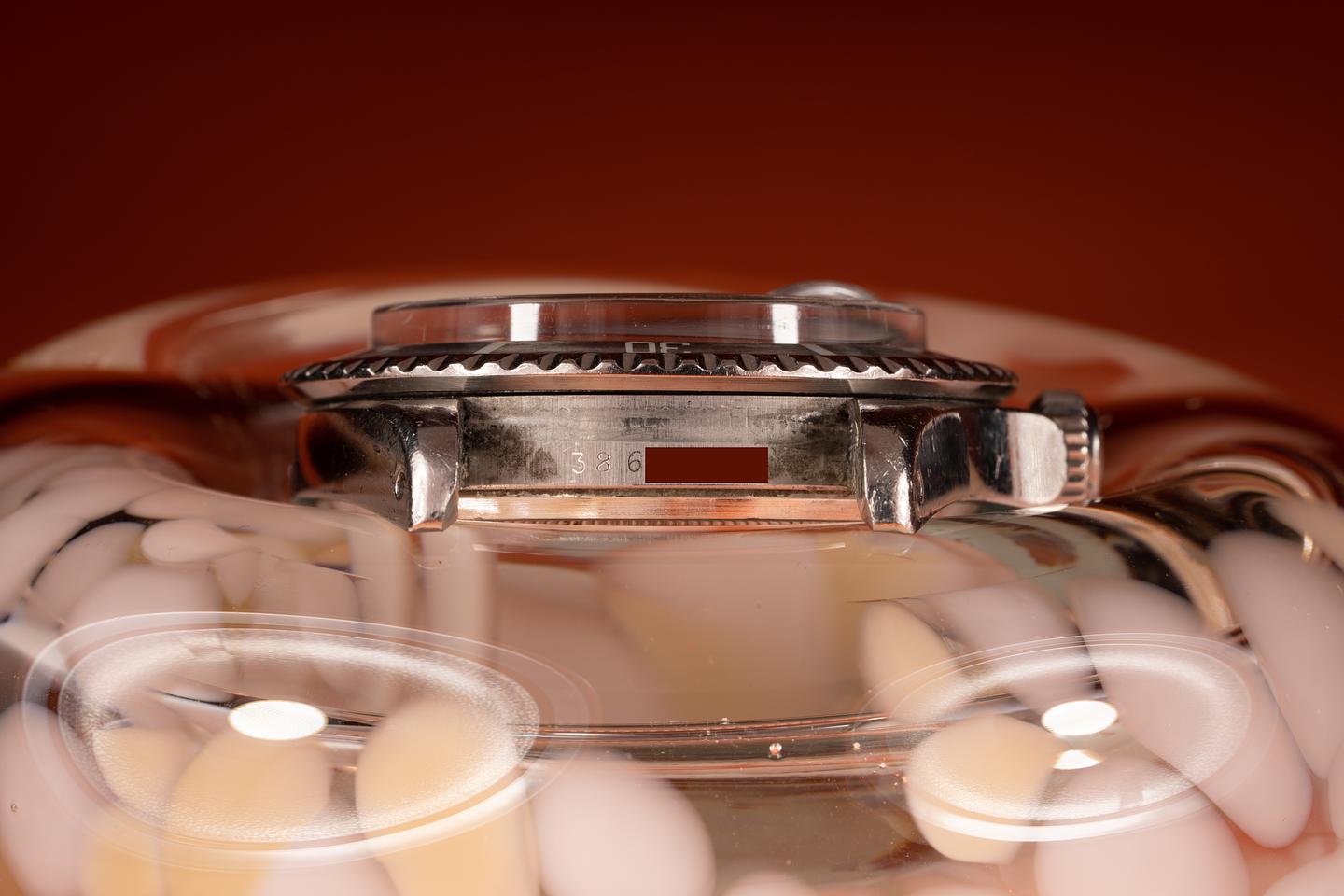 Case: The previously polished case is very good and showing a sleeve polished finish and some wear from use. The black bezel insert shows a graduated dark grey to silver fade and shows some wear from use.