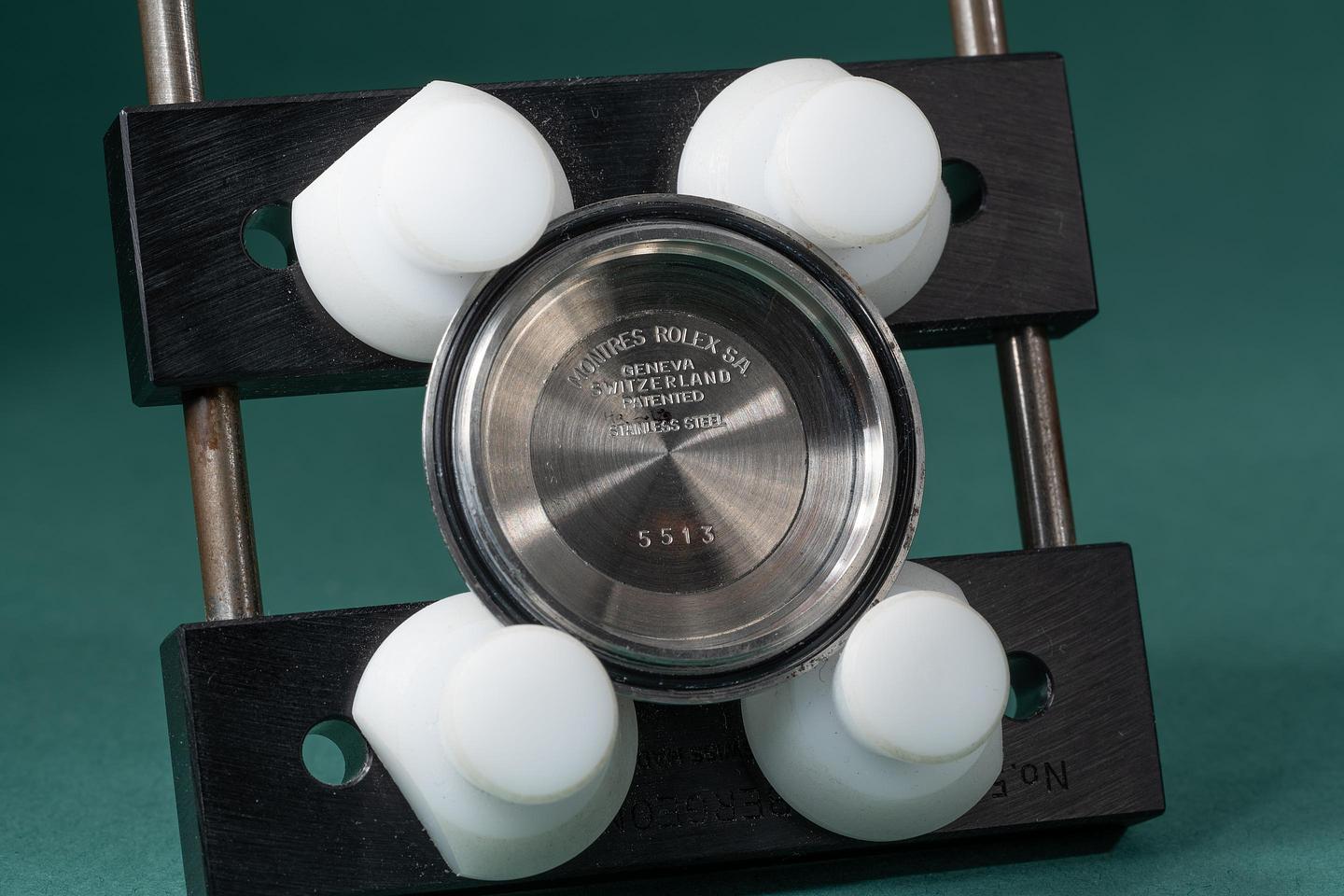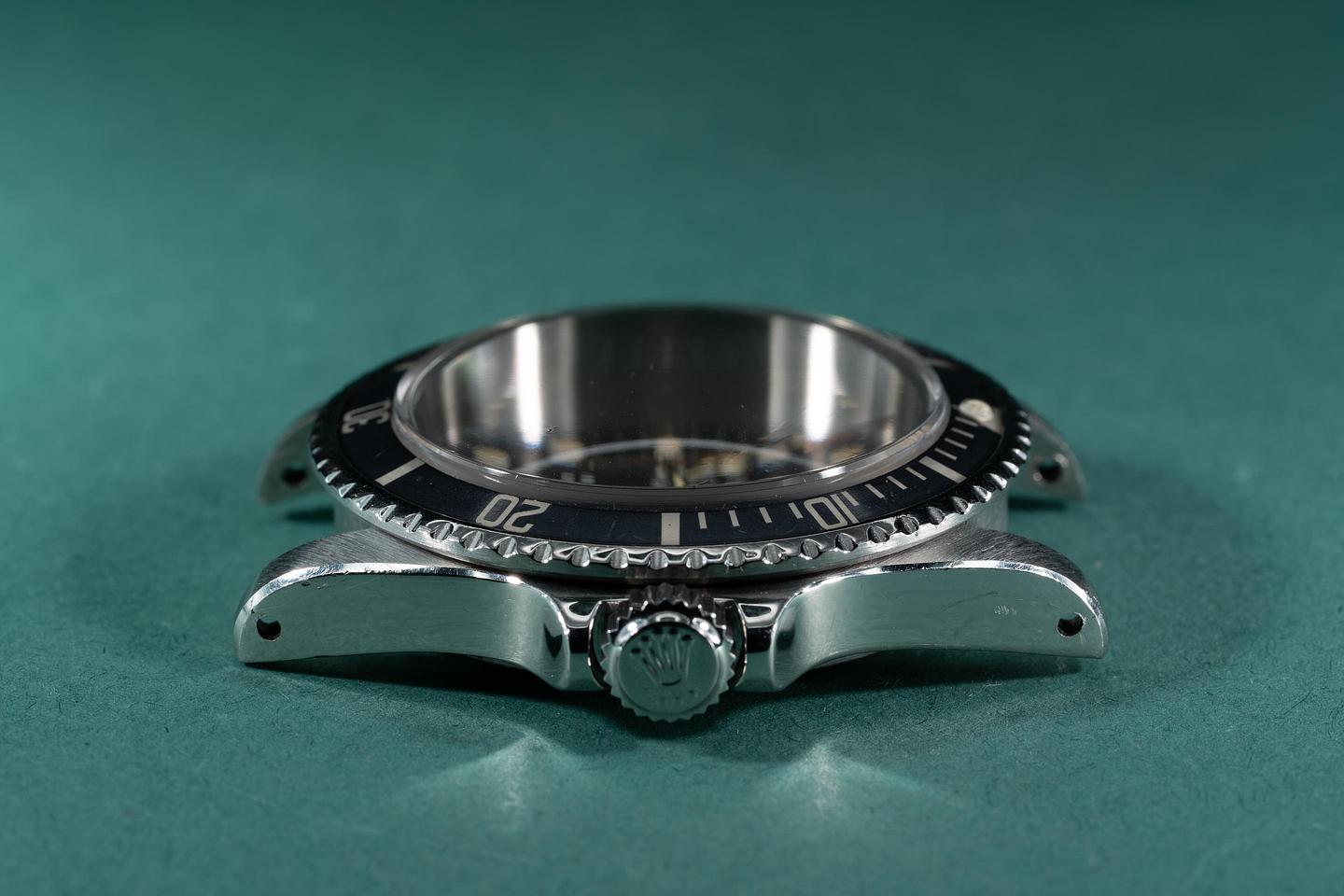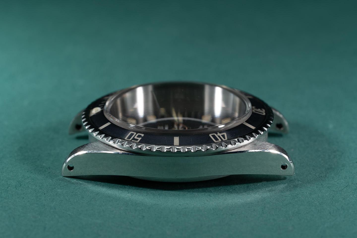 Case: The previously polished case is very good showing wide prominent bevels and only light wear from use. The bezel insert has faded to a silvery navy blue hue showing only very light wear from use.