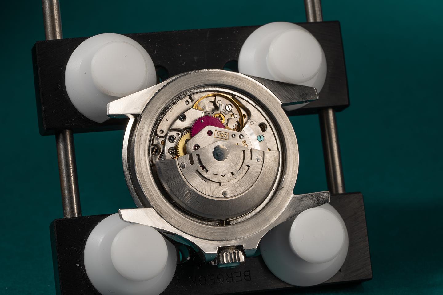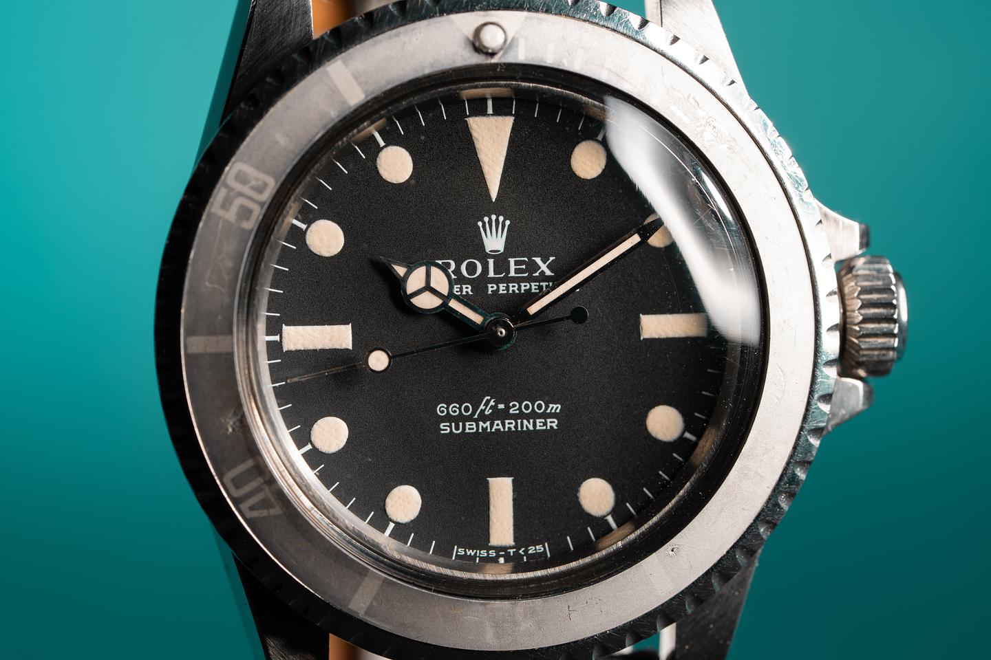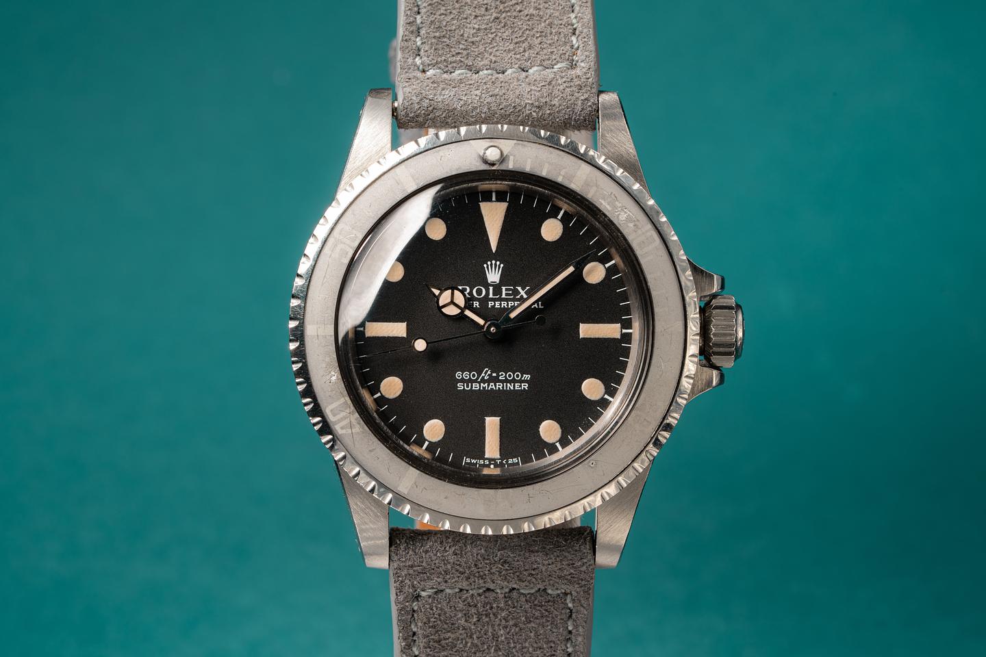 Case: The previously polished case is excellent and features sharp and prominent bevels. The bezel insert has faded with a silvery grey "Ghost" patina and shows only light wear for its age.