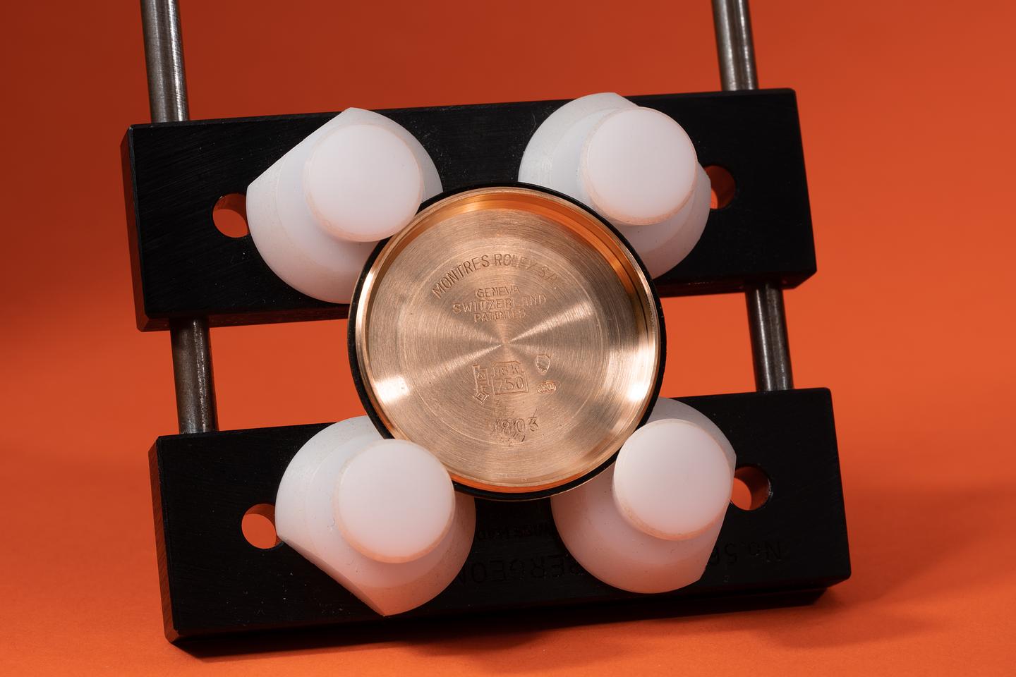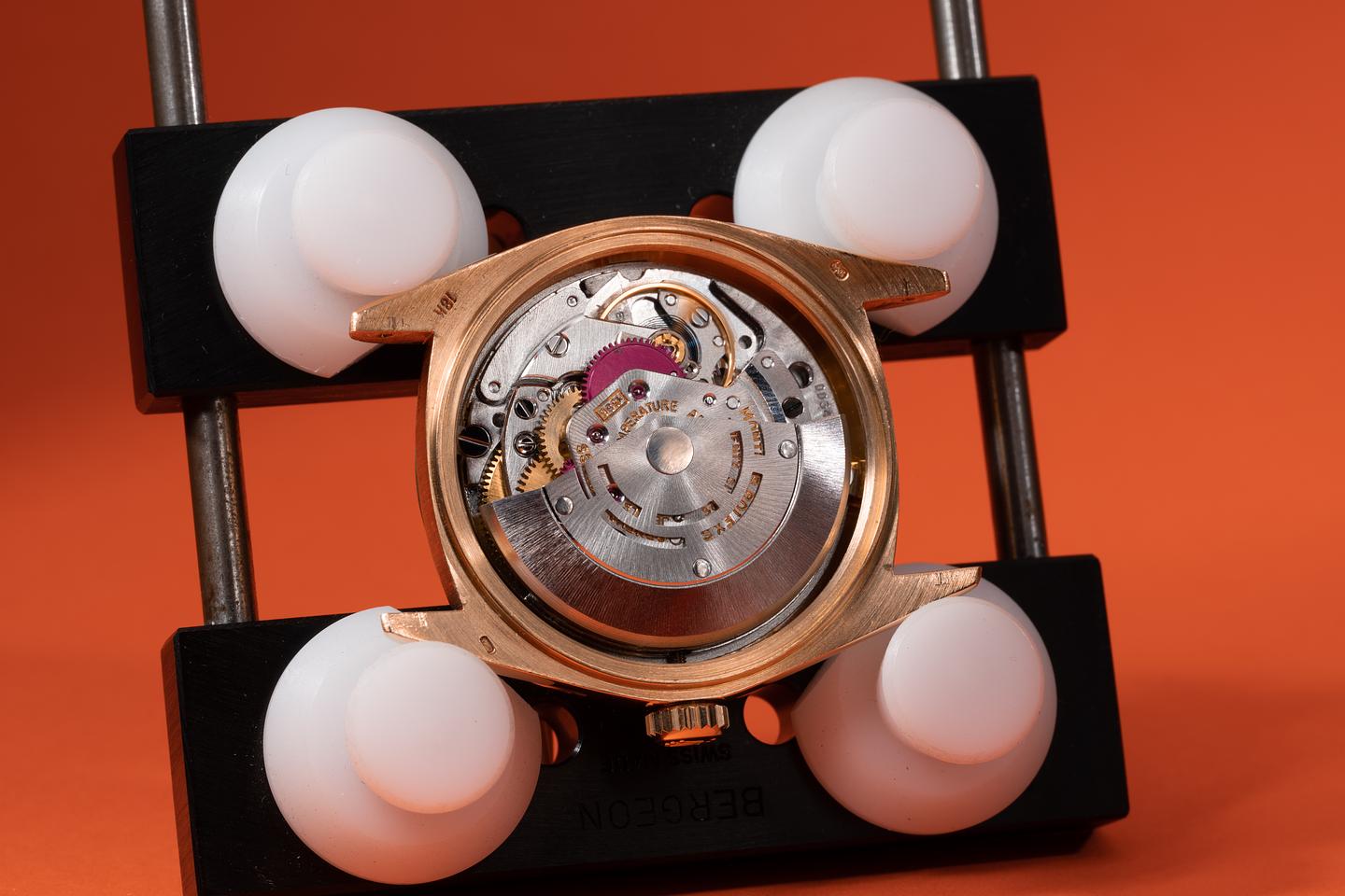 Case: The 18k yellow gold case is excellent showing only light wear from use. The 18k yellow gold fluted bezel is very good showing light wear from use.