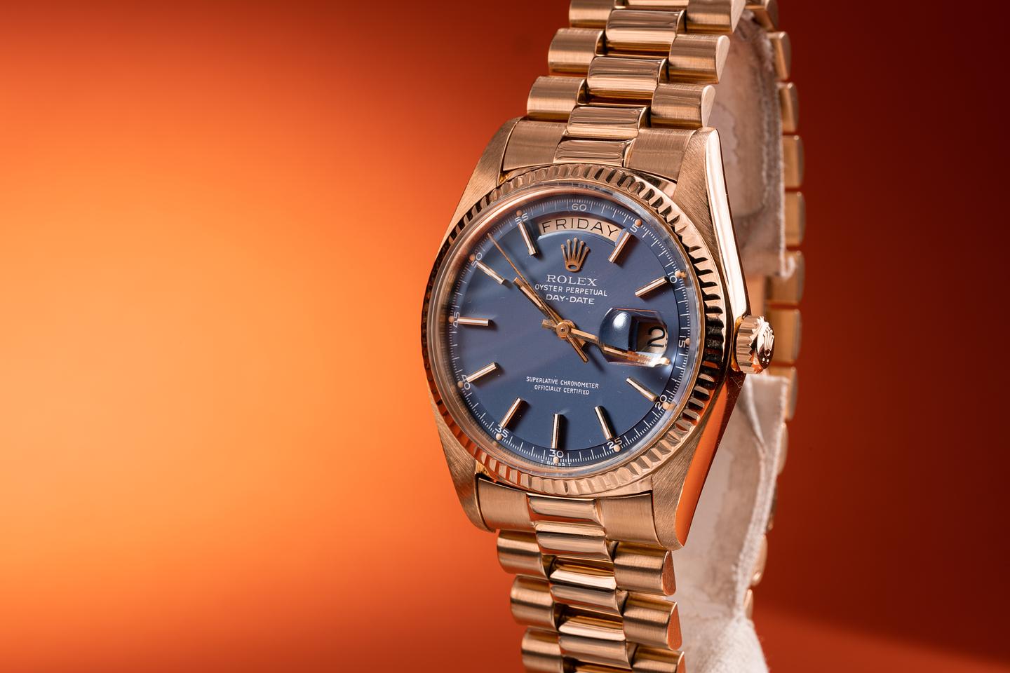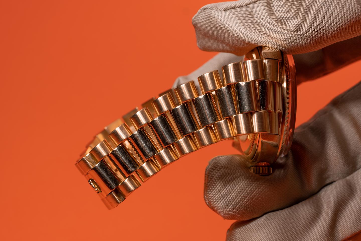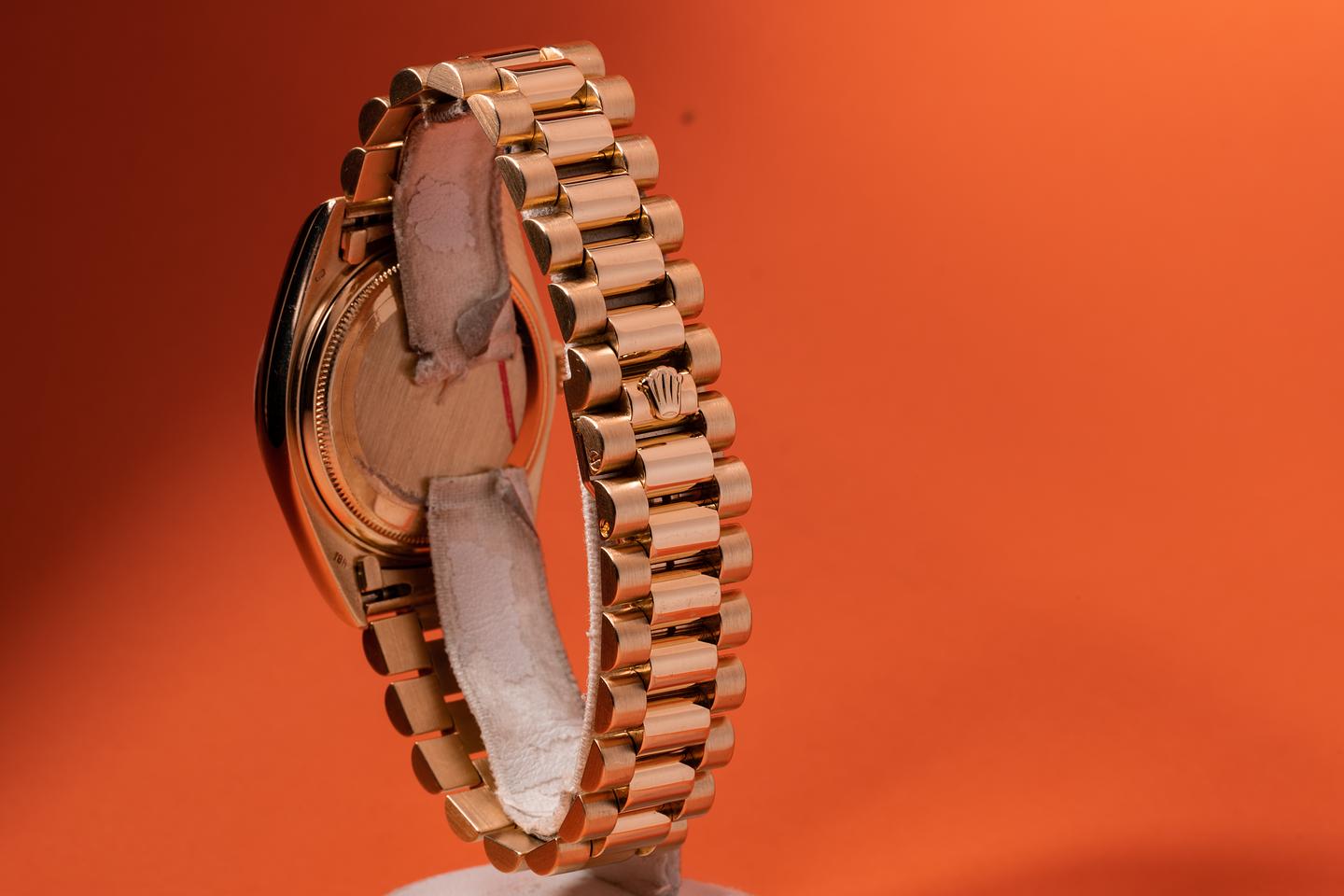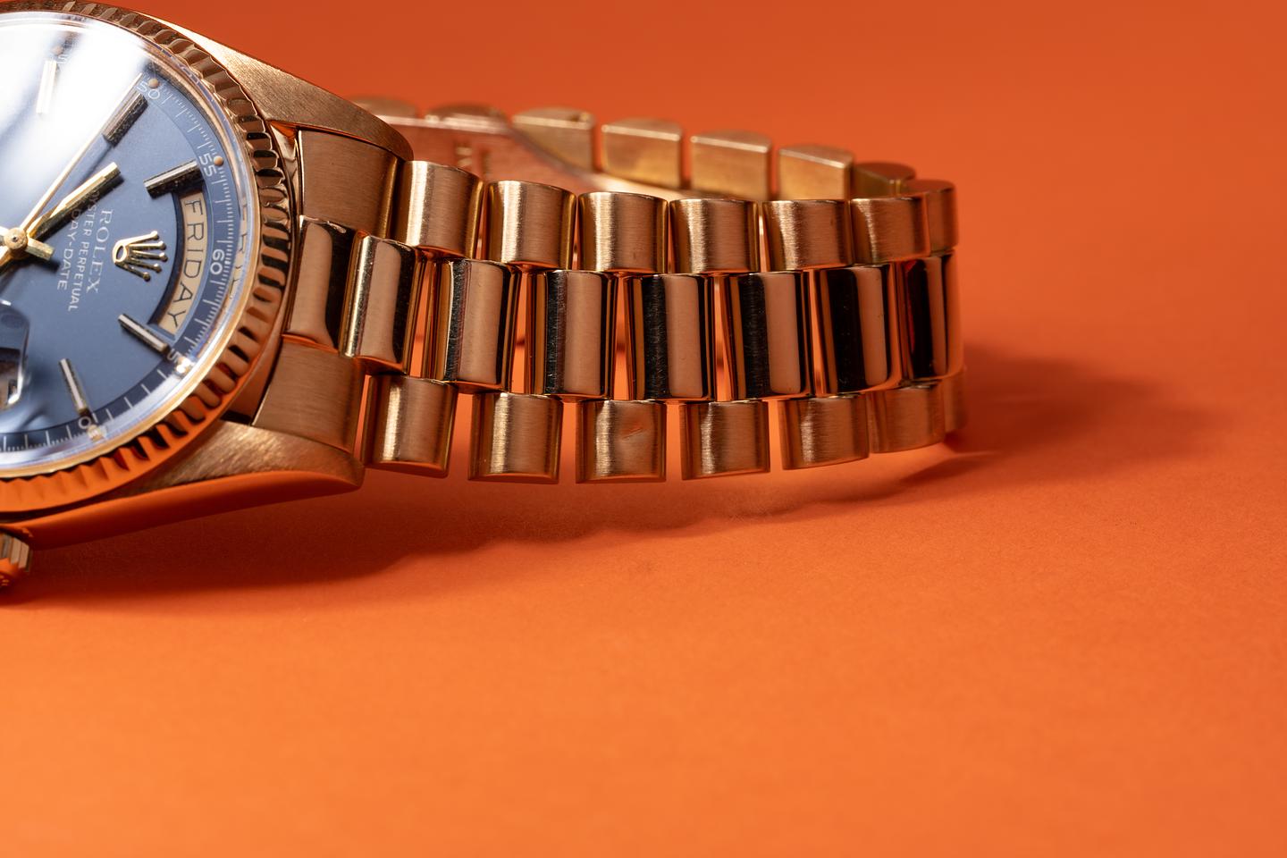 Bracelet: The 22 link 18k yellow gold president bracelet is excellent showing light stretch for its age. The clasp is stamped with a matching 1976 date code. The 3rd link from the 12 o'clock end link shows a small ding.