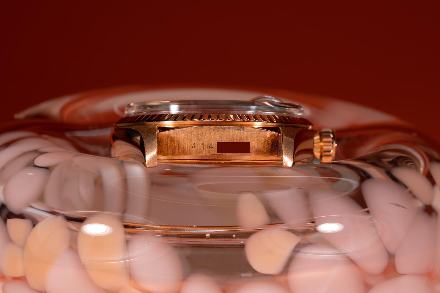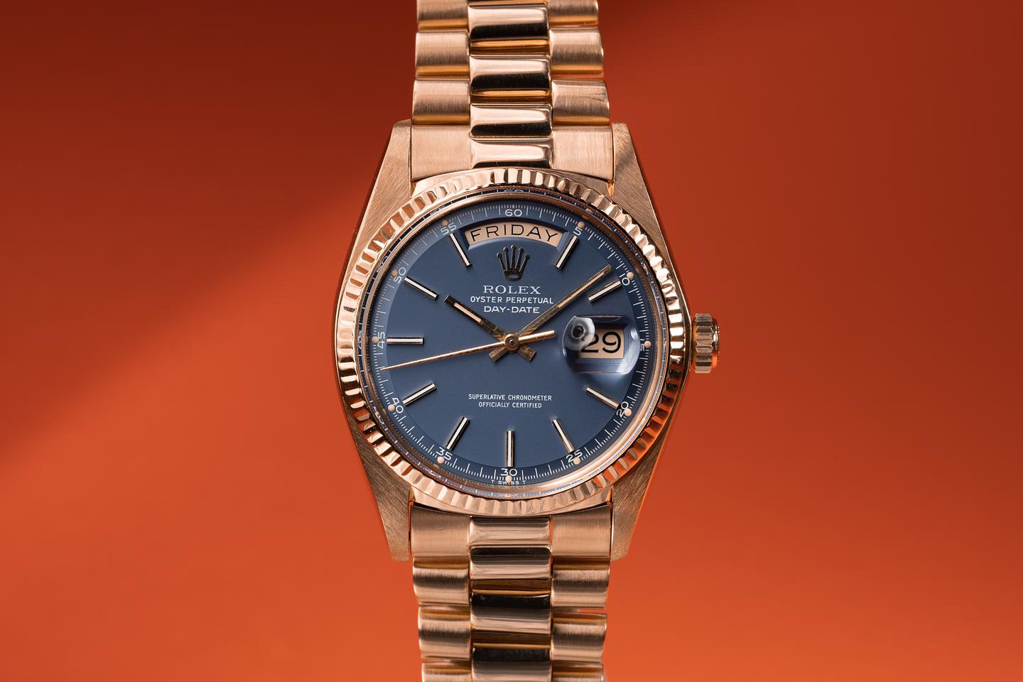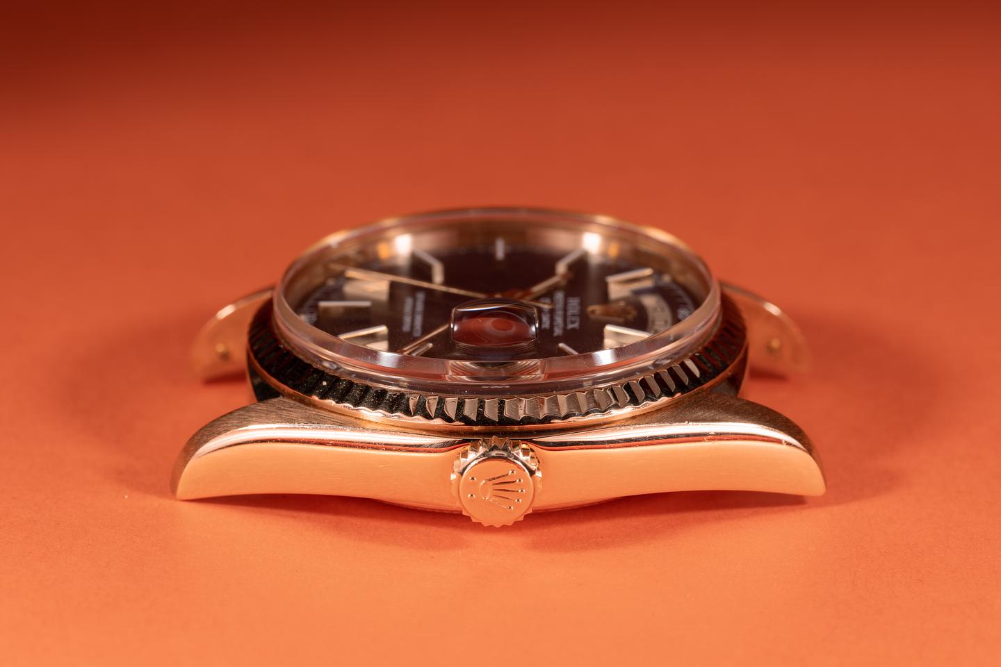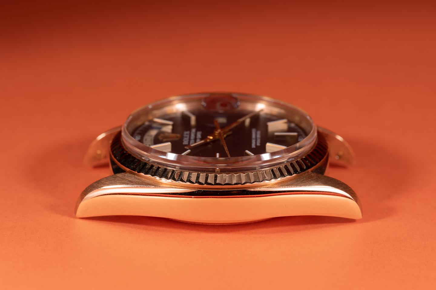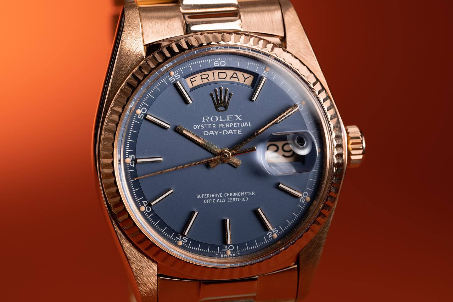 Bracelet: The 22 link 18k yellow gold president bracelet is excellent showing light stretch for its age. The clasp is stamped with a matching 1976 date code. The 3rd link from the 12 o'clock end link shows a small ding.