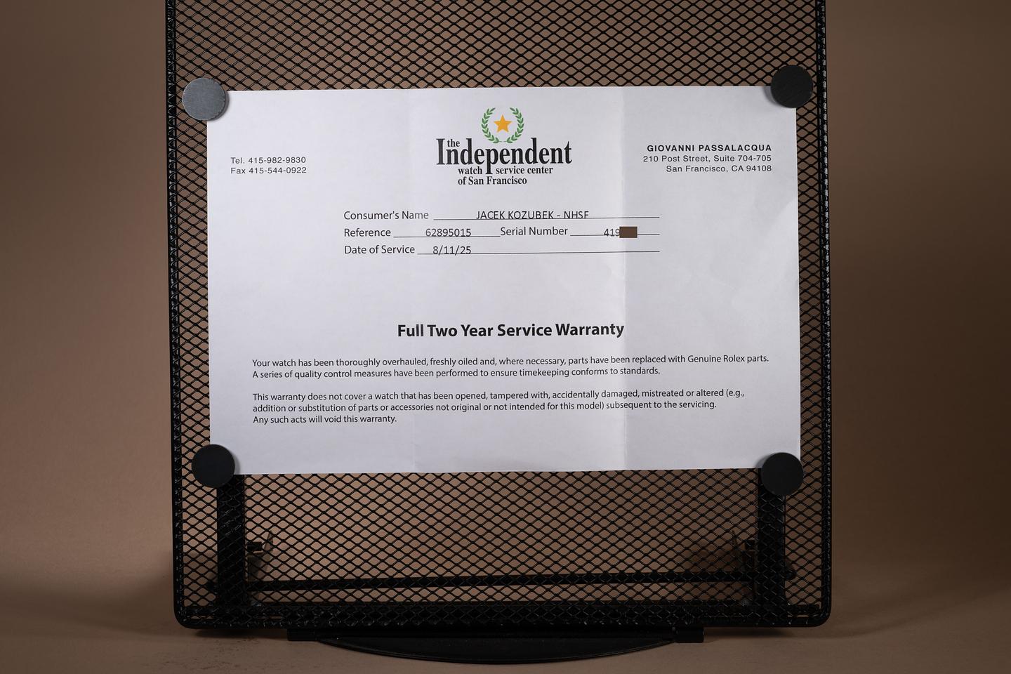 Case: The sharp 36mm case is excellent, showing only very light wear from use. The sharp 18K white gold fluted bezel is also in excellent condition, showing only light wear from use. The last digit of the serial number is illegible.