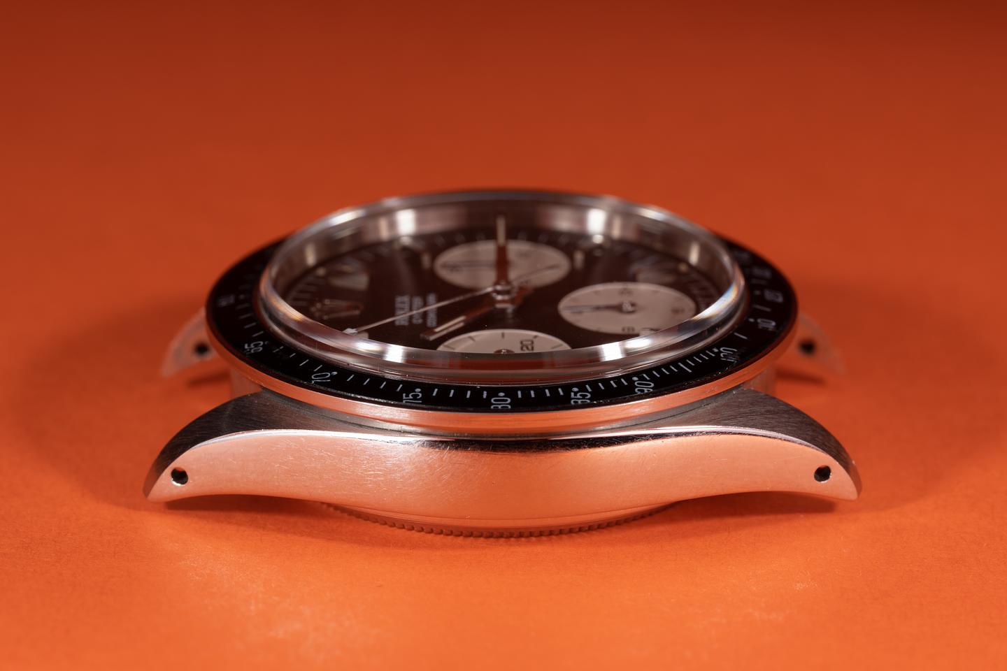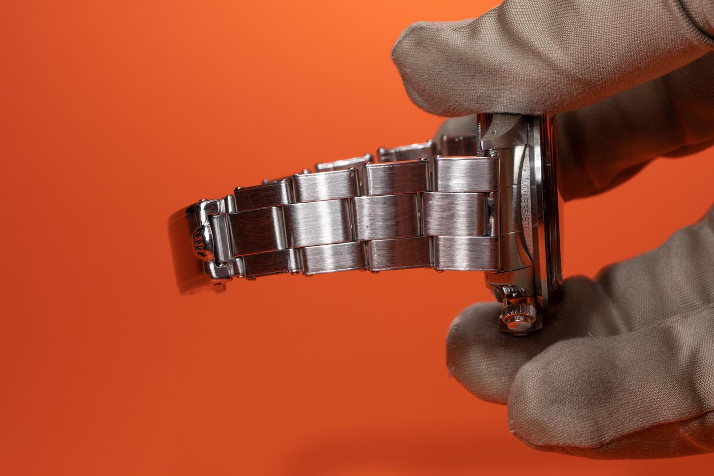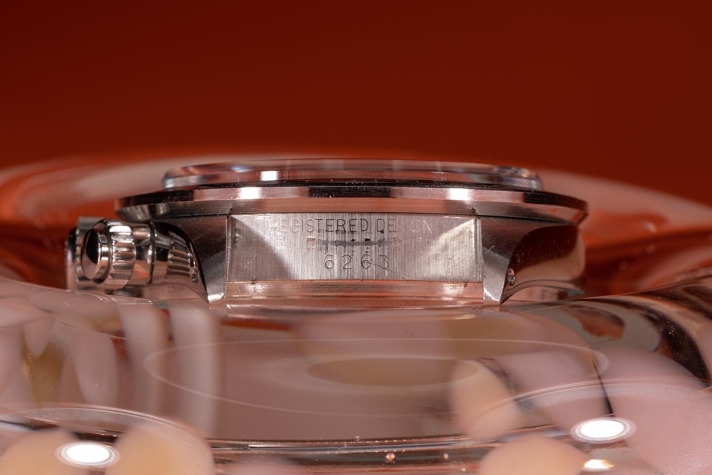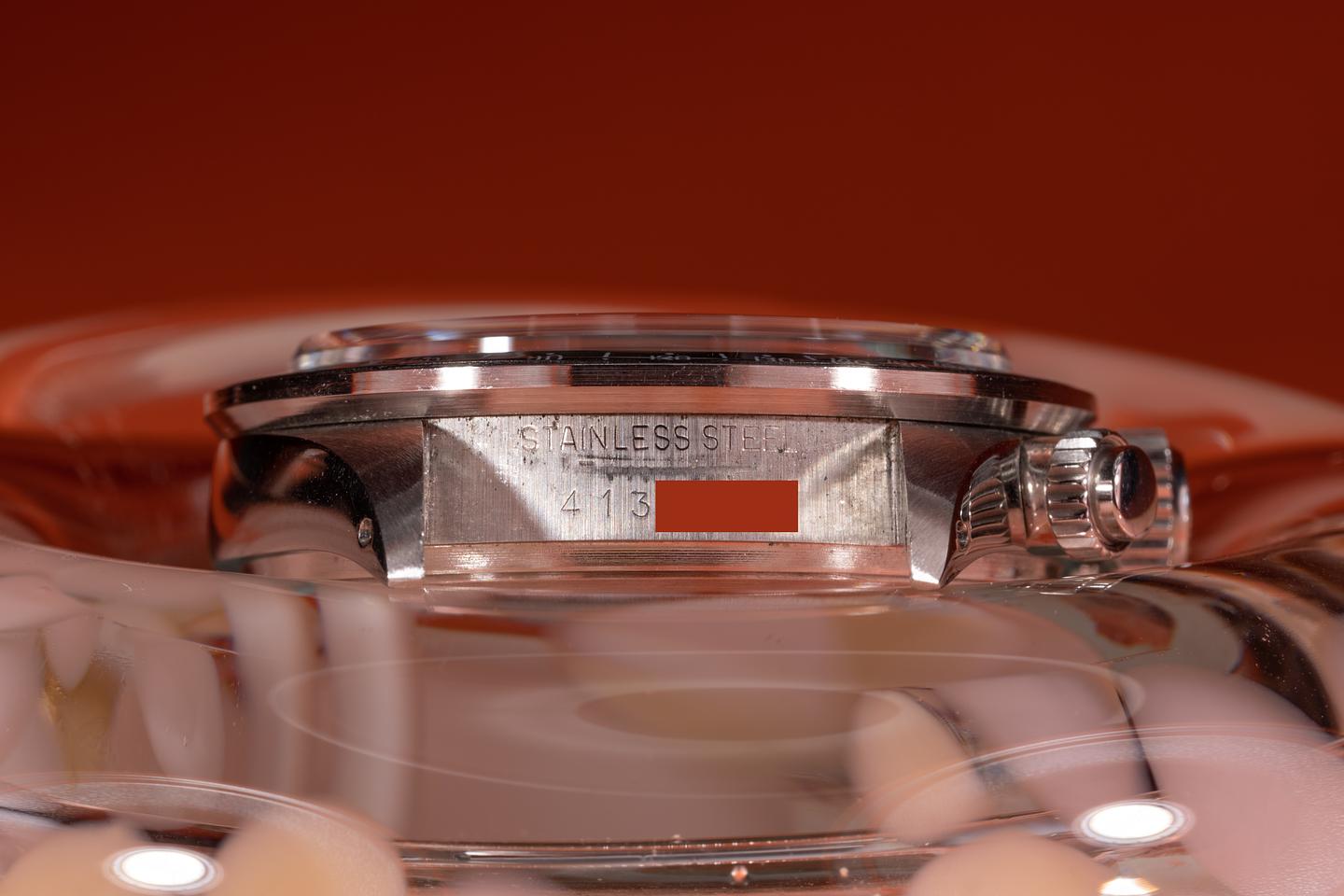 Case: The sharp recently polished case is excellent showing only very light wear from, use. The black bezel is also in excellent condition showing some light wear from use. There is some light cracking to the back of the insert around the 100 and the 65 index. This is considered normal for inserts of this age.