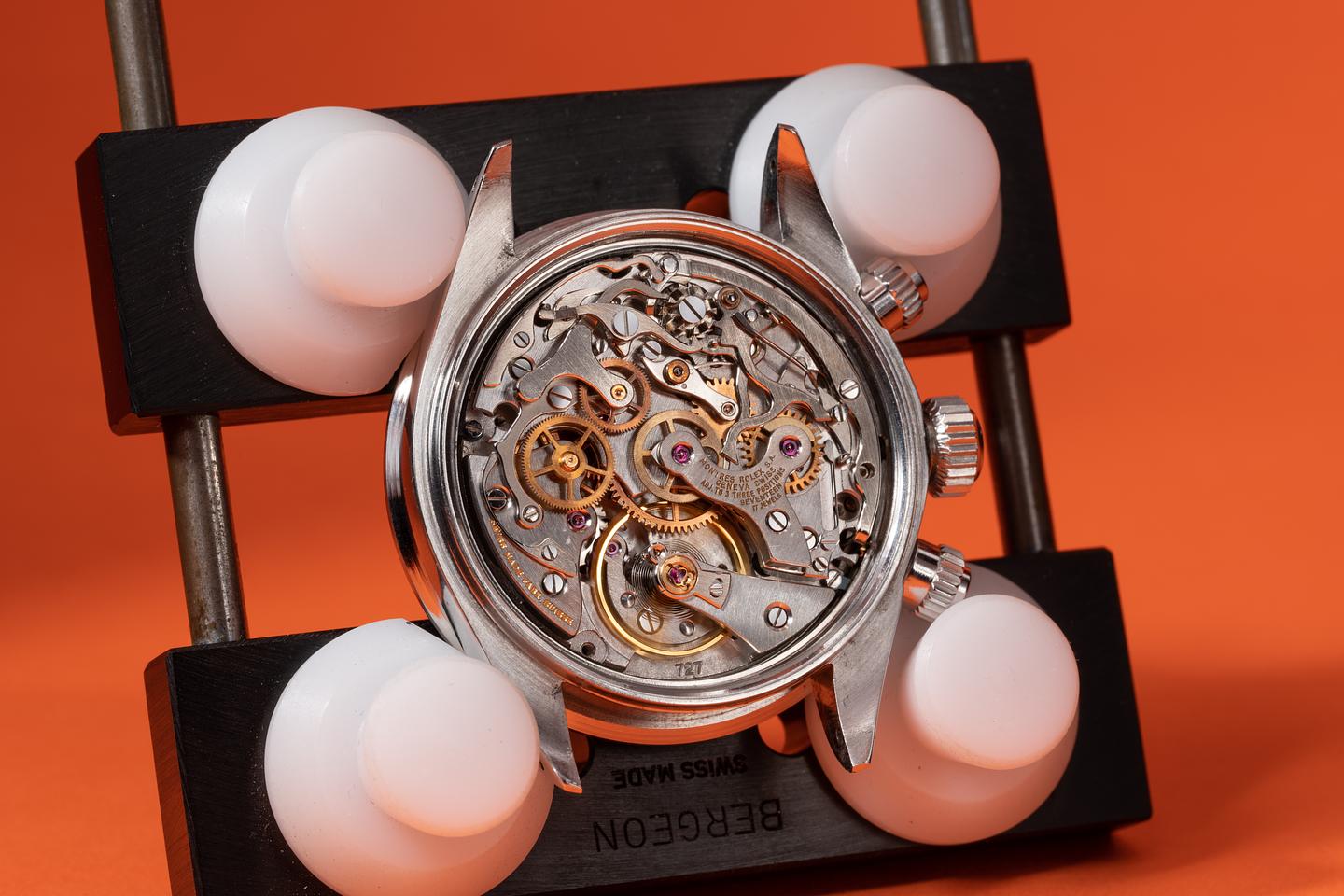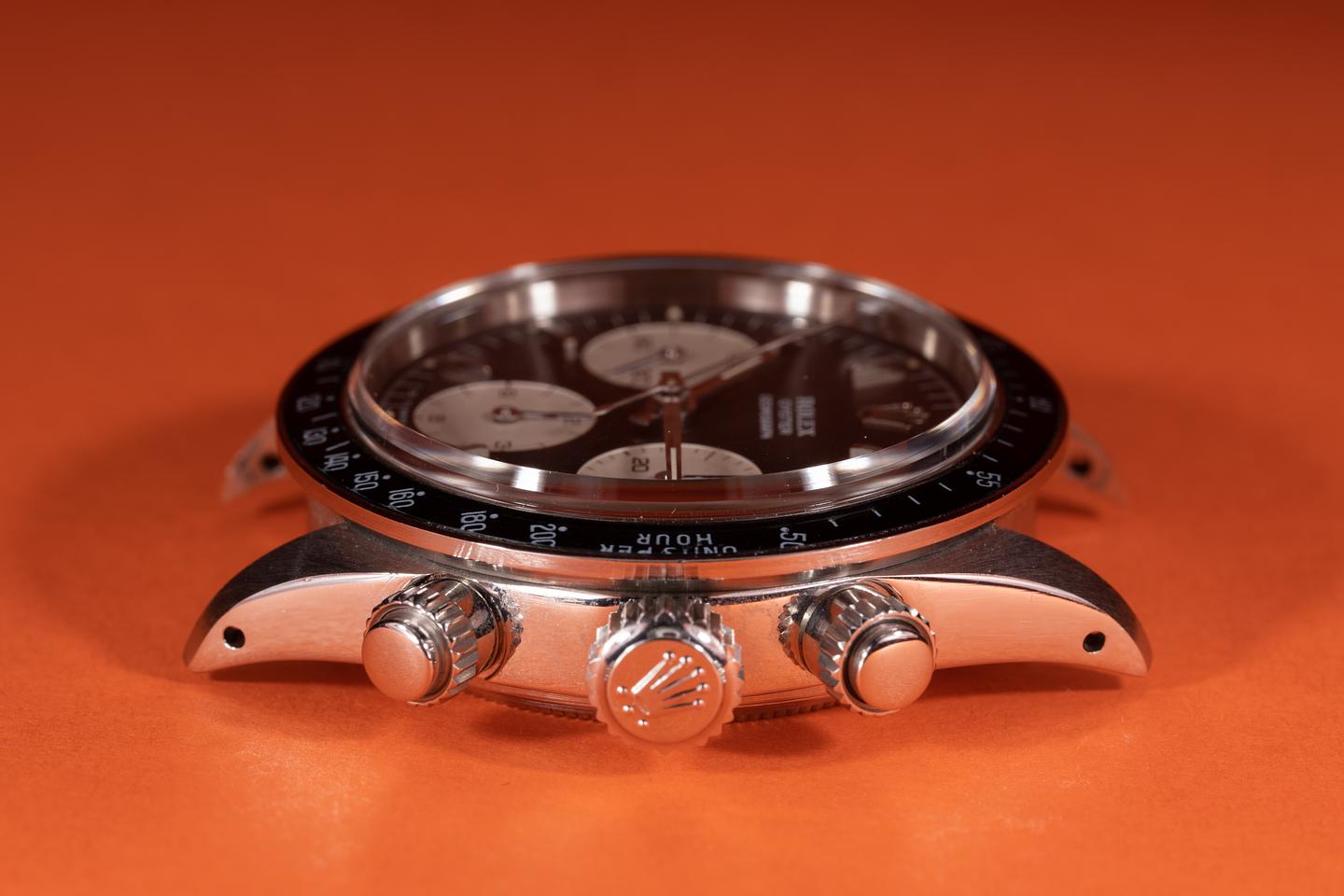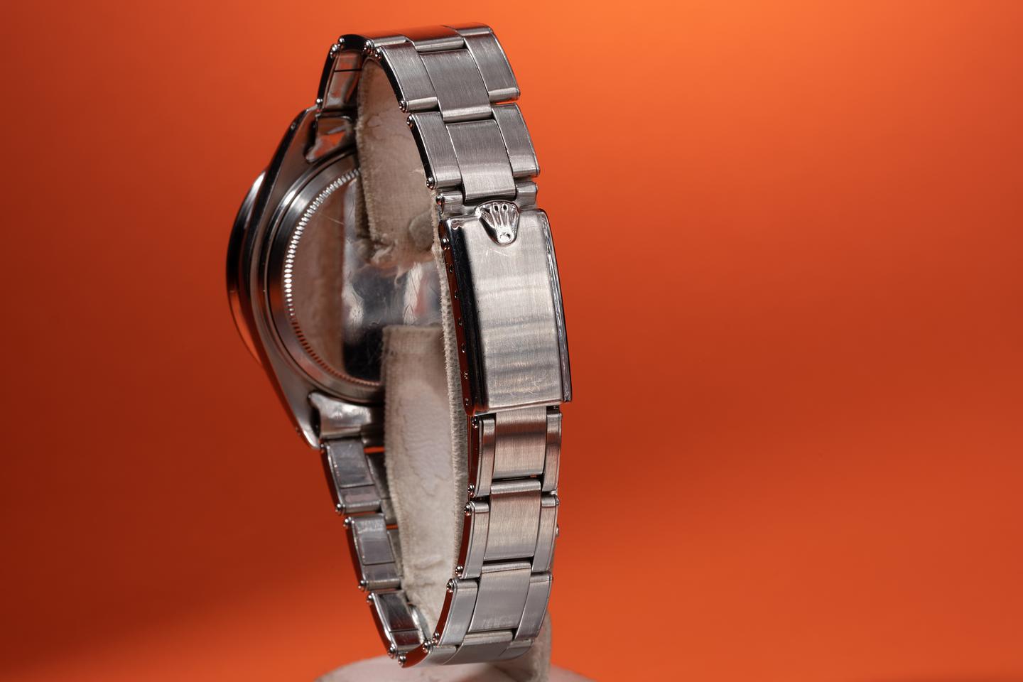 Case: The sharp recently polished case is excellent showing only very light wear from, use. The black bezel is also in excellent condition showing some light wear from use. There is some light cracking to the back of the insert around the 100 and the 65 index. This is considered normal for inserts of this age.