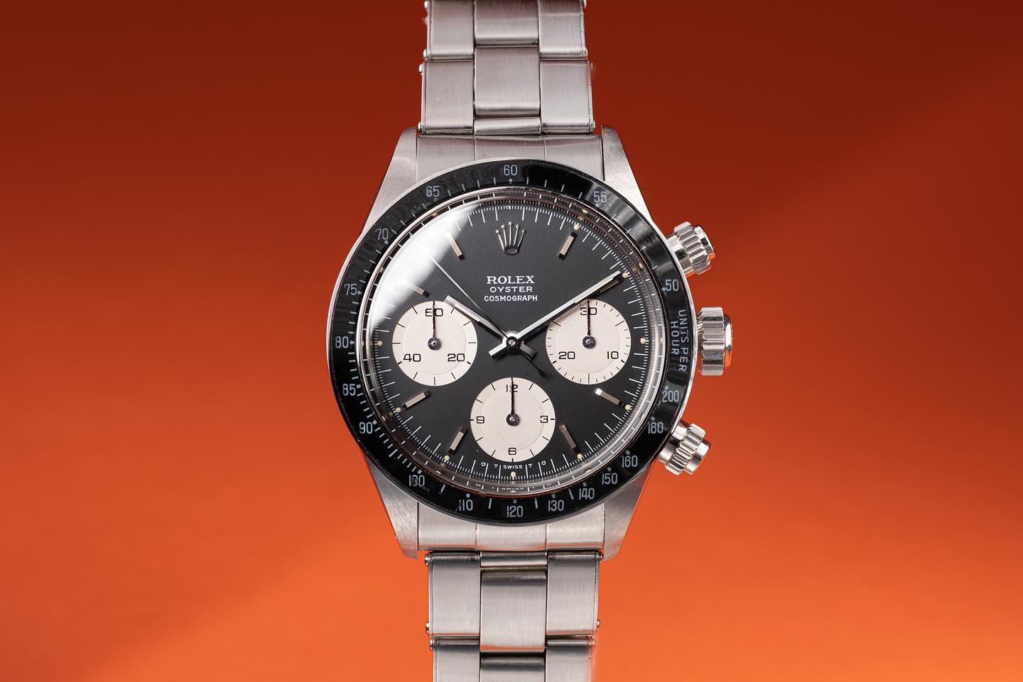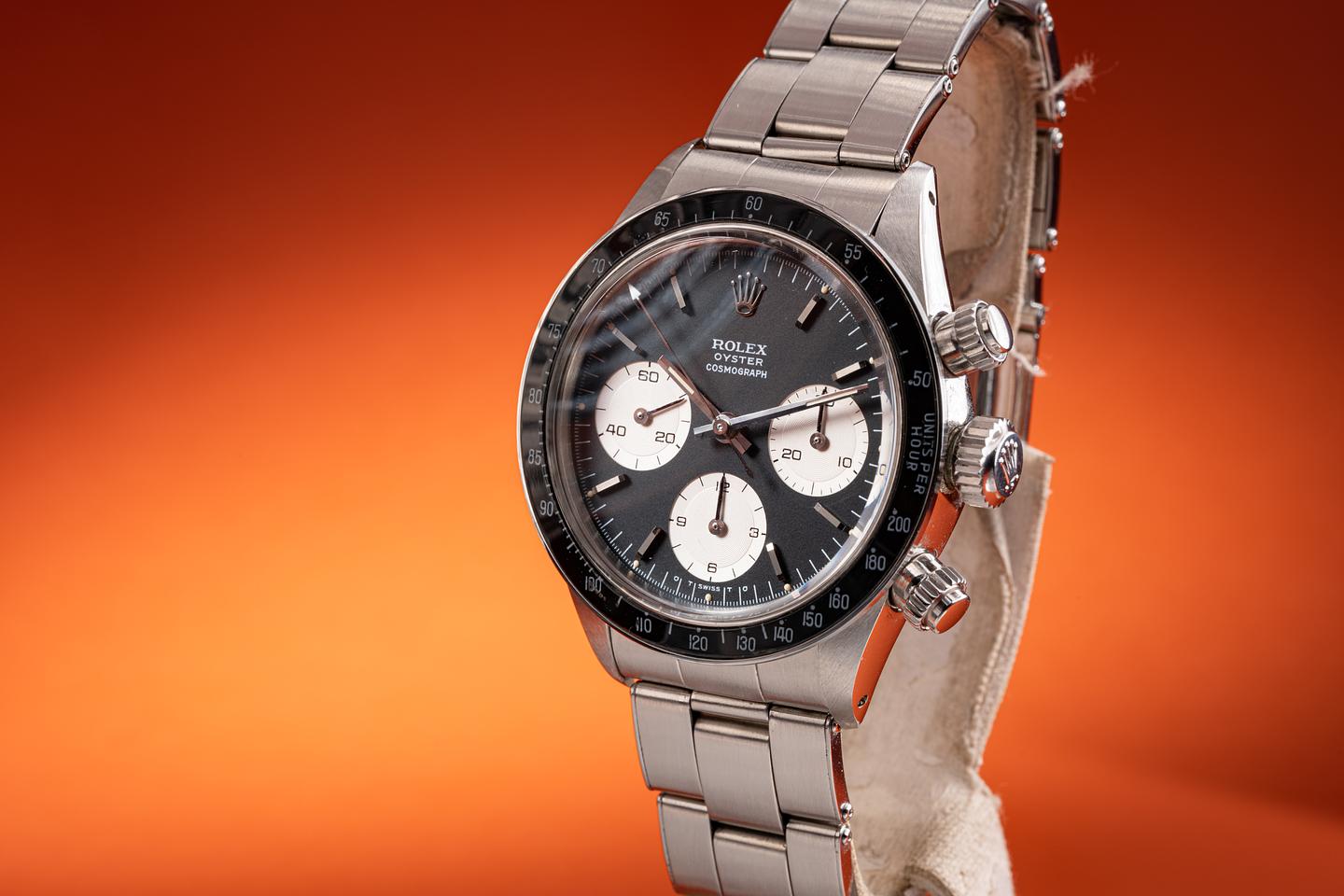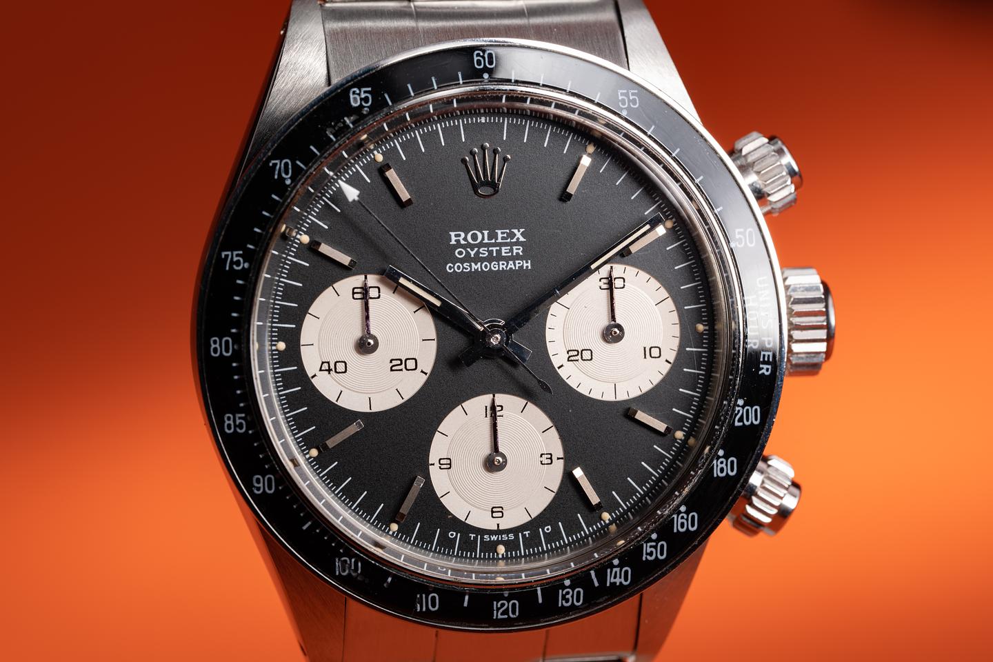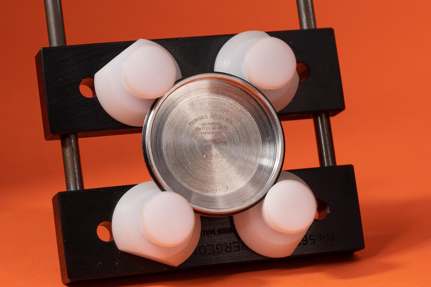 Case: The sharp recently polished case is excellent showing only very light wear from, use. The black bezel is also in excellent condition showing some light wear from use. There is some light cracking to the back of the insert around the 100 and the 65 index. This is considered normal for inserts of this age.