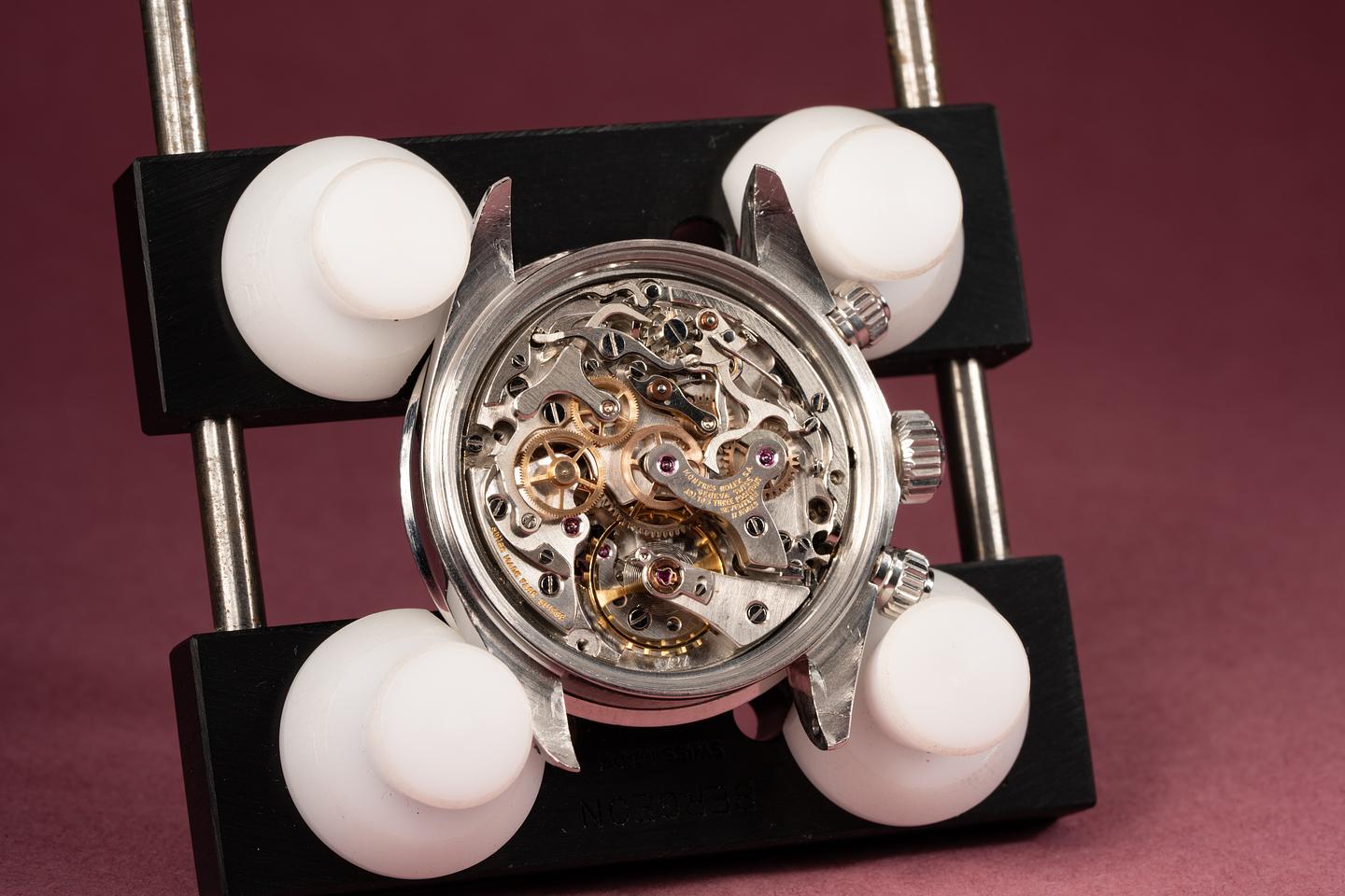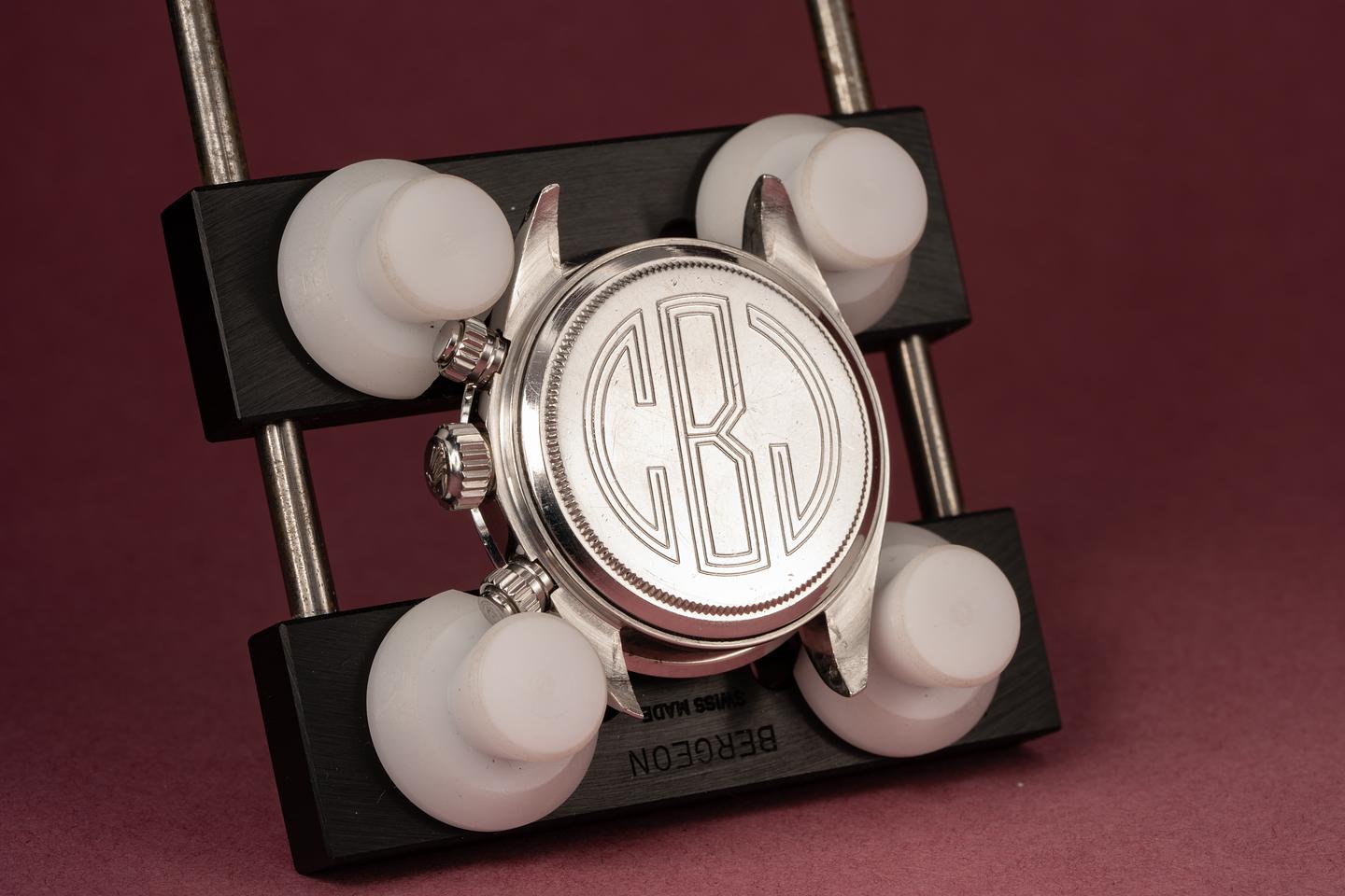 Case: The previously polished case is in excellent condition and shows light wear from use. The stainless bezel is also in excellent condition and shows some wear from use. The pushers are newer service units. The casebook has a super cool engraving from the previous owner.