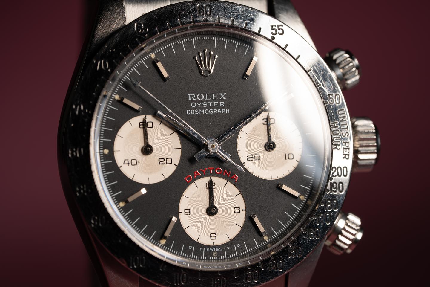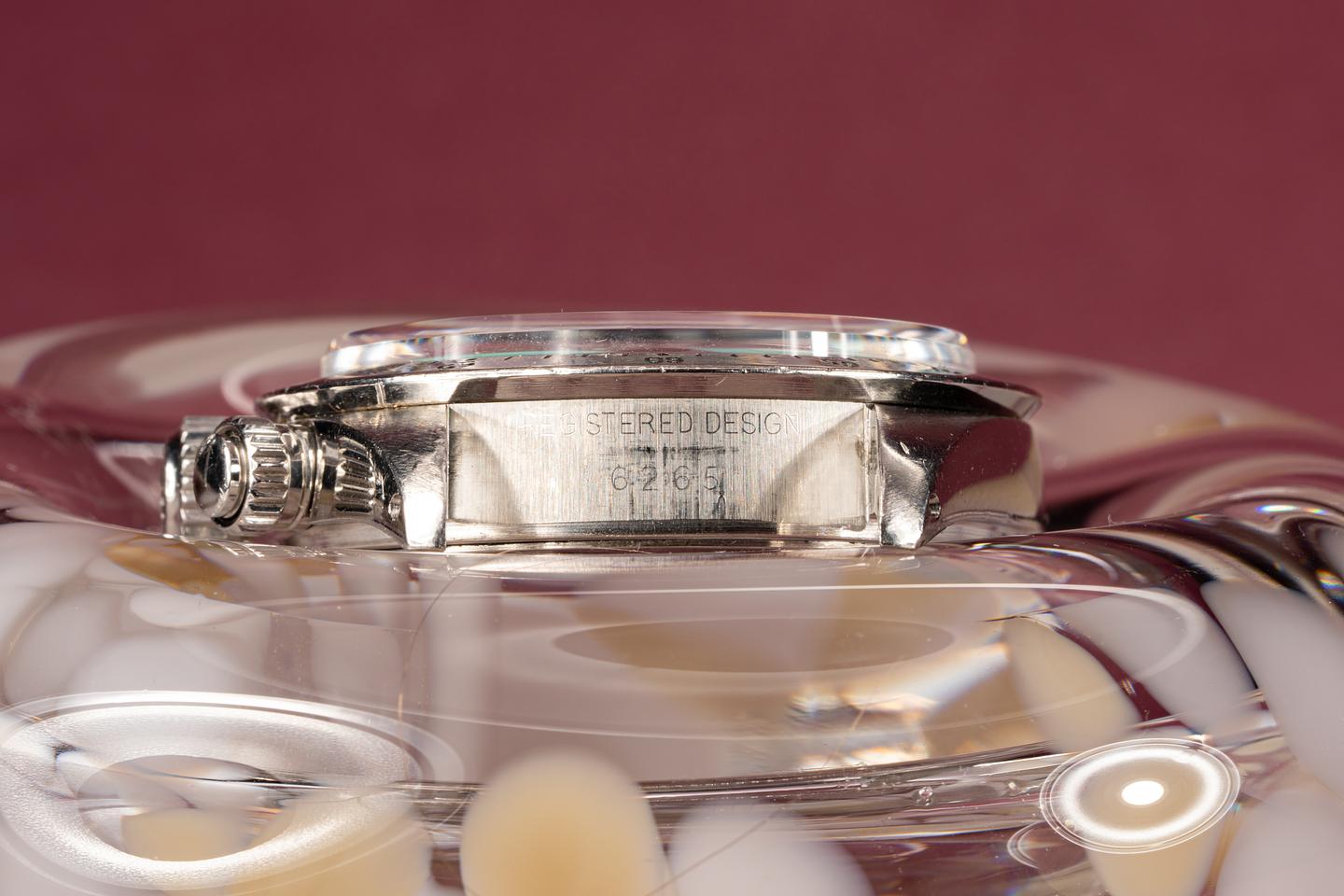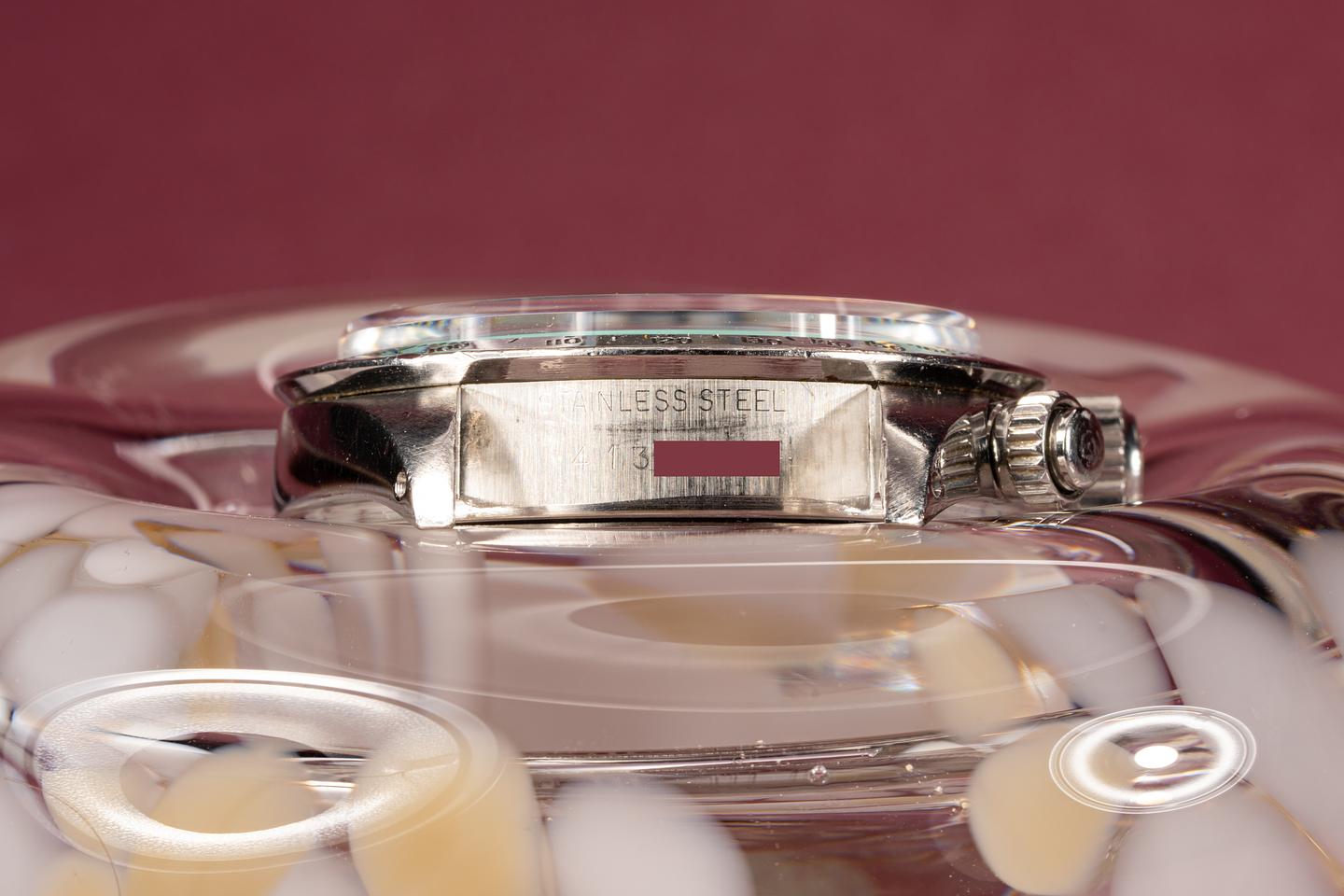 Dial: The big red sigma dial is in excellent condition with some sparse and light speckling patina. While all the lume plots have lost most or all of their luminous material, what remains has turned a warm creamy hue. The subdials have some light scratches from earlier services. The hands have aged to a dark sage hue. All lume glows at the same rate when exposed to UV.