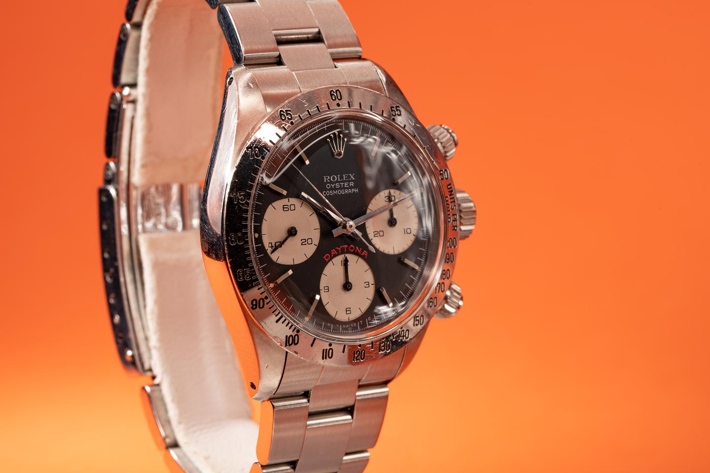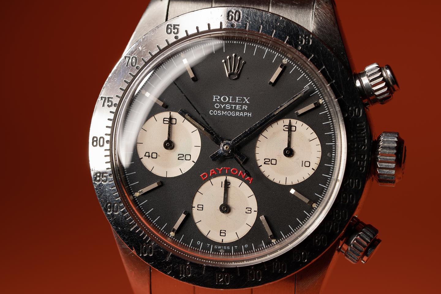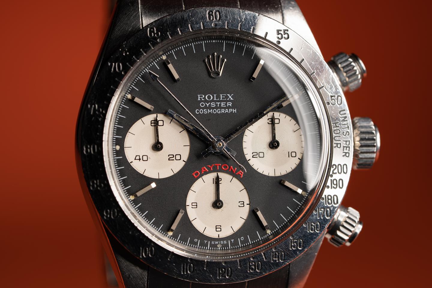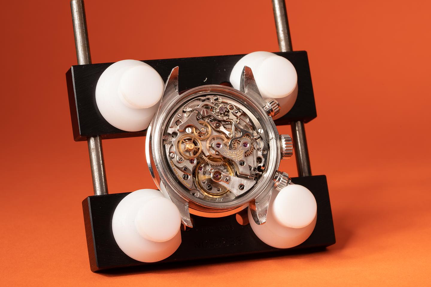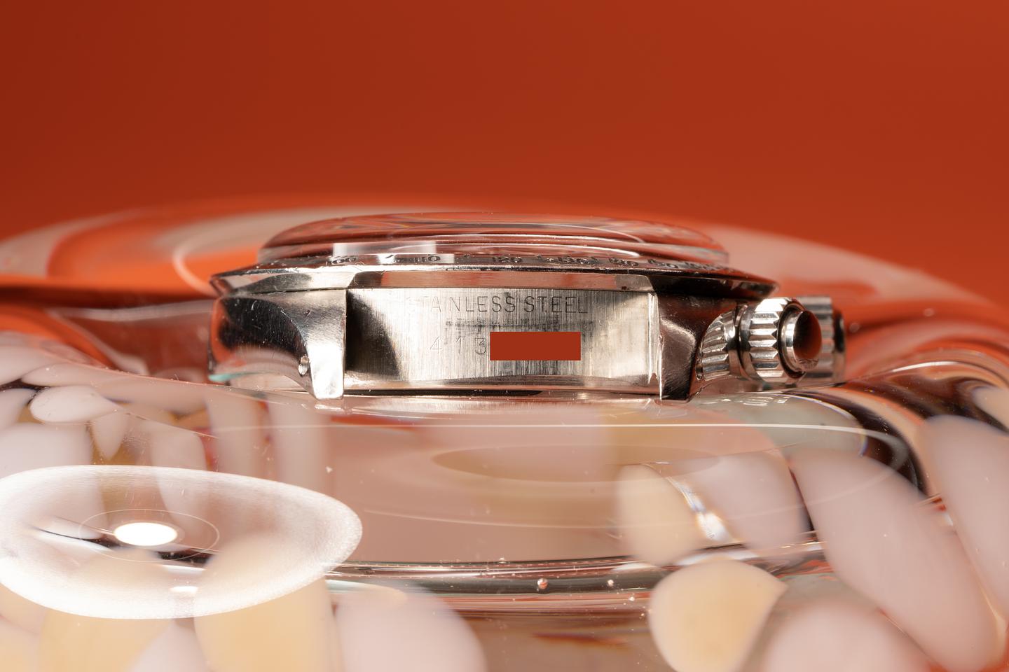 Dial: The big red sigma dial is in excellent condition with some sparse and light speckling patina. While all the lume plots have lost most or all of their luminous material, what remains has turned a warm creamy hue. The subdials have some light scratches from earlier services. The hands have aged to a dark sage hue. All lume glows at the same rate when exposed to UV which is correct for this dial.