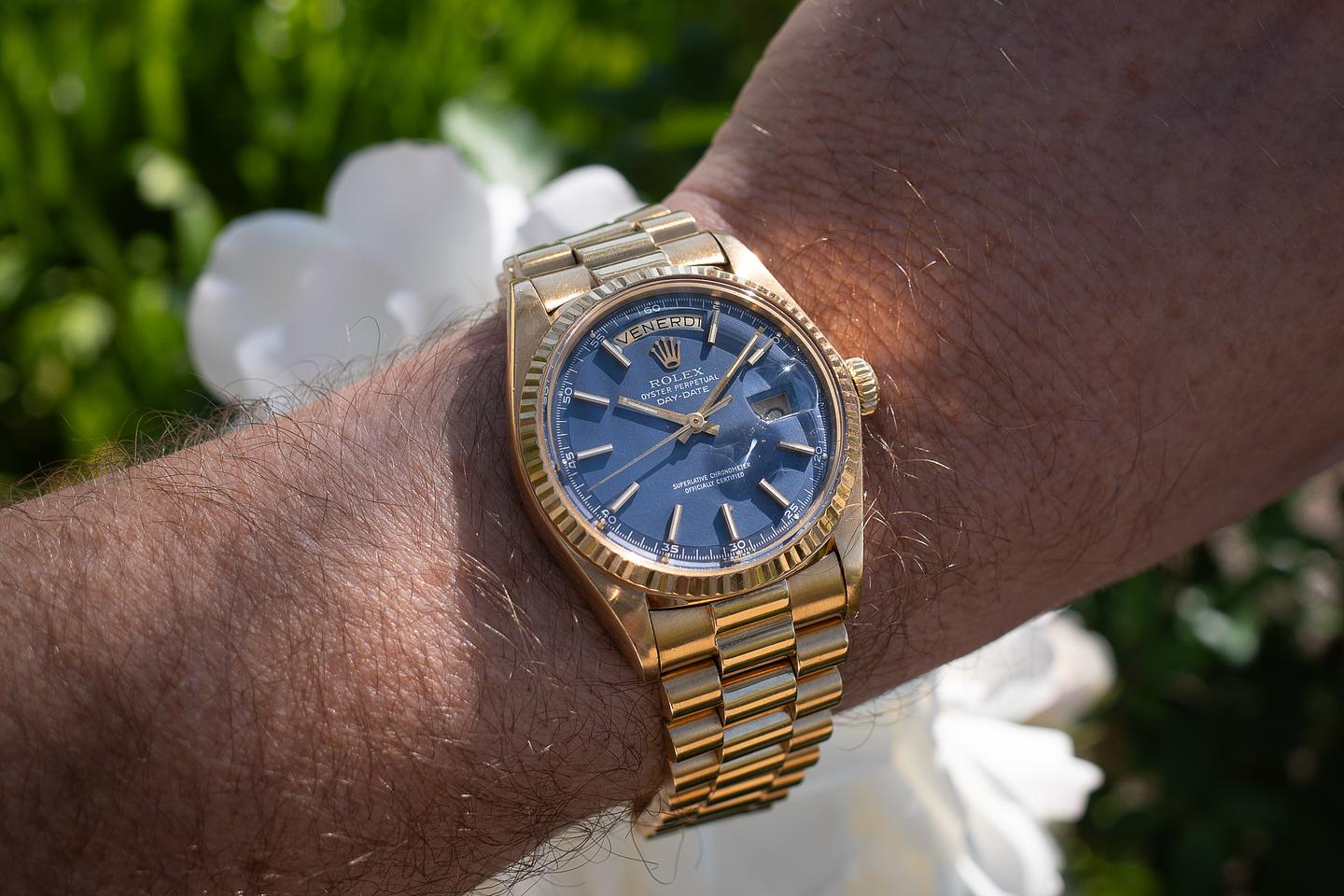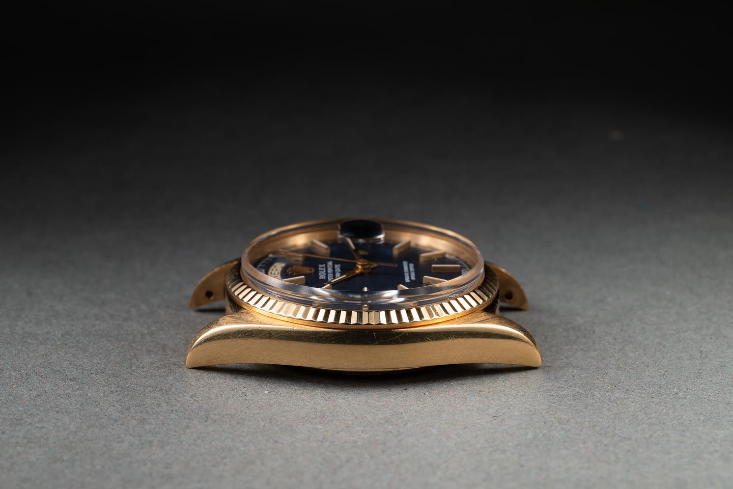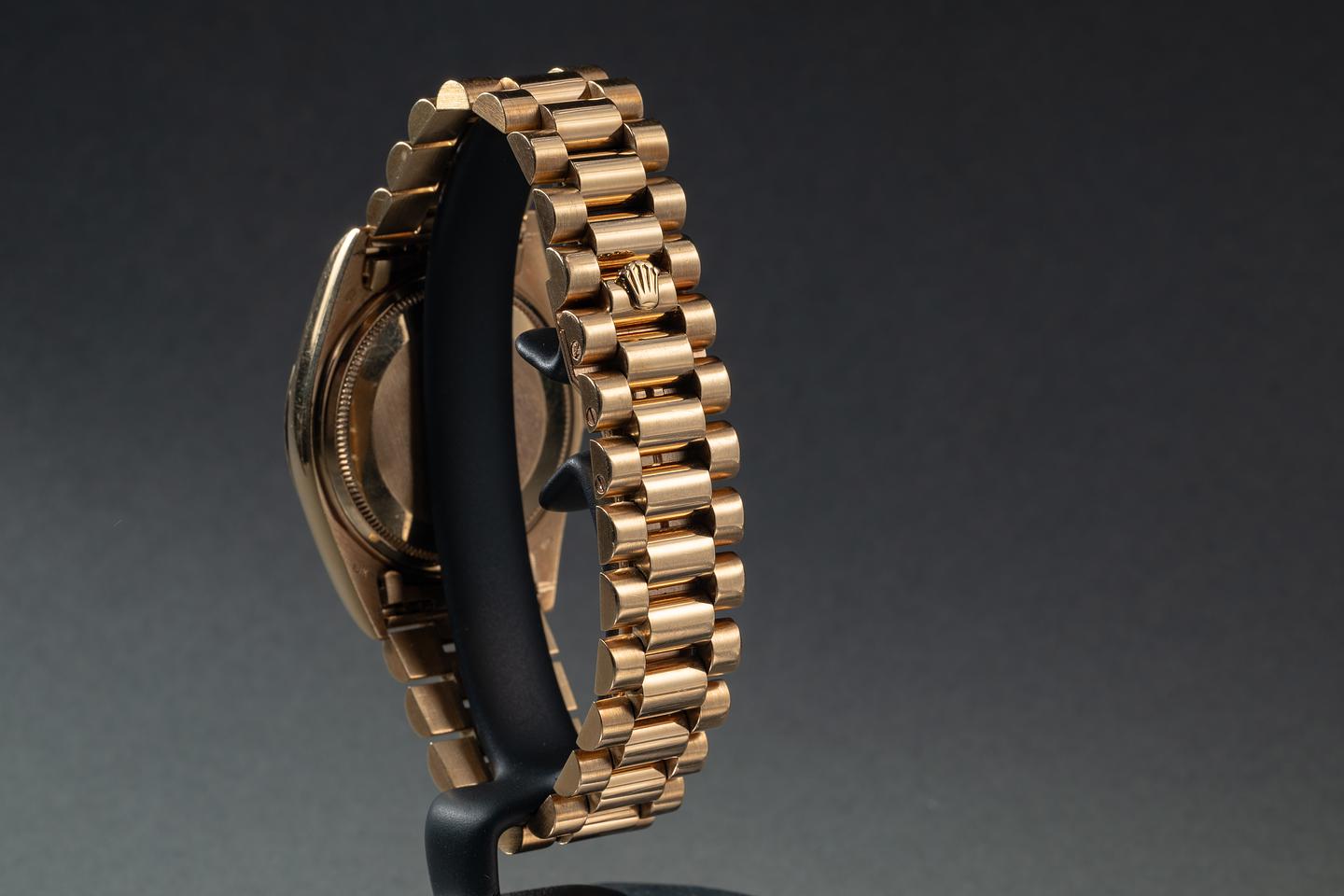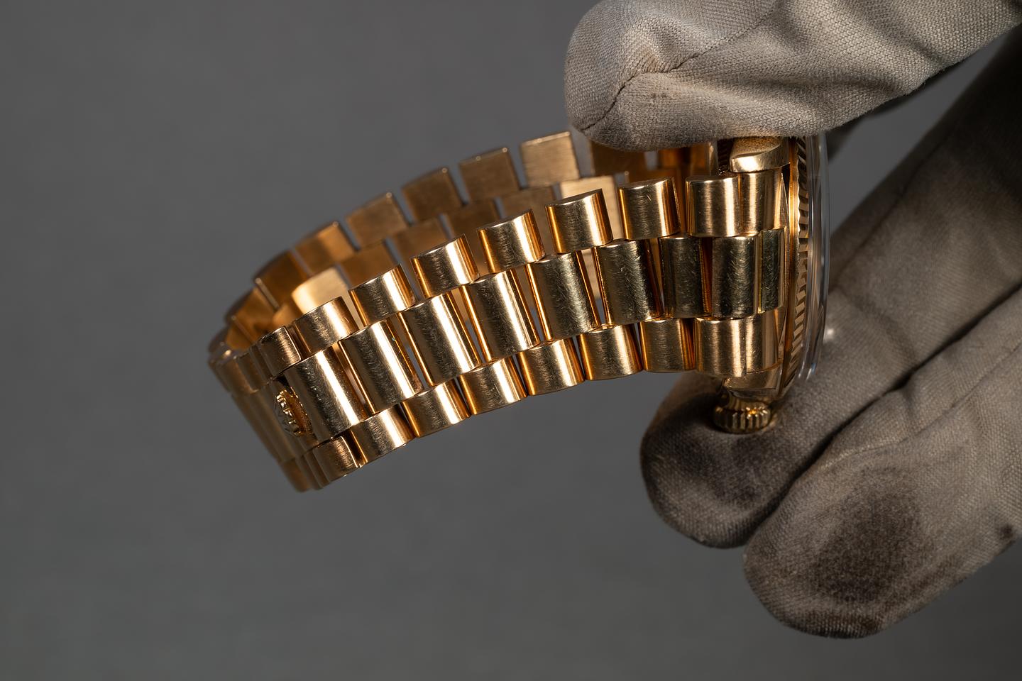 Bracelet: The 20-link 18K yellow gold president bracelet is excellent, showing only very light stretch for its age.