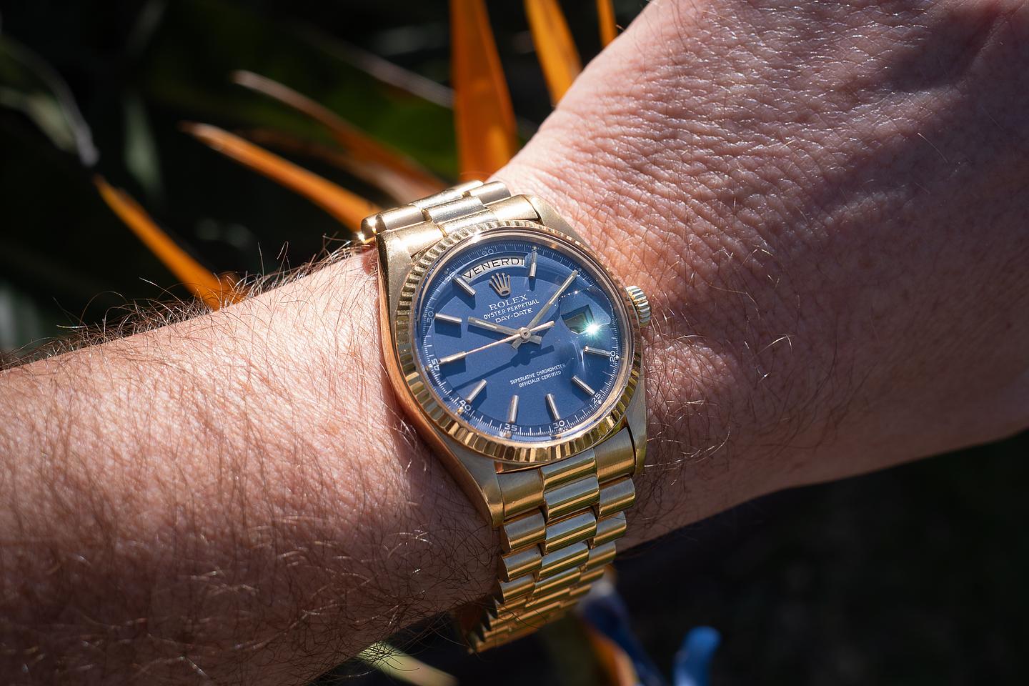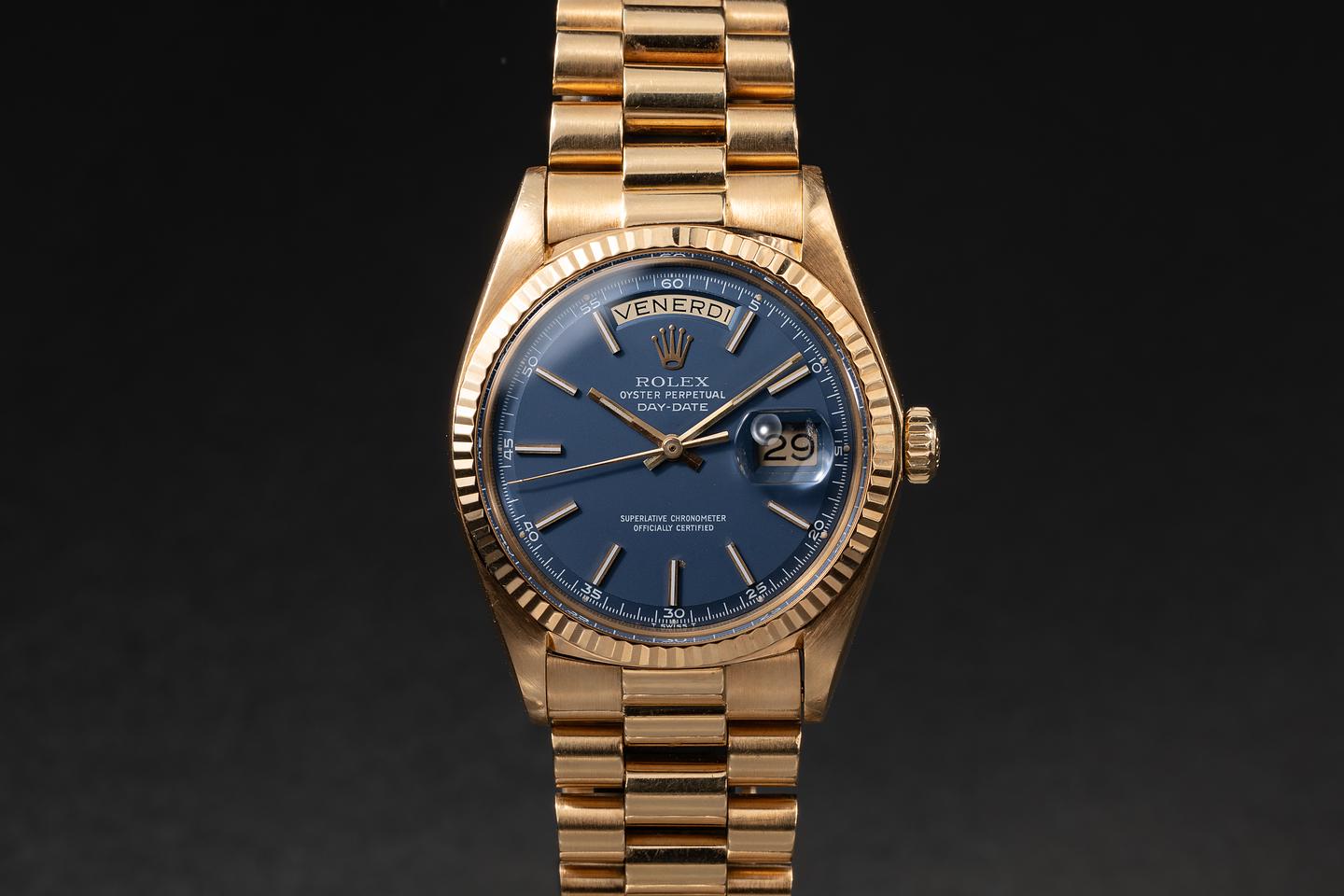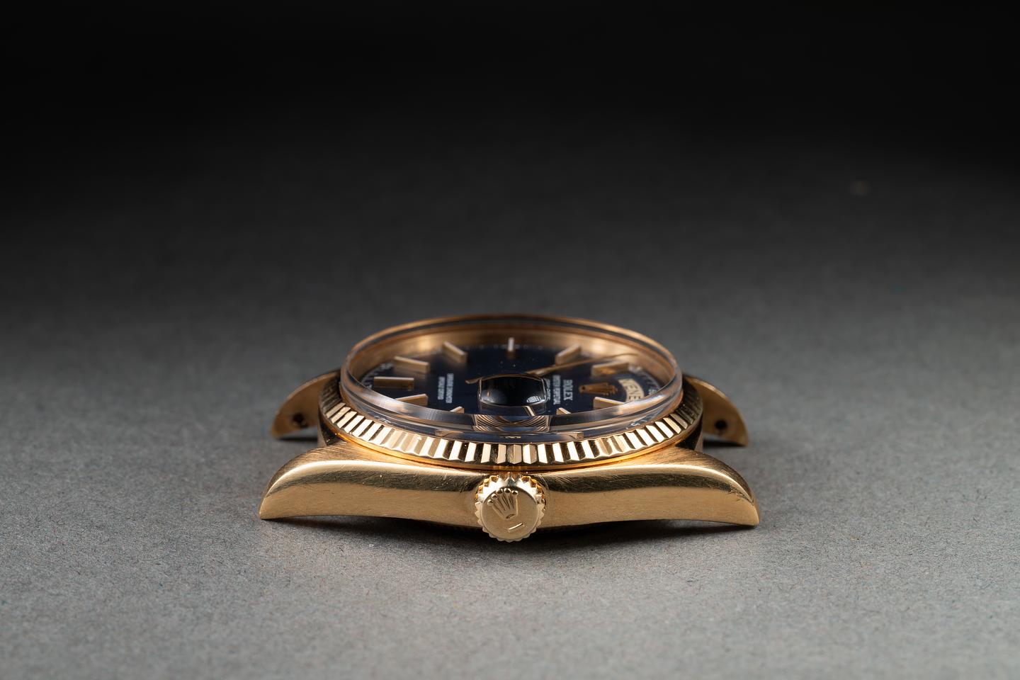 Bracelet: The 20-link 18K yellow gold president bracelet is excellent, showing only very light stretch for its age.