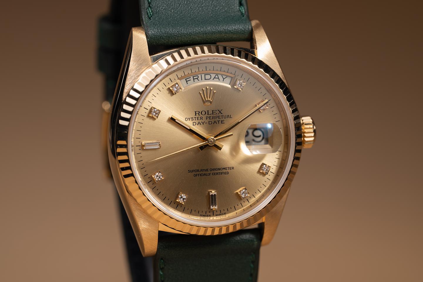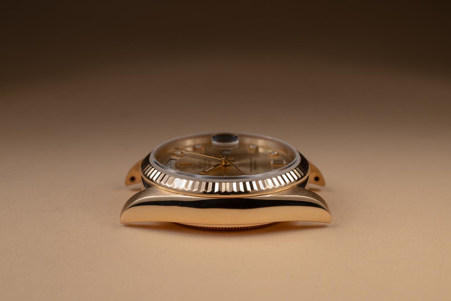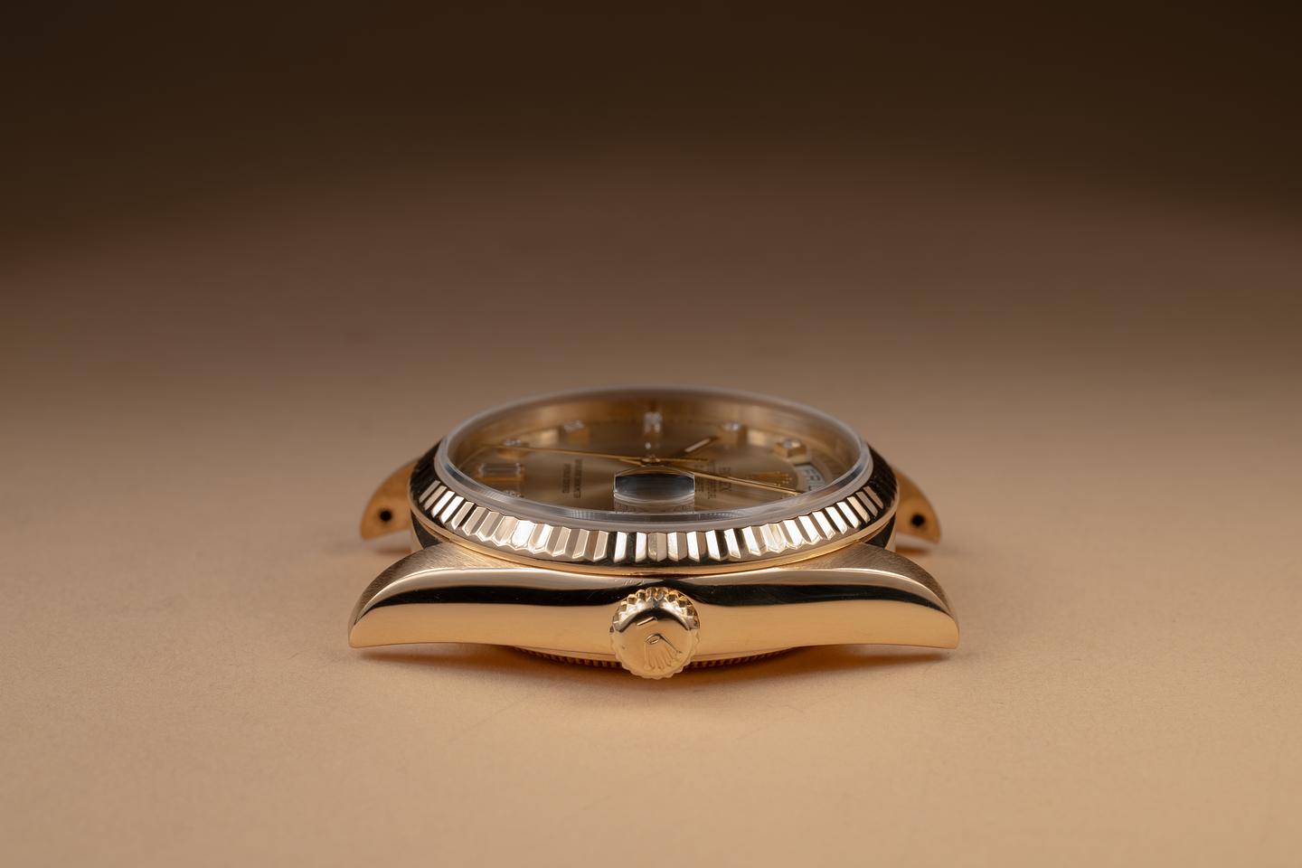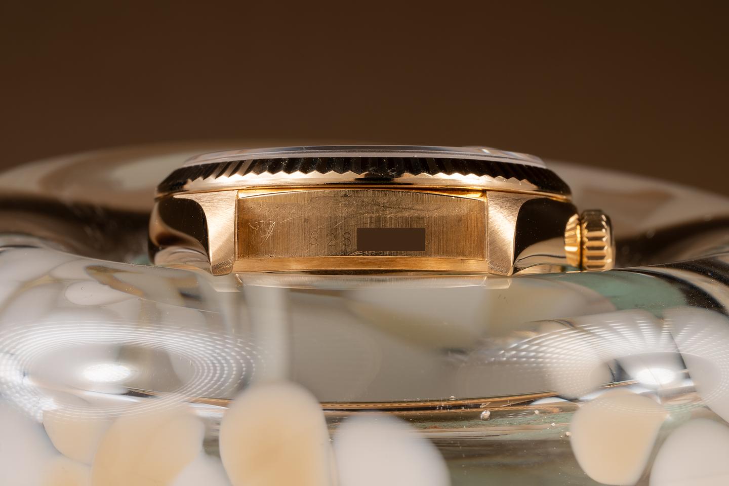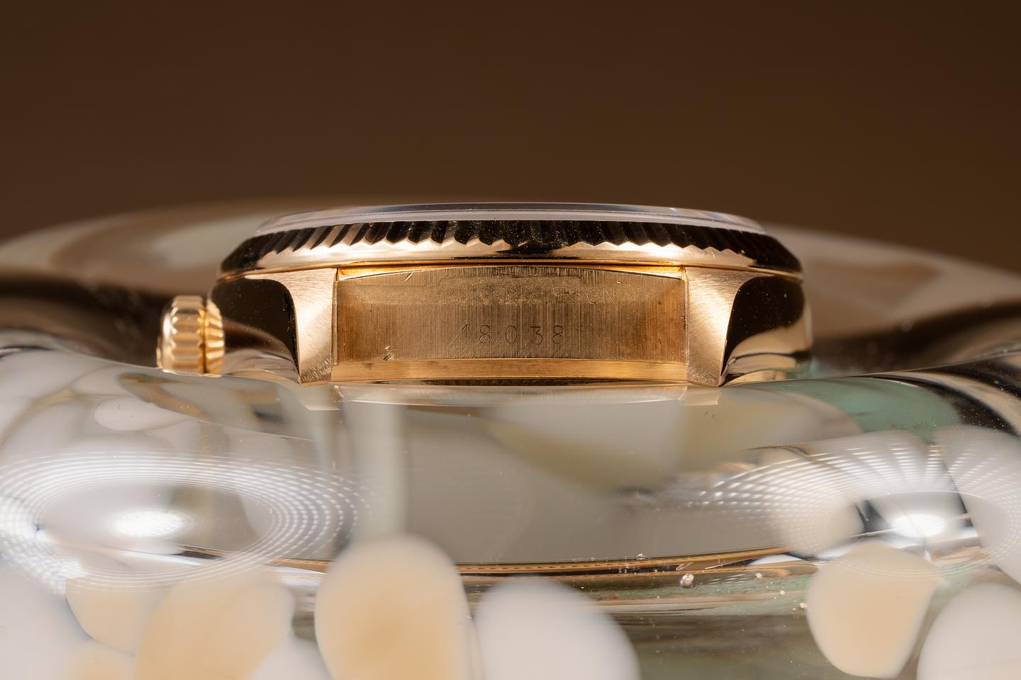 Case: The freshly polished 18K yellow gold case is in excellent condition. The sharp, 18K yellow gold fluted bezel is also in excellent, freshly polished condition.
