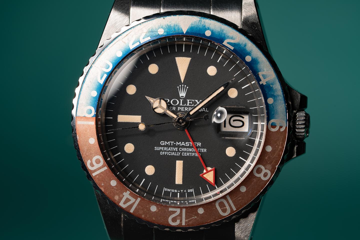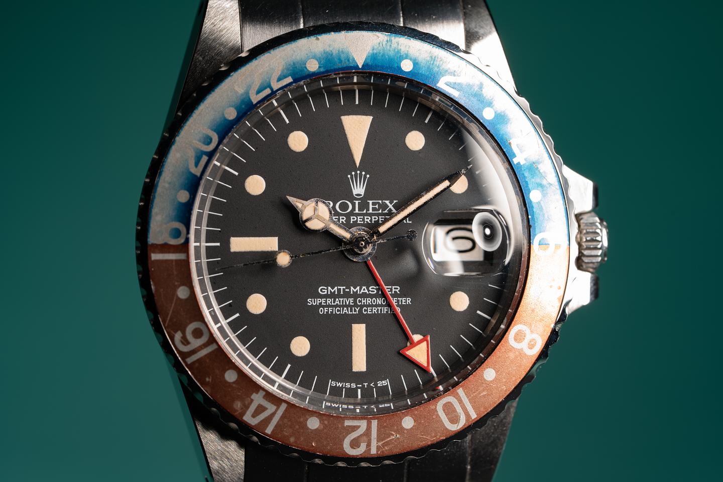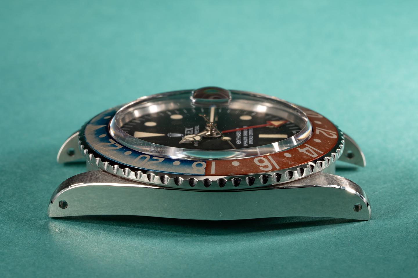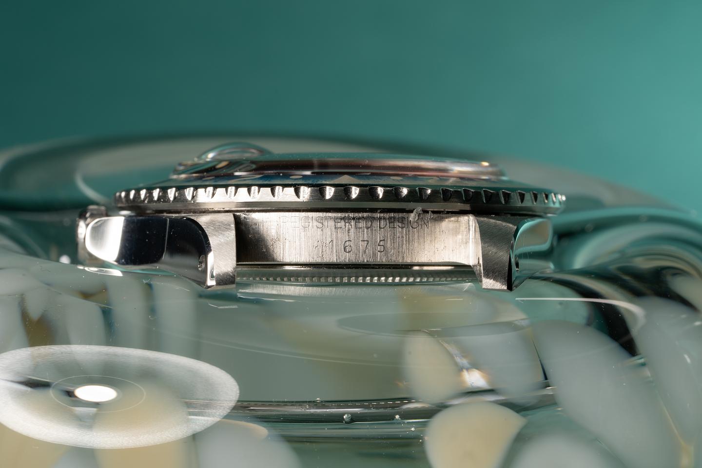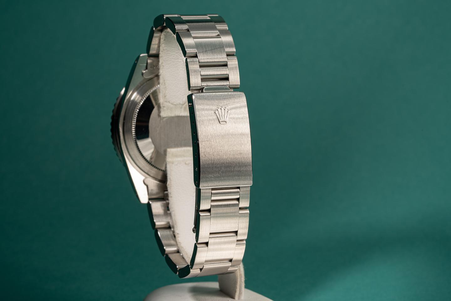Dial: The matte black radial dial is in excellent condition and show little if any wear. The lume has aged to a warm creamy hue and the hands are matching. The GMT hand is an all red Rolex service unit.