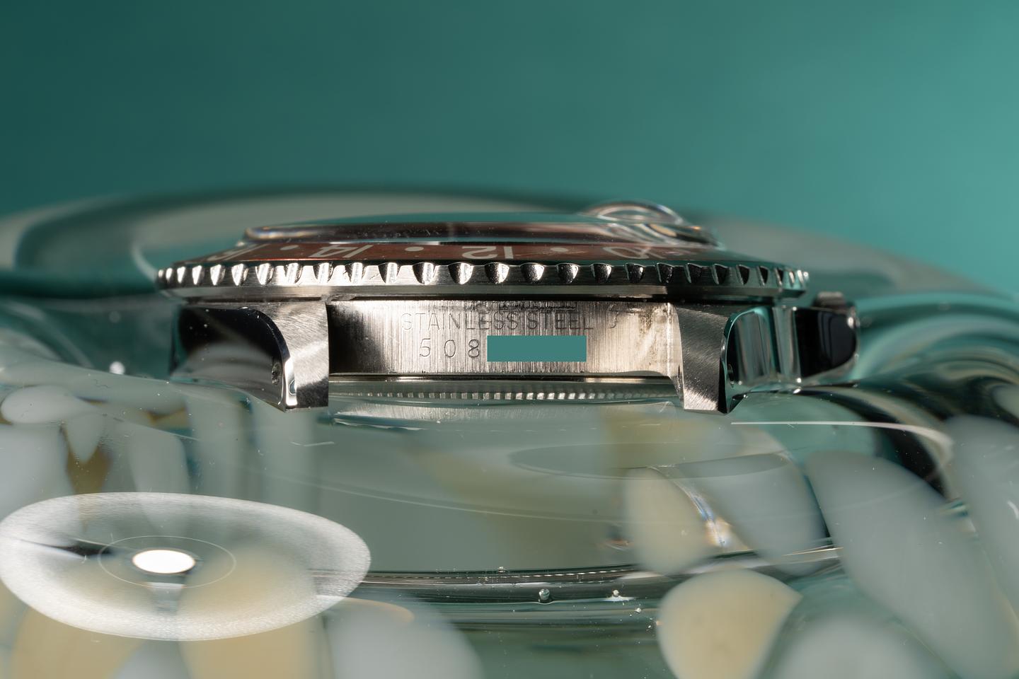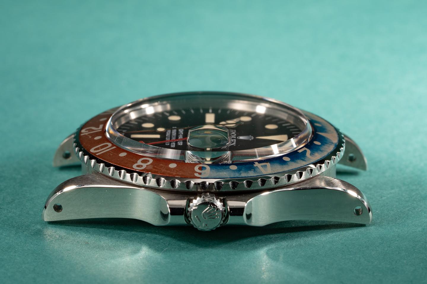 Case: The case is very clean and has recently been polished with sharp prominent bevels. The red and blue portions of the bezel insert are fading at different rates. The blue portion is a graduated blue to silver fade, while the red portion has faded to a metallic salmon hue.