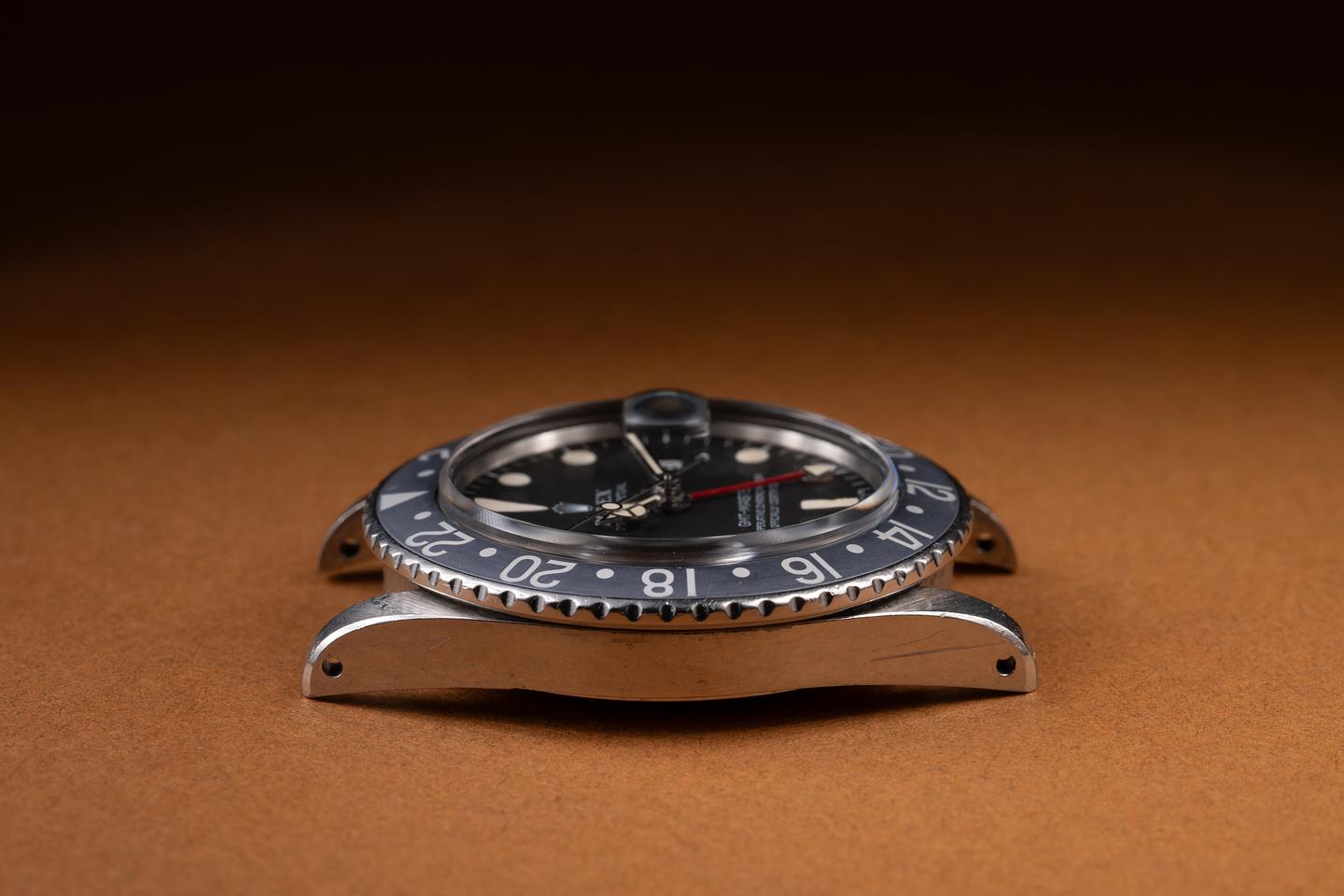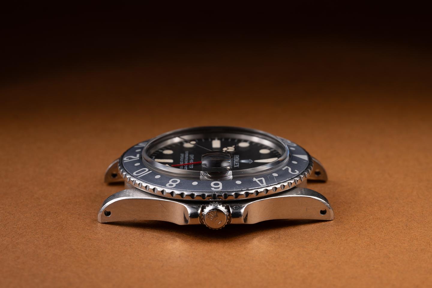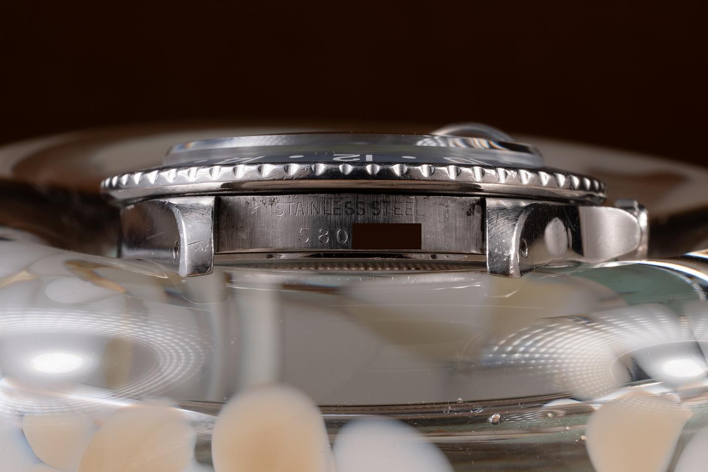 Case: The unpolished case is excellent, showing sharp, prominent factory bevels and some light wear from use. The black bezel insert is also in excellent condition and has faded to a light silvery navy blue hue, showing only light wear from use.