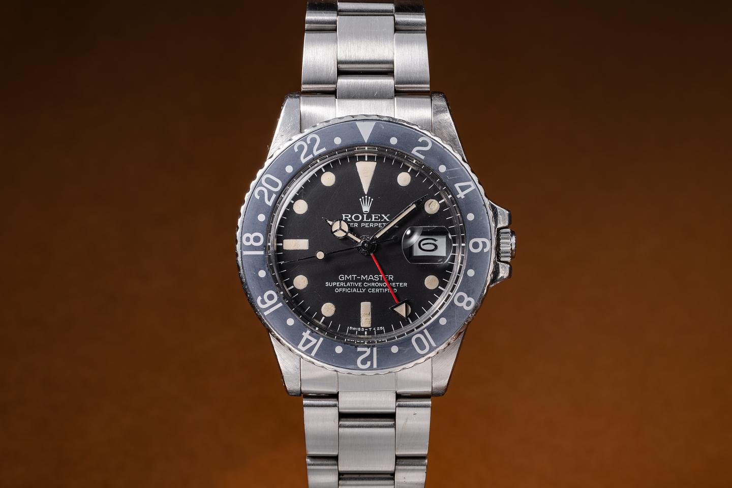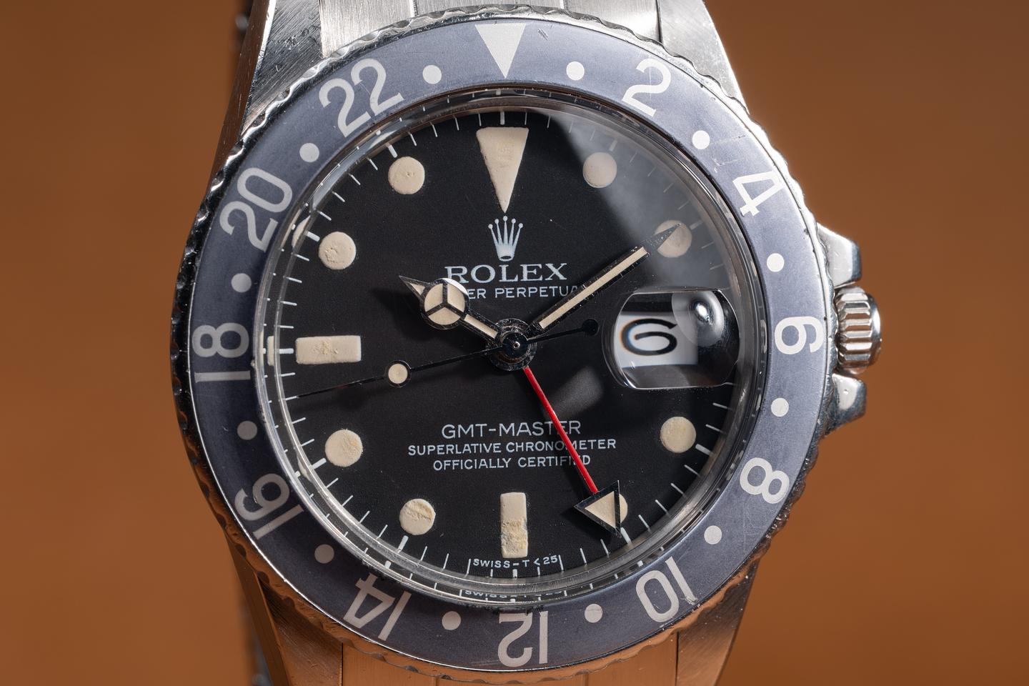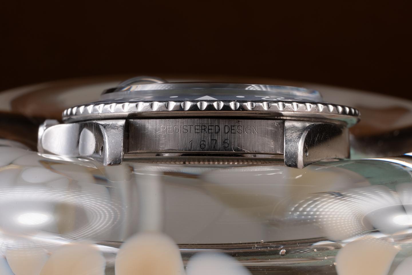Case: The unpolished case is excellent, showing sharp, prominent factory bevels and some light wear from use. The black bezel insert is also in excellent condition and has faded to a light silvery navy blue hue, showing only light wear from use.