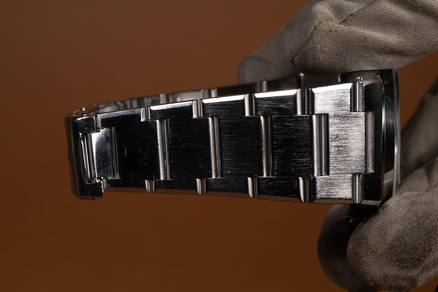 Case: The unpolished case is excellent, showing sharp, prominent factory beveling and some light wear from use. The unpolished smooth stainless bezel is also in excellent condition, showing some light wear from use.
