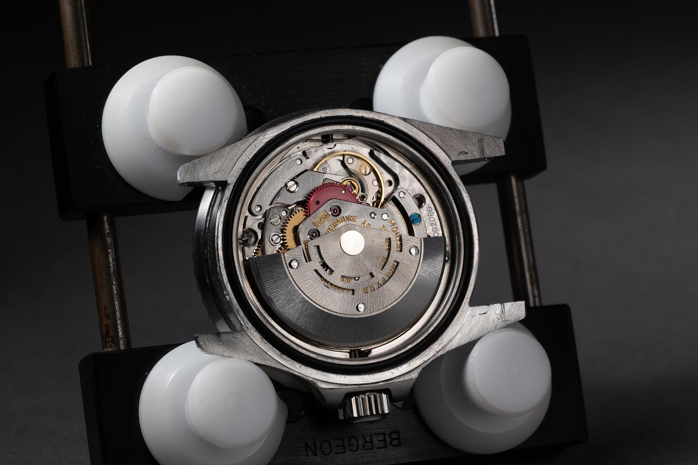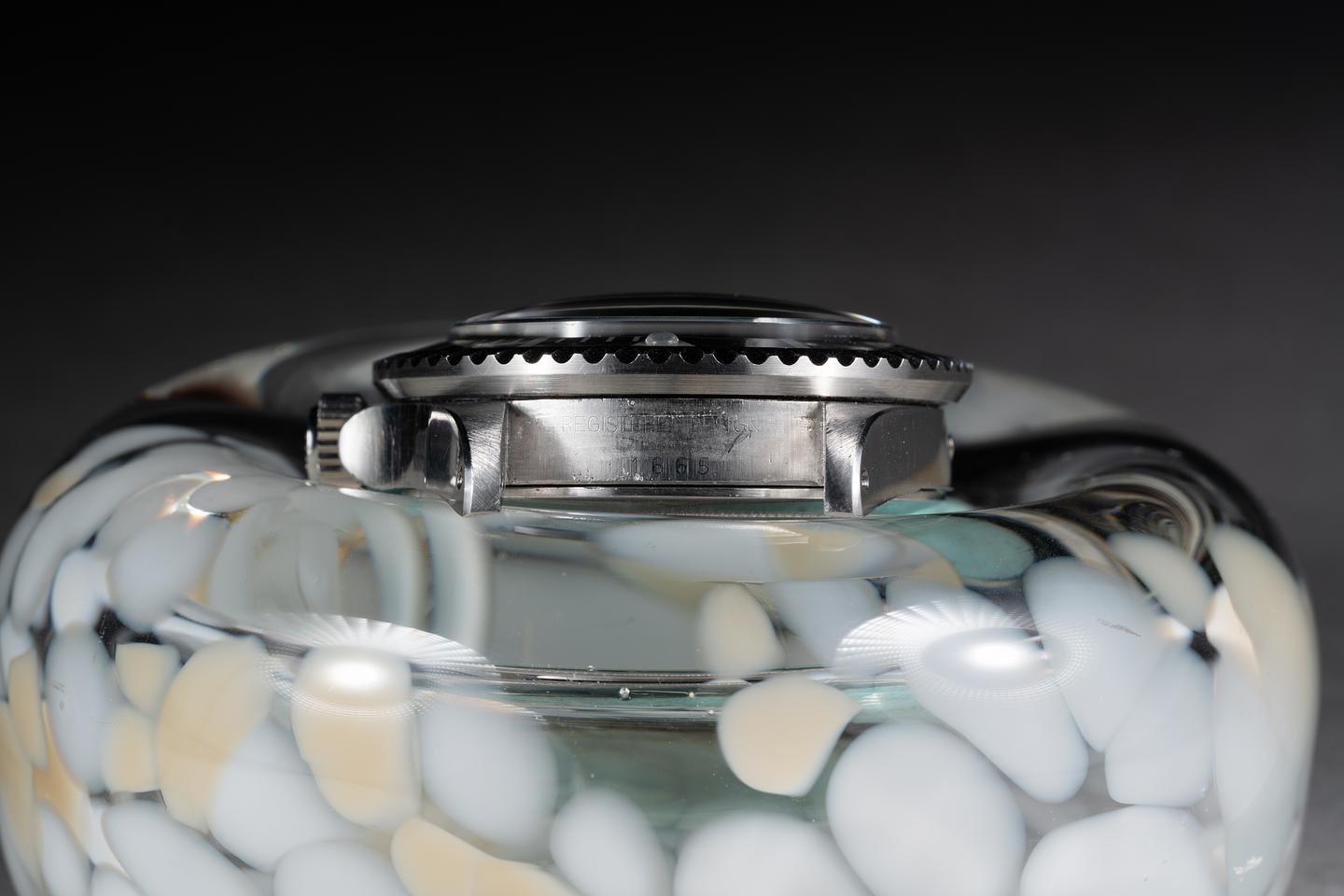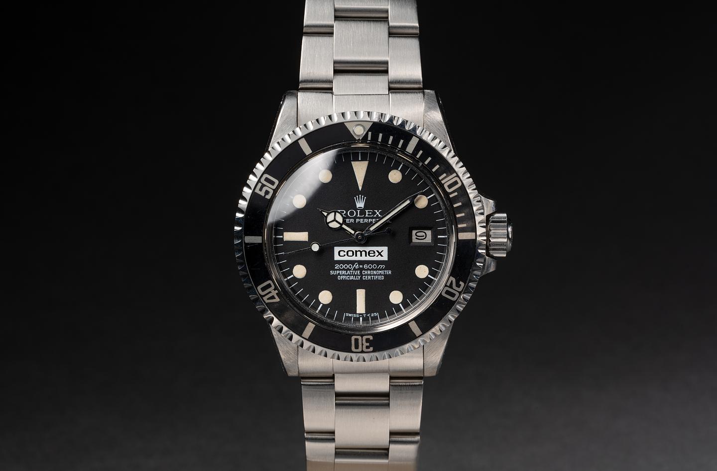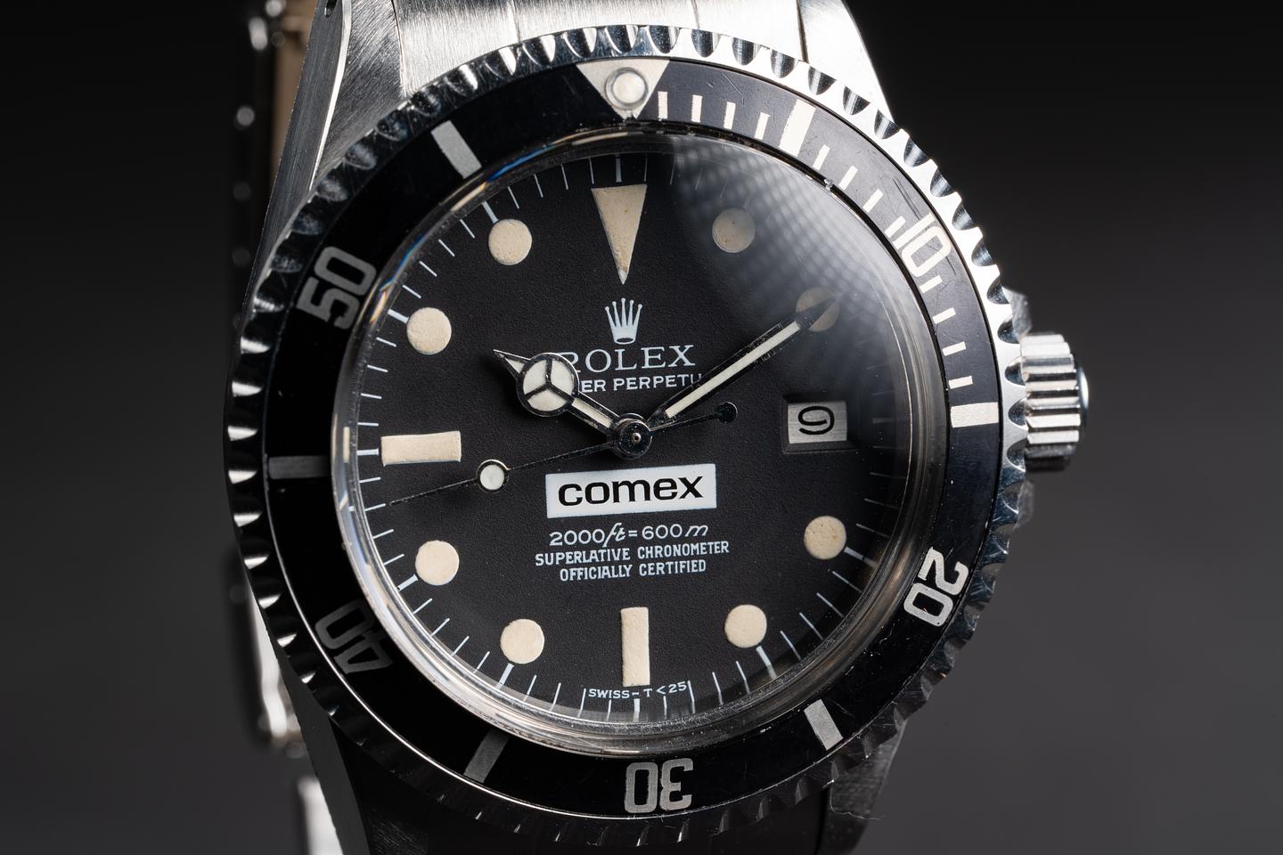 The mark I of the 1665 COMEX dials, with its unique characteristics, such as the 600 meters depth ratings and unique coronet."