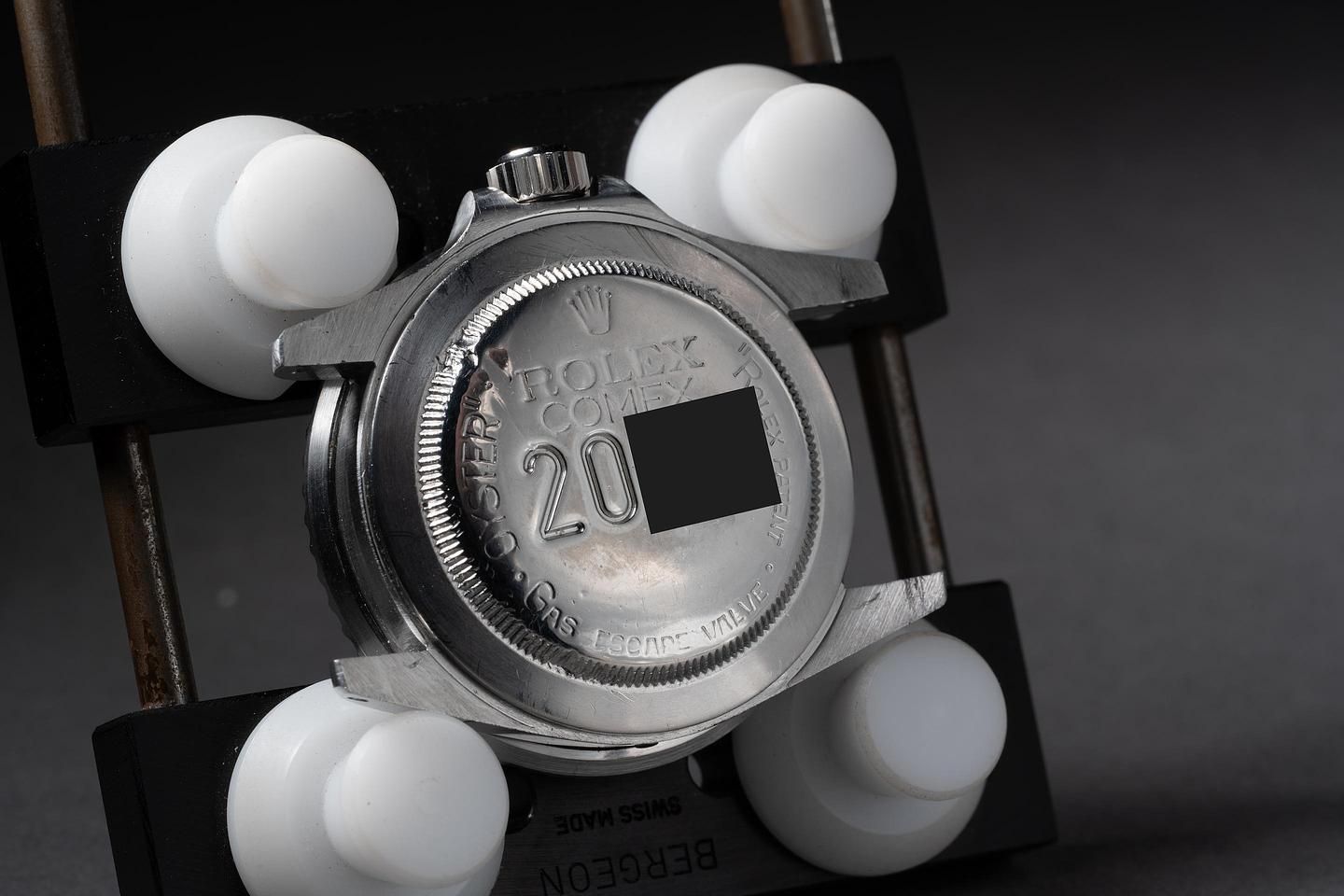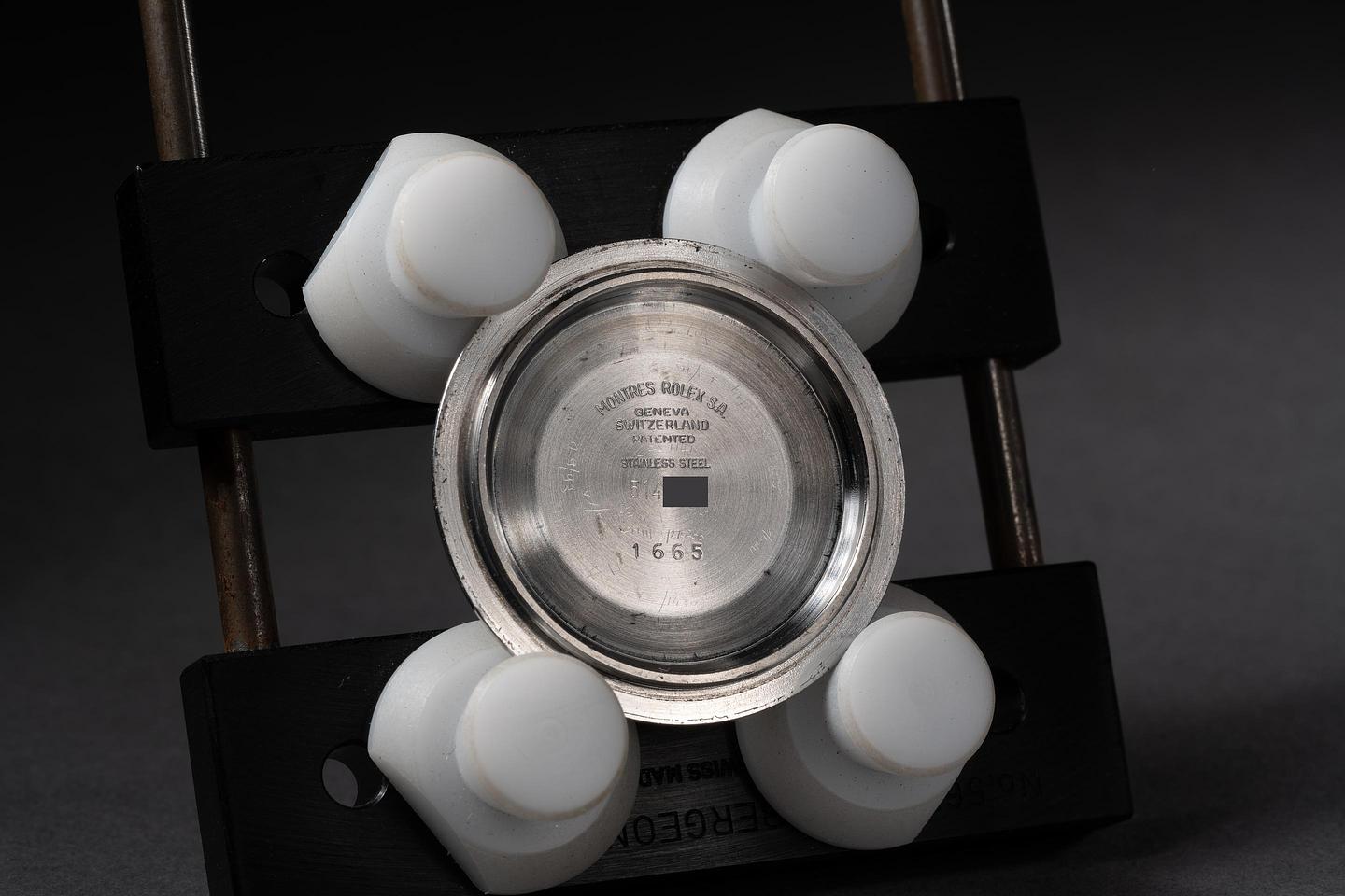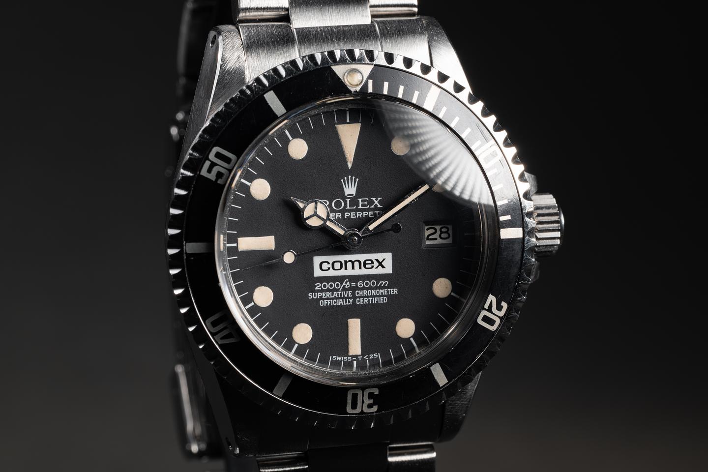 The mark I of the 1665 COMEX dials, with its unique characteristics, such as the 600 meters depth ratings and unique coronet."