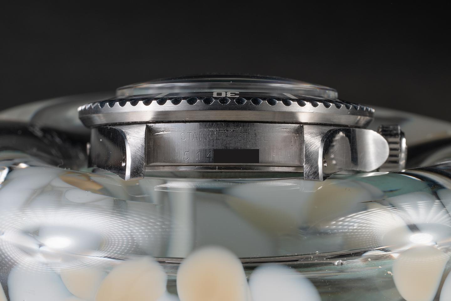 Case: The previously polished case is very good, showing sharp, prominent bevels and only light wear from use. The black bezel insert is in excellent condition showing only very light wear from use.
