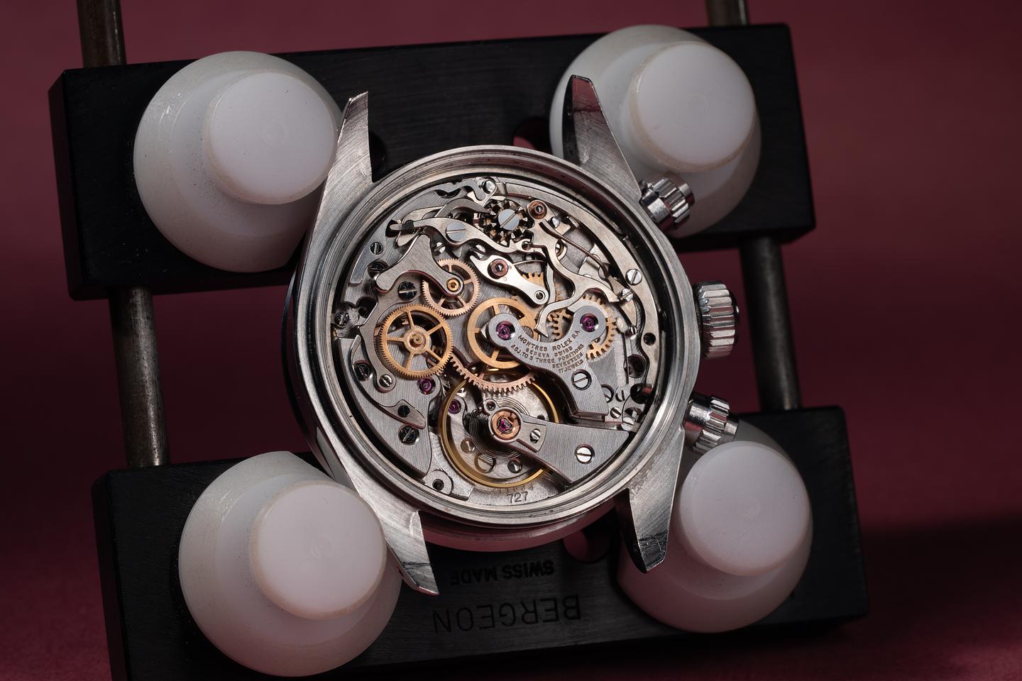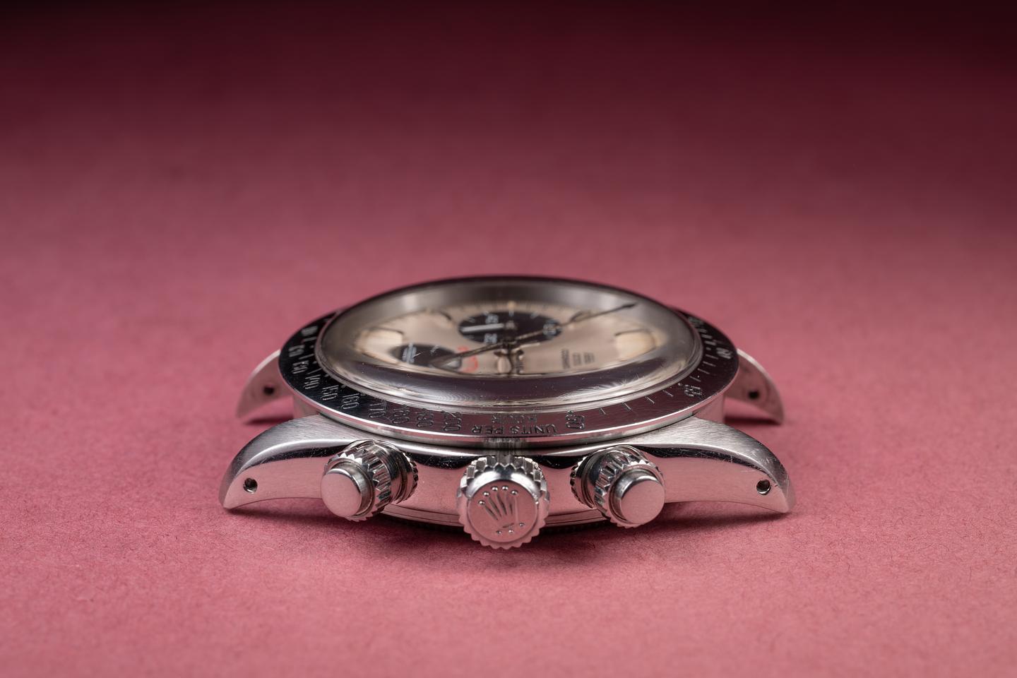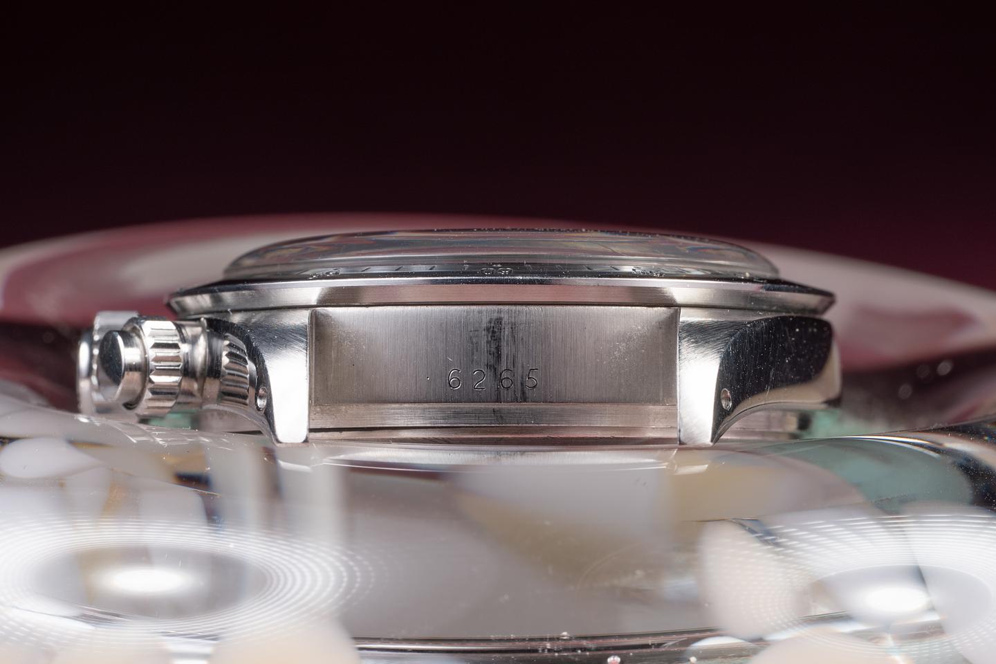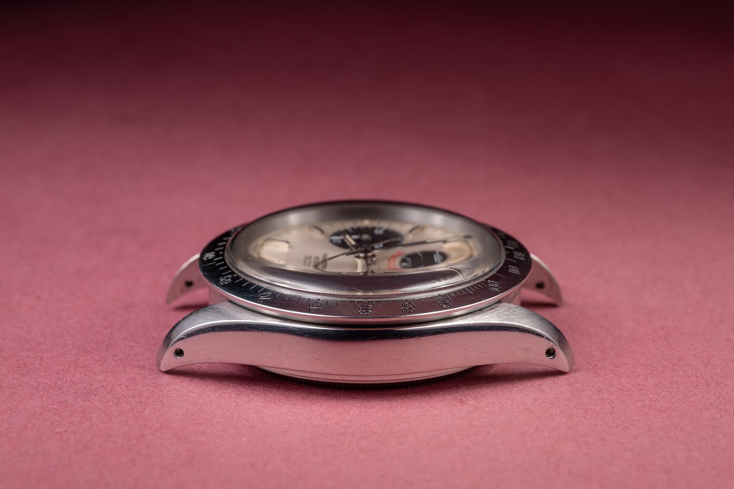 Dial: The silver "Big red" dial is excellent, showing only very light wear for its age. All lume plots are present and intact and have aged to a warm, creamy hue. The lume on the original factory hands matches perfectly. There is a tiny chip on the dial just next to the 10 index on the right subdial.