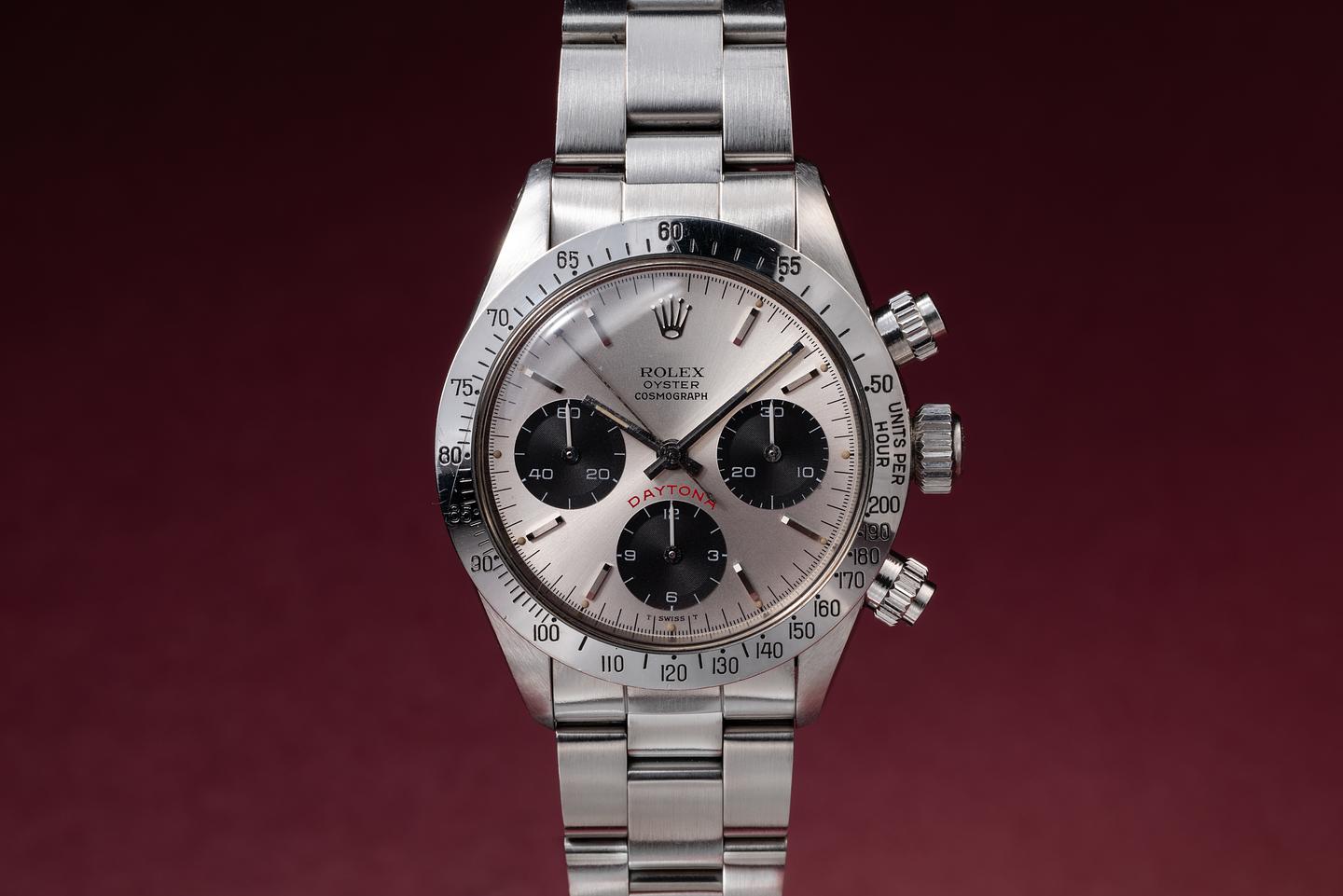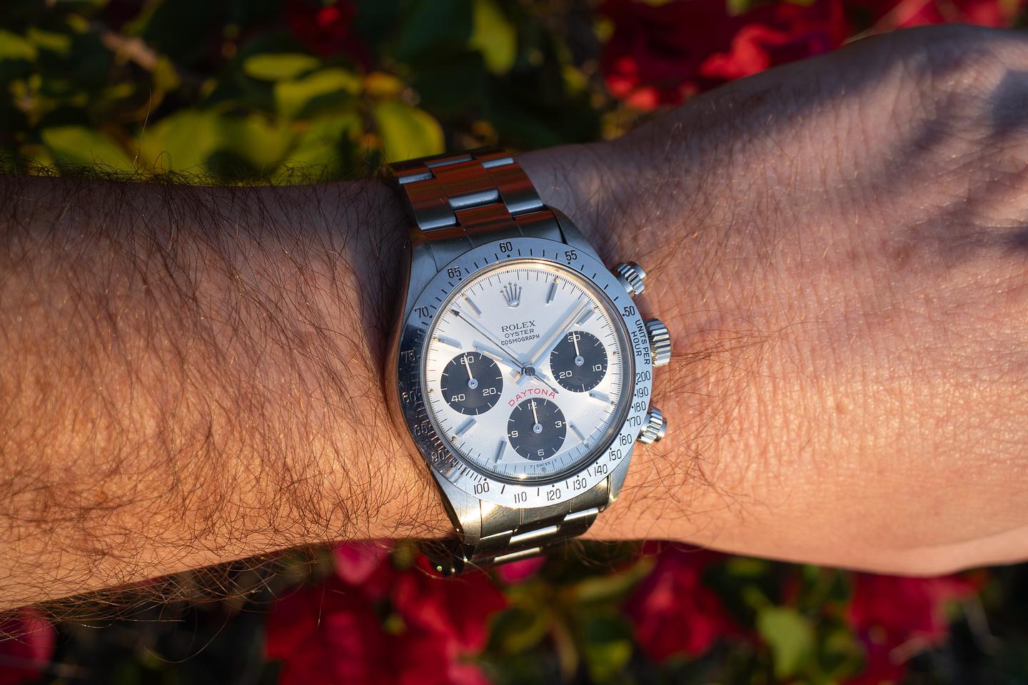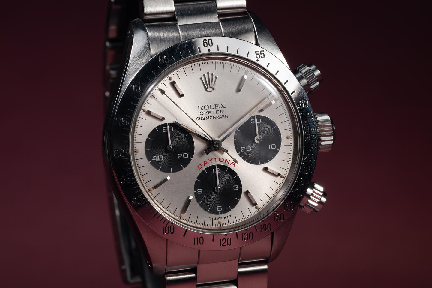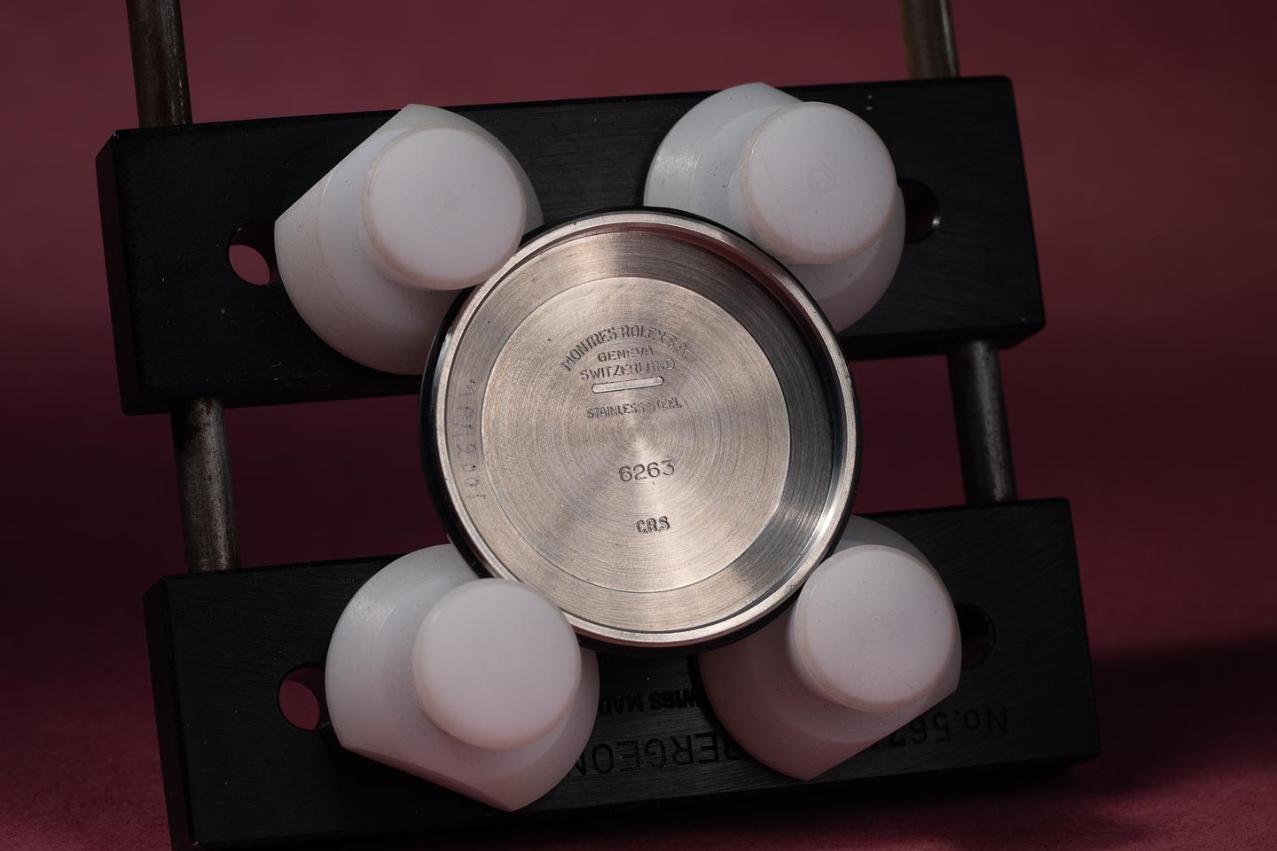 Dial: The silver "Big red" dial is excellent, showing only very light wear for its age. All lume plots are present and intact and have aged to a warm, creamy hue. The lume on the original factory hands matches perfectly. There is a tiny chip on the dial just next to the 10 index on the right subdial.