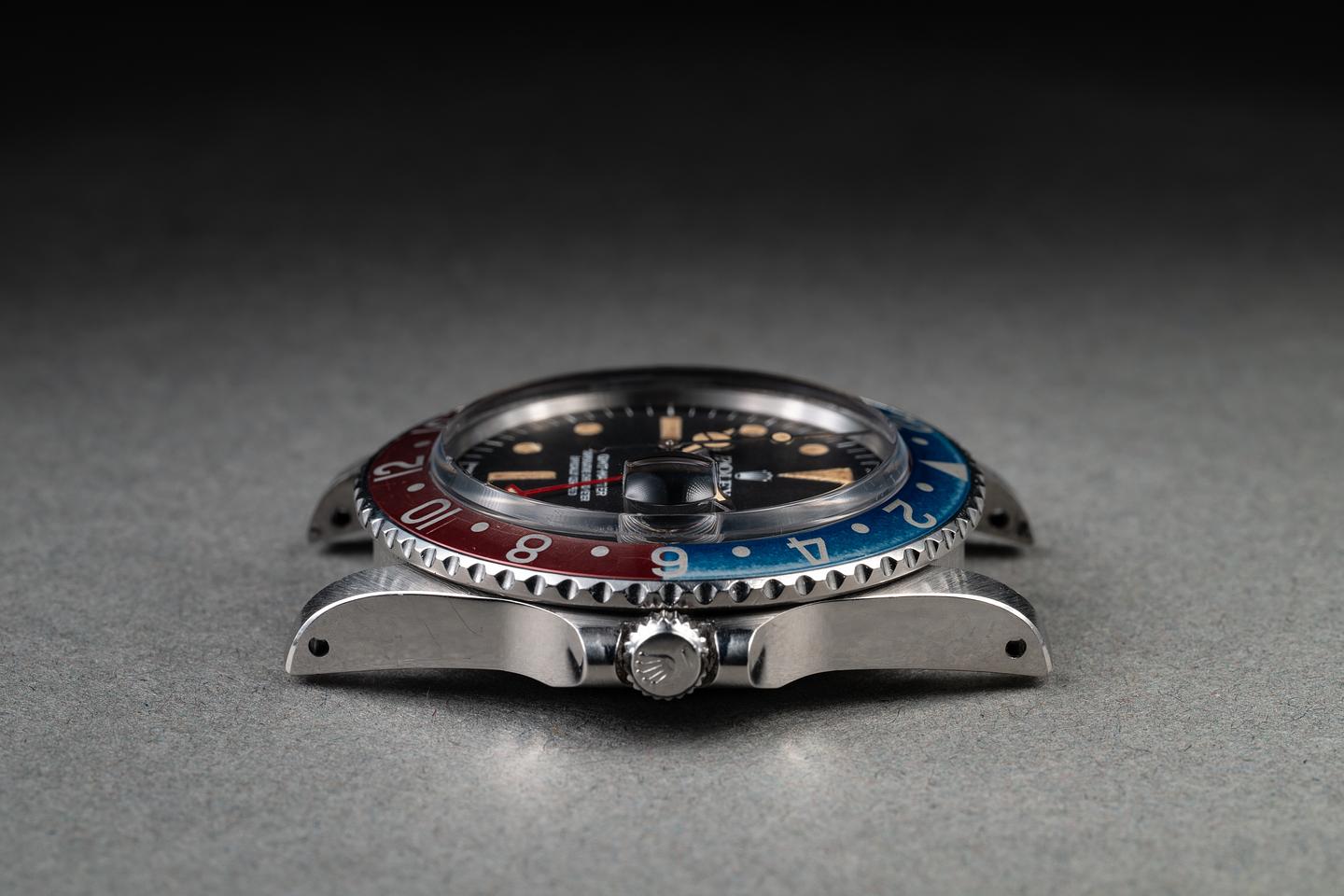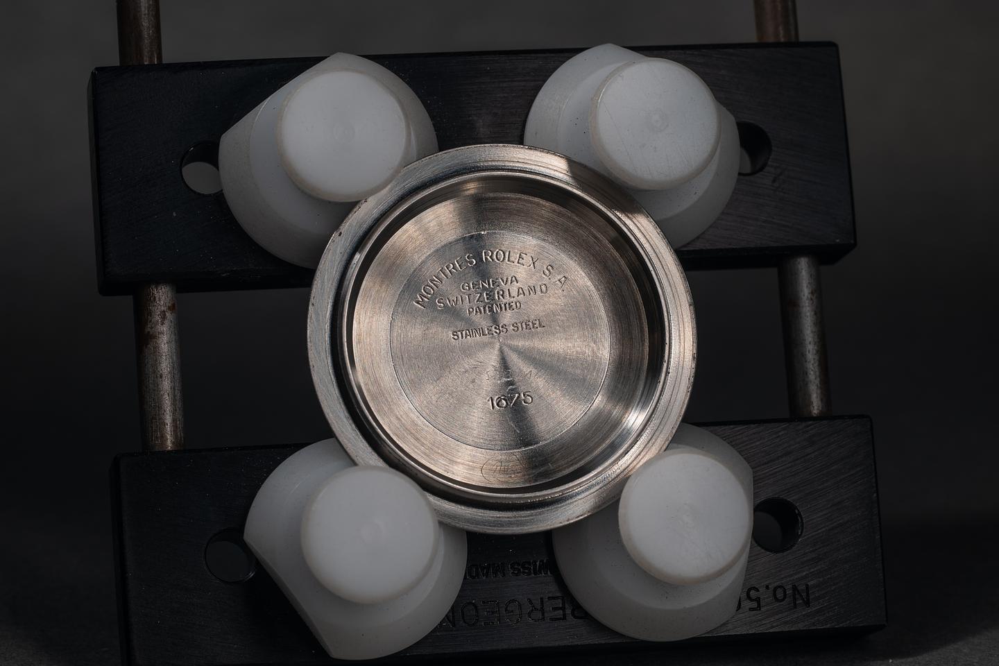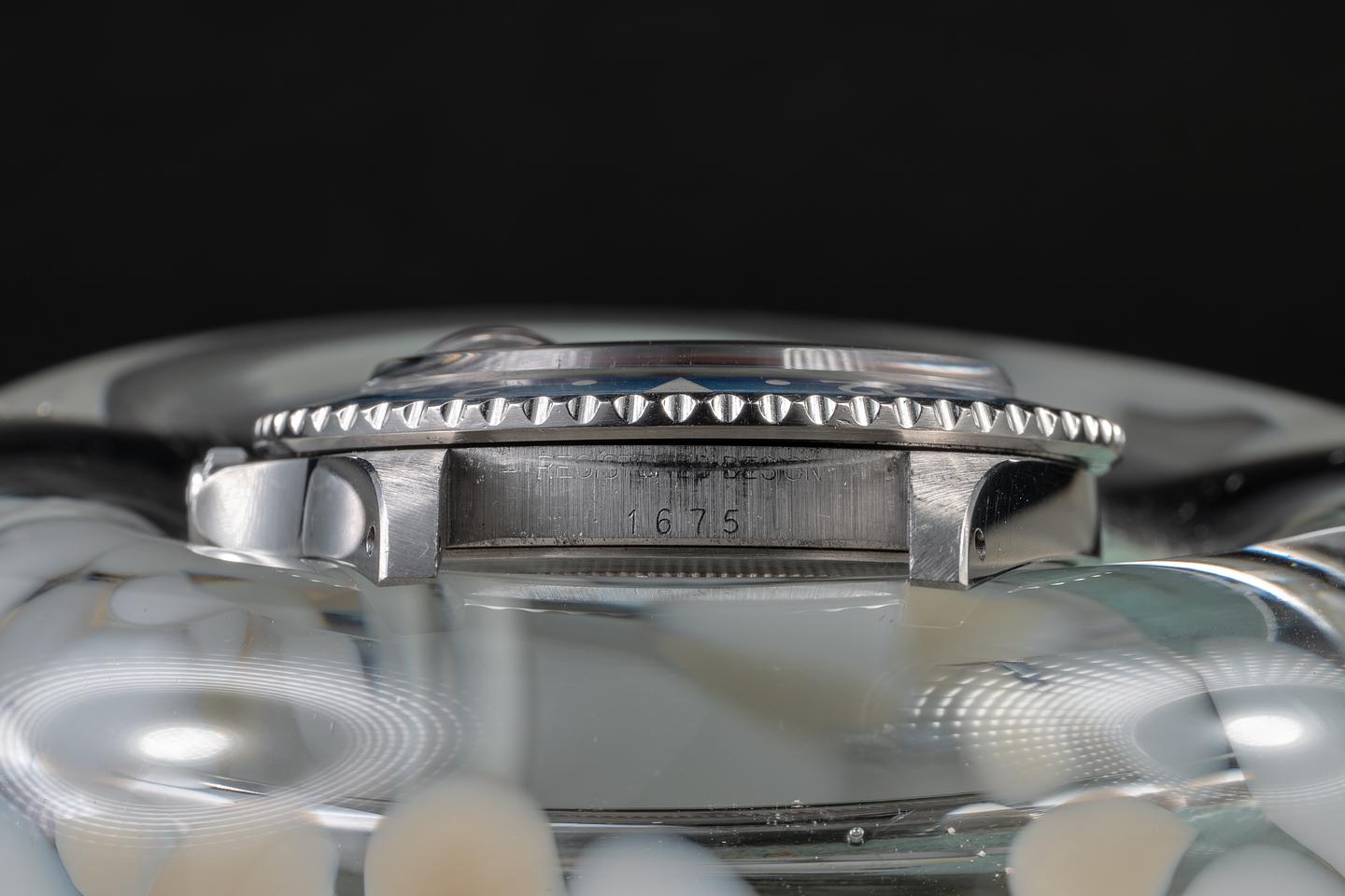 Case: The recently polished case is excellent, showing sharp, prominent bevels and only very light wear from use. The bezel insert is also in excellent condition, showing light fading to both portions of the insert.