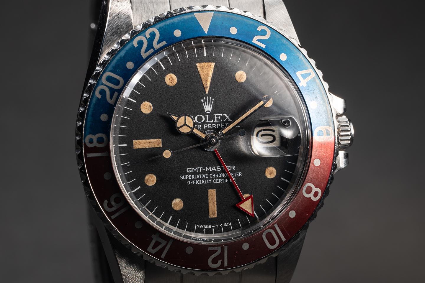 Dial: The matte black radial dial is excellent, showing some light wear from use. The lume has aged to a warm sandy hue, and the big red handset has been relumed and color-matched to the dial.