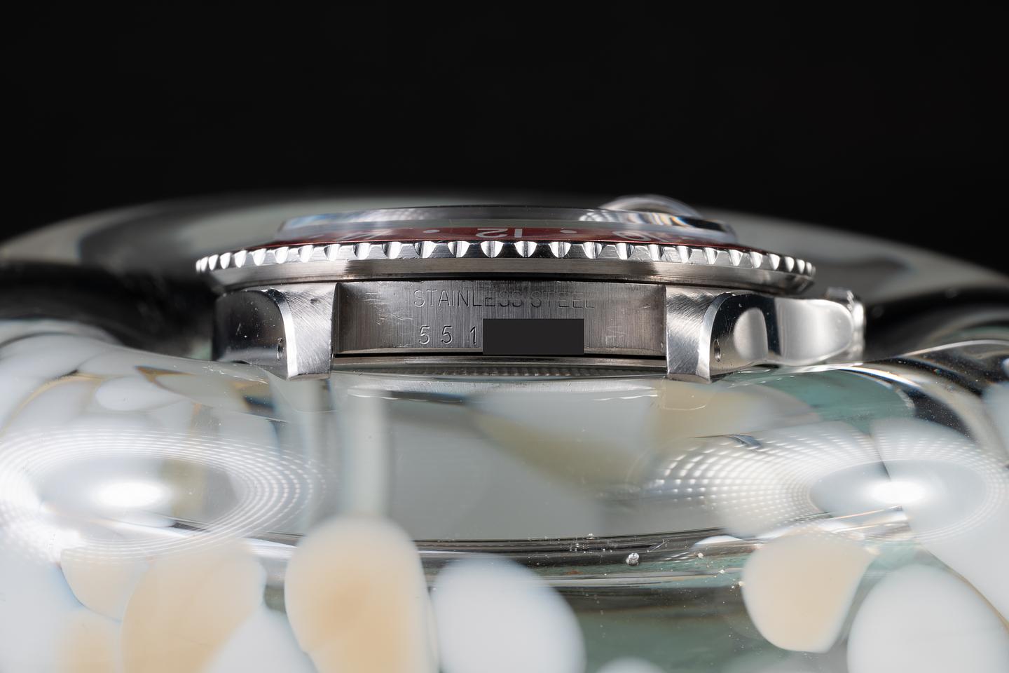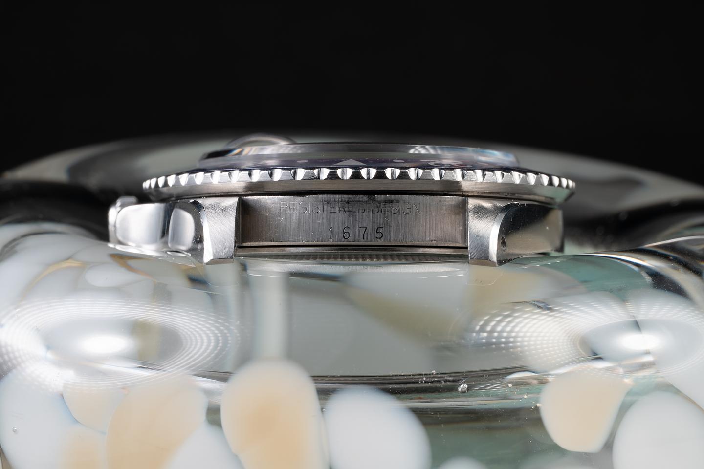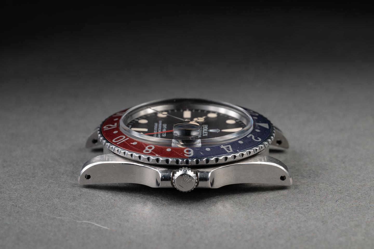 Case: The thick and even case has been polished in the past showing wide, sharp, prominent bevels and only light wear from use. The blue and red "Pepsi" bezel insert is excellent showing a light and even fade across both portions of the insert.