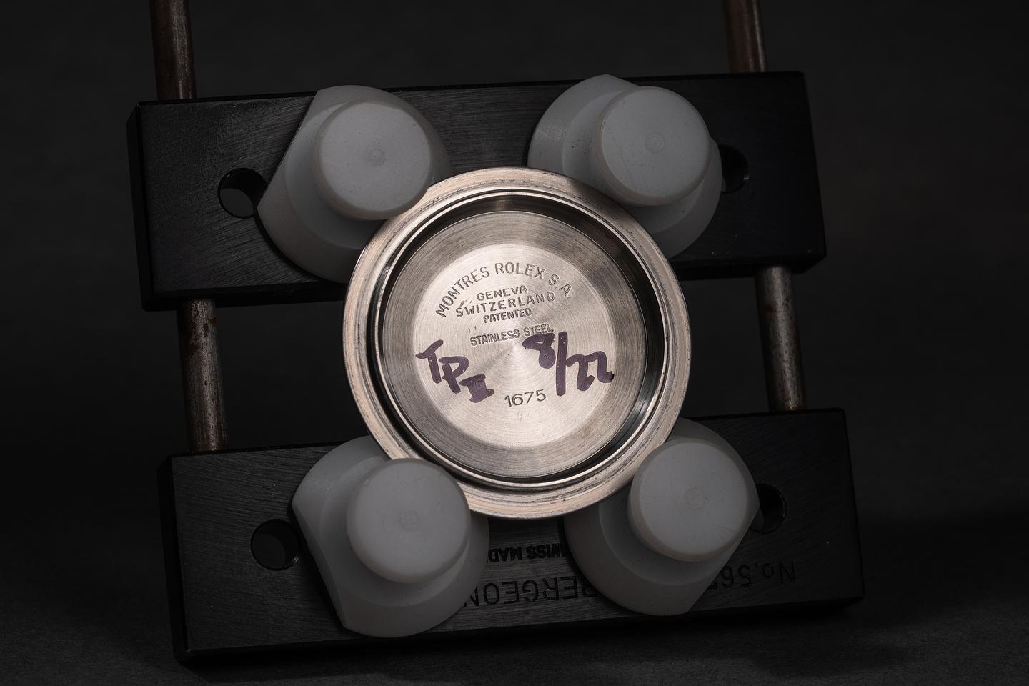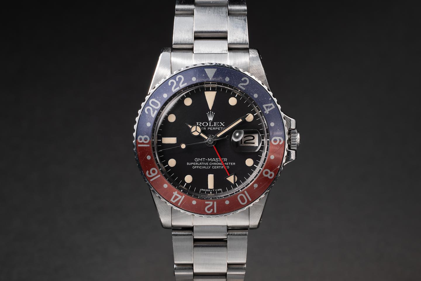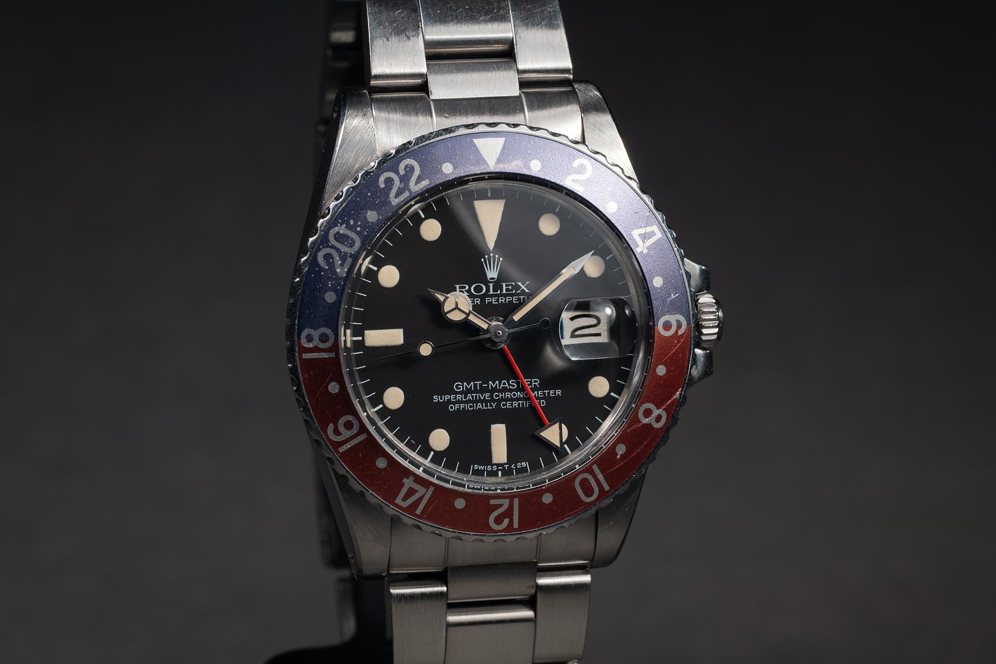 Case: The thick and even case has been polished in the past showing wide, sharp, prominent bevels and only light wear from use. The blue and red "Pepsi" bezel insert is excellent showing a light and even fade across both portions of the insert.